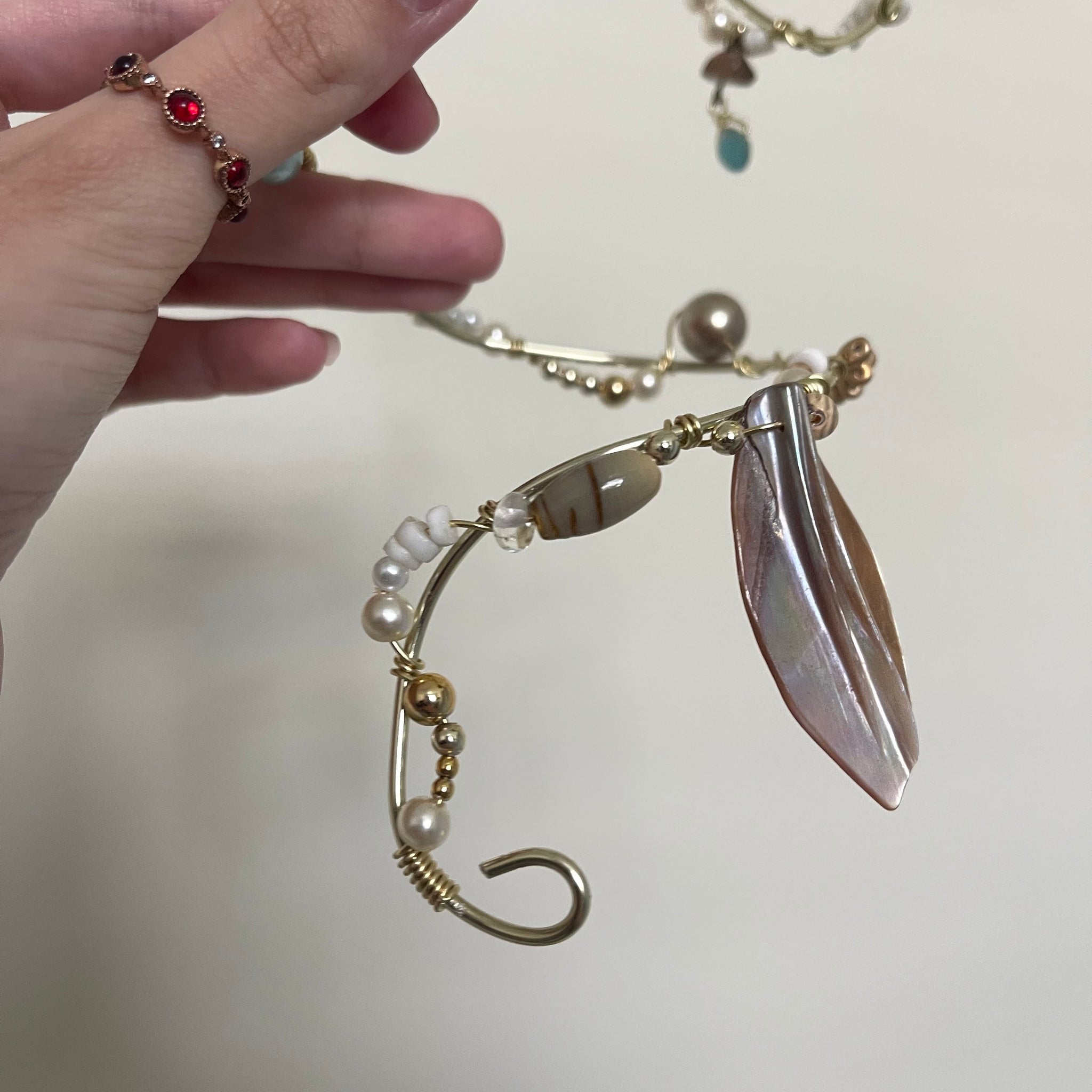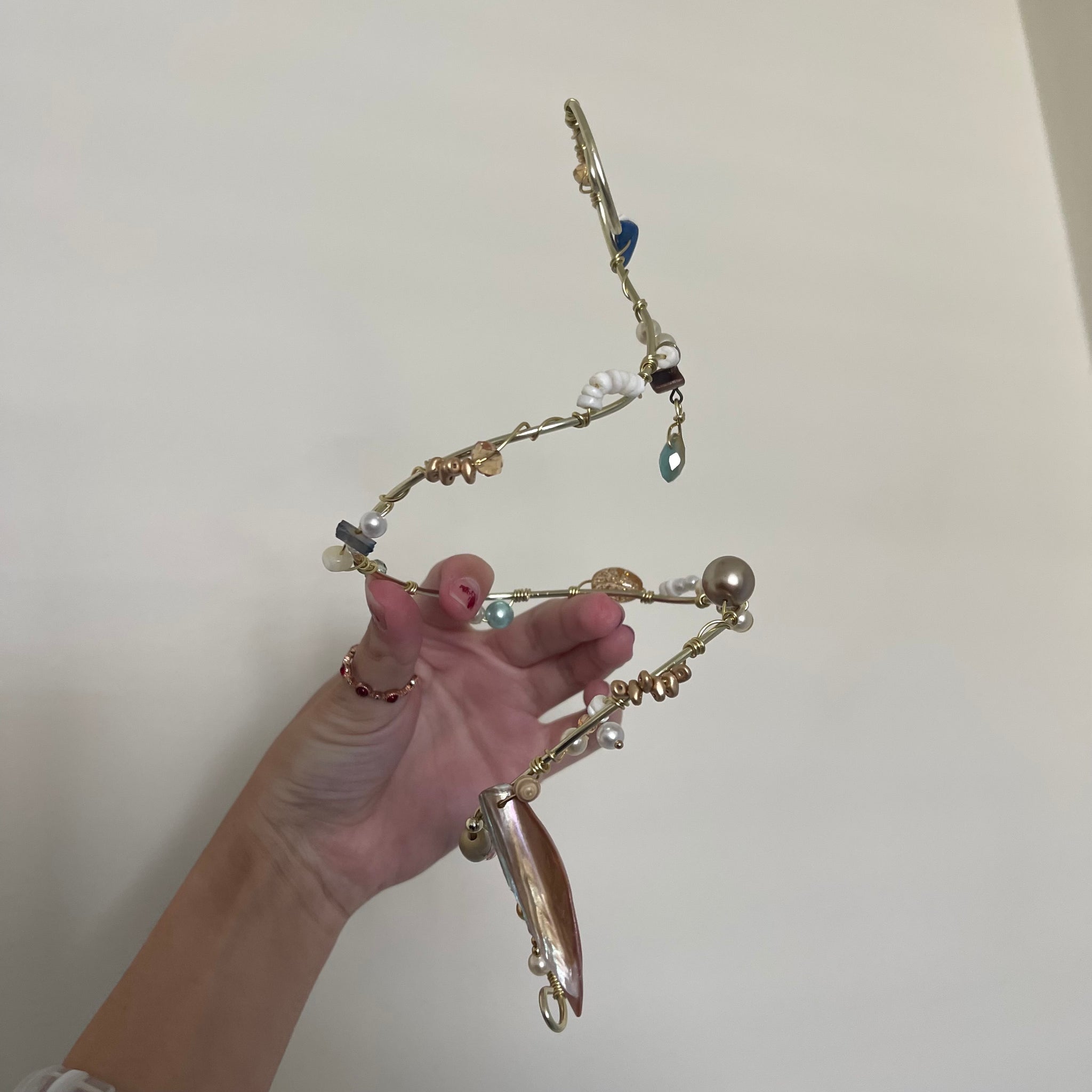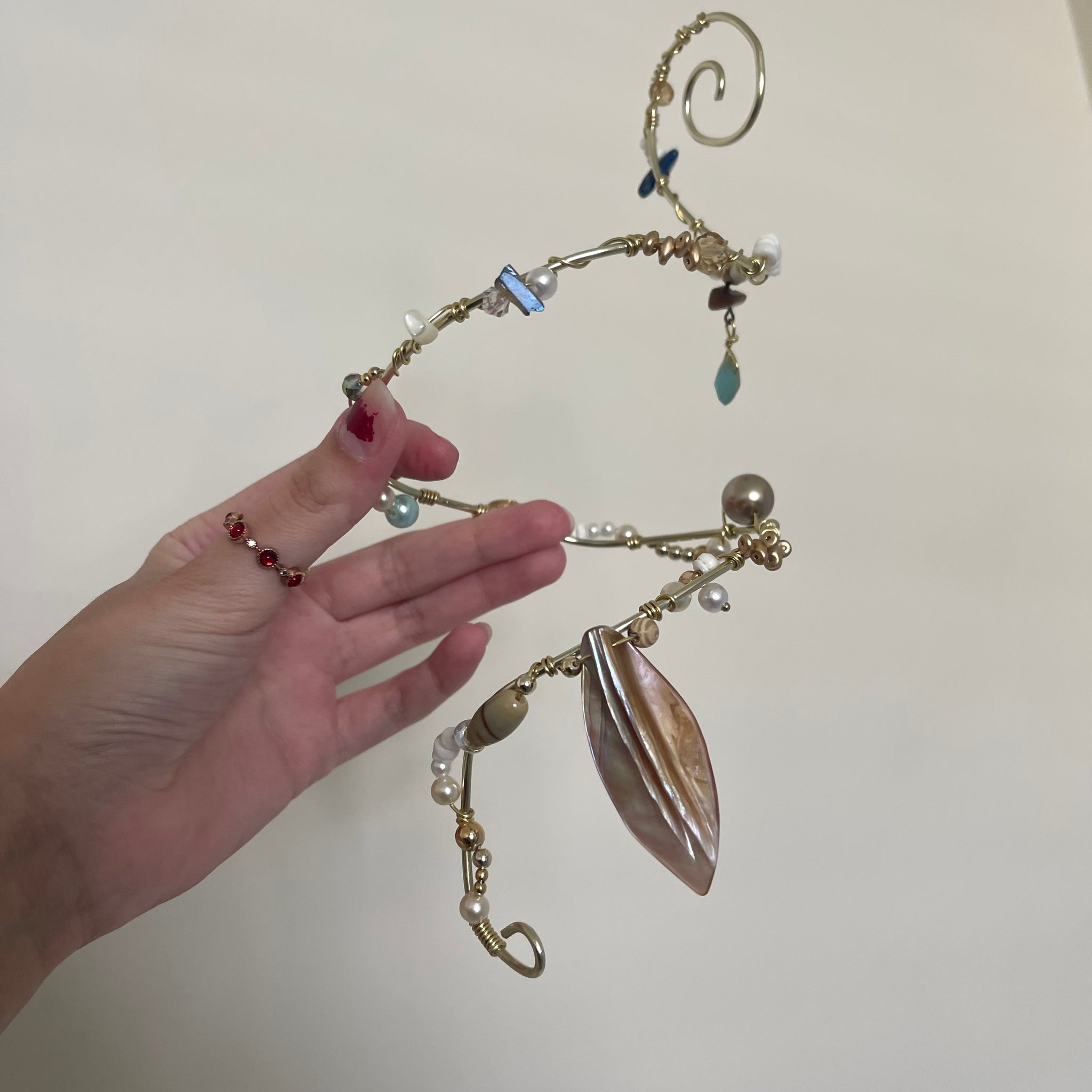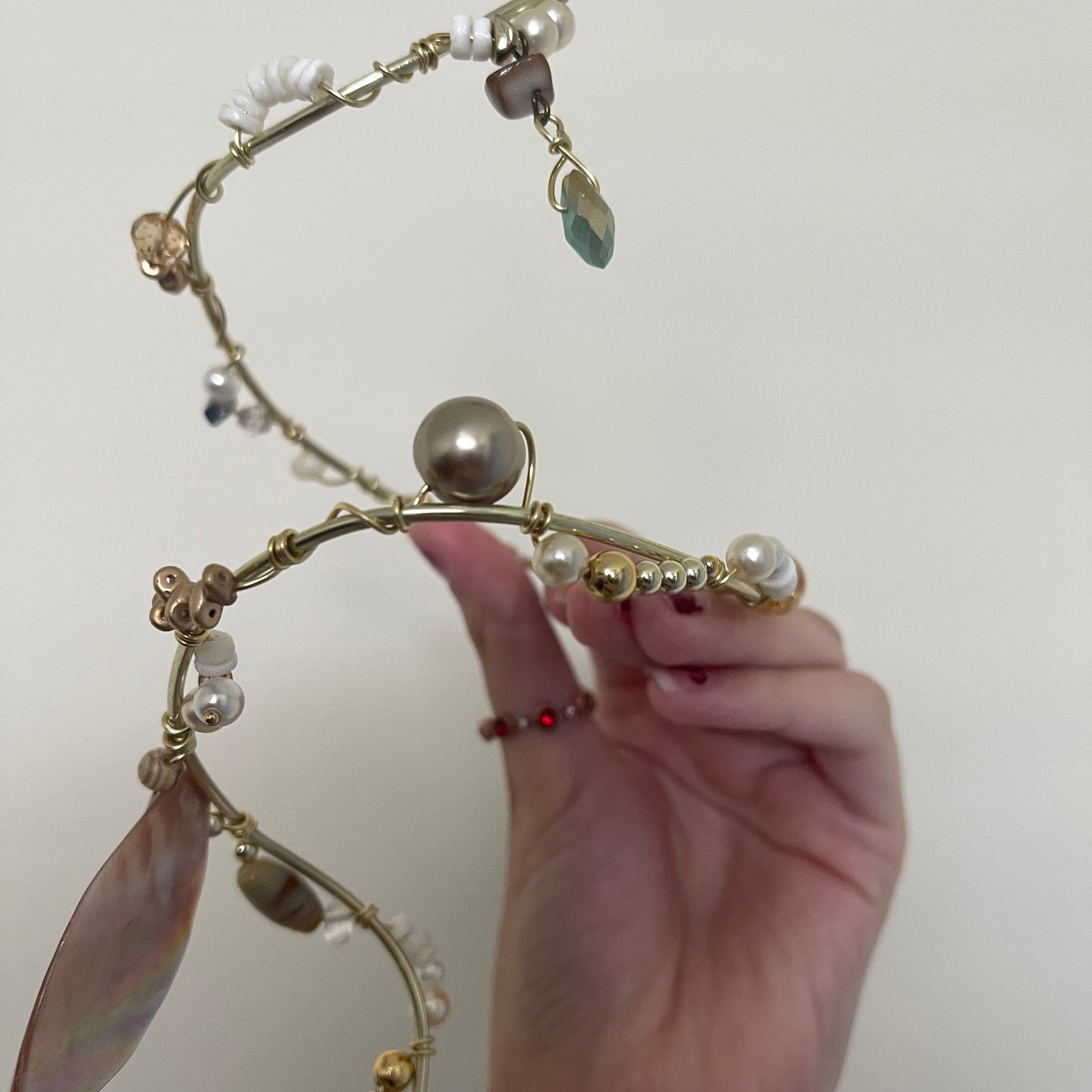 Made with: Shells, Aluminum, Glass, Blue Lapis, Lampwork glass and clear quartz.