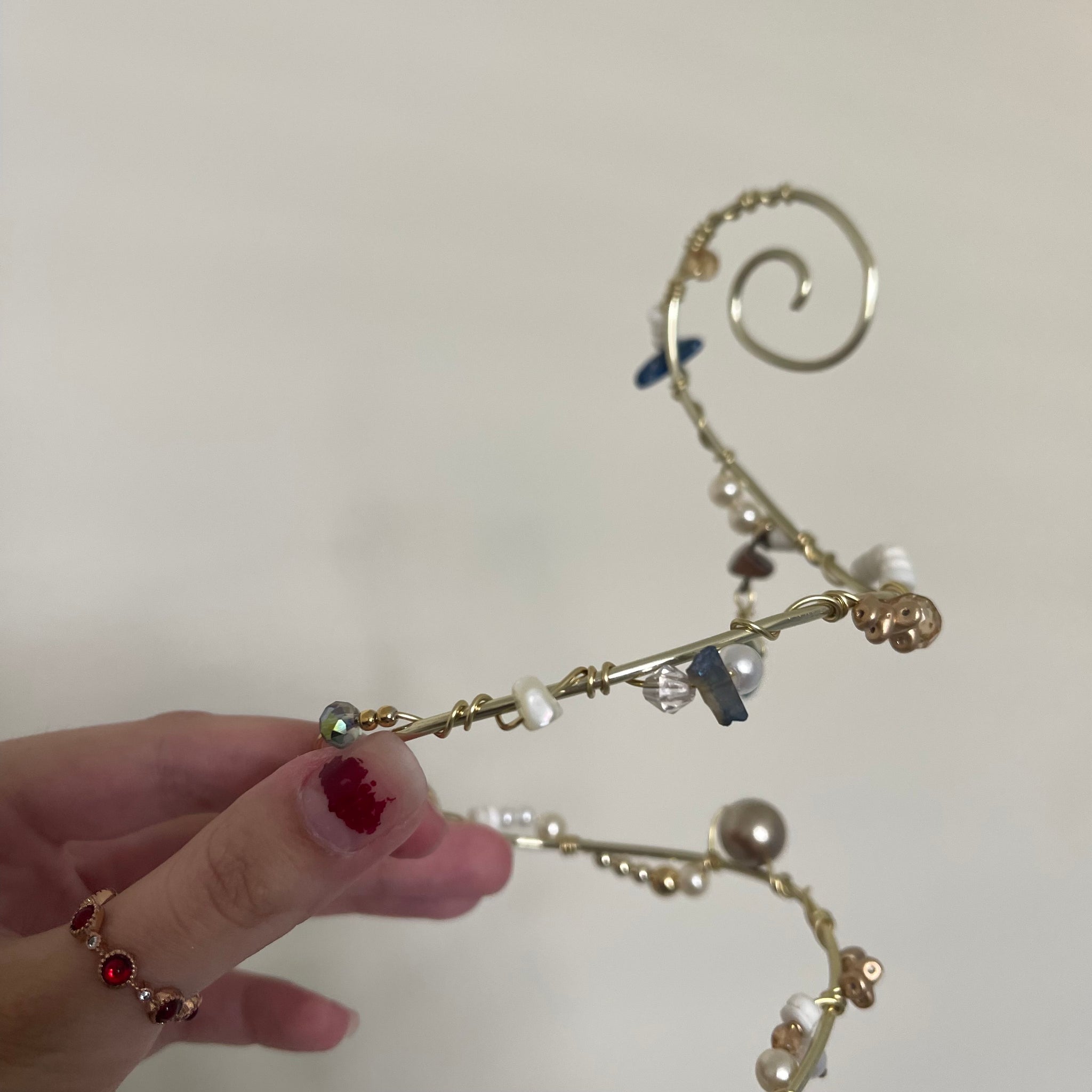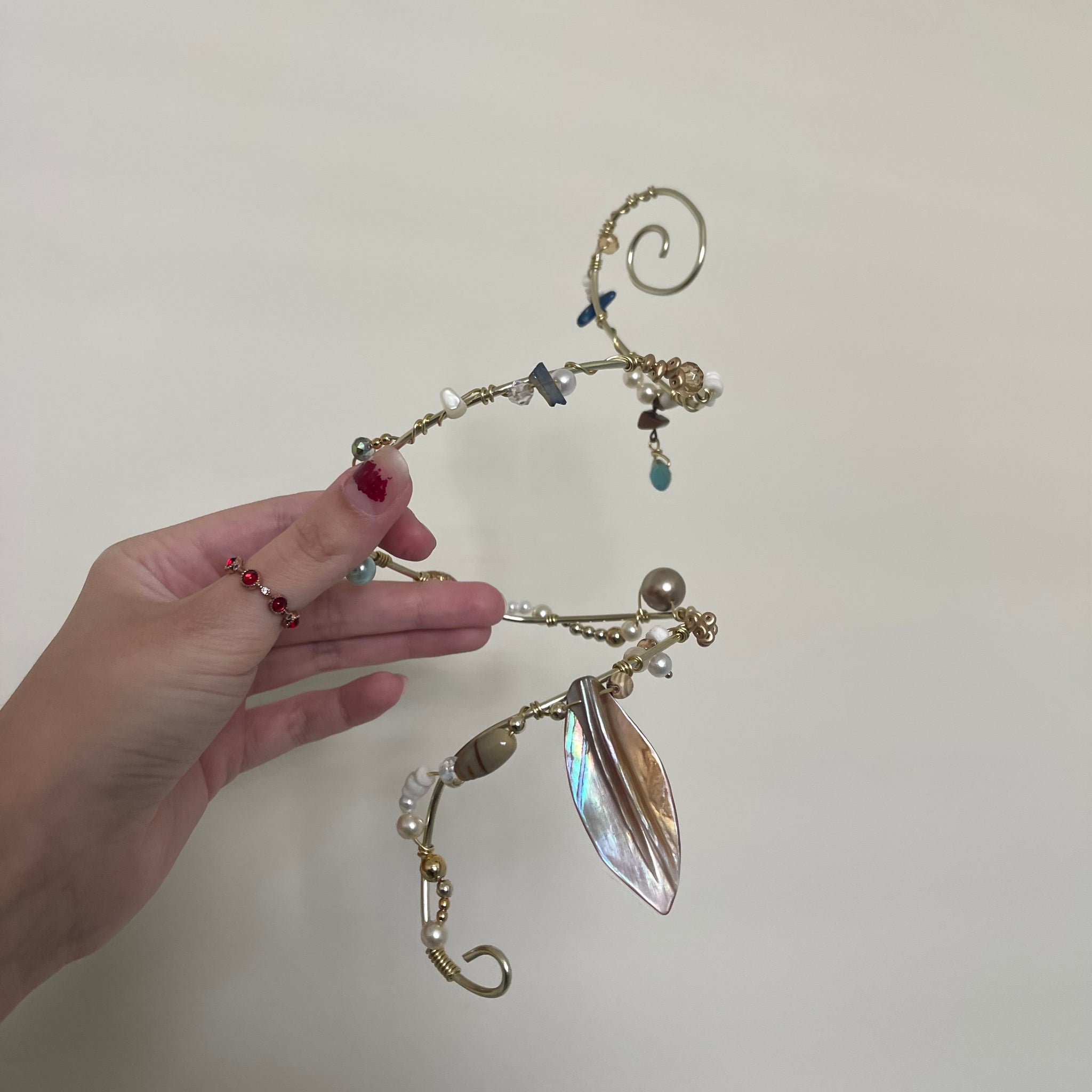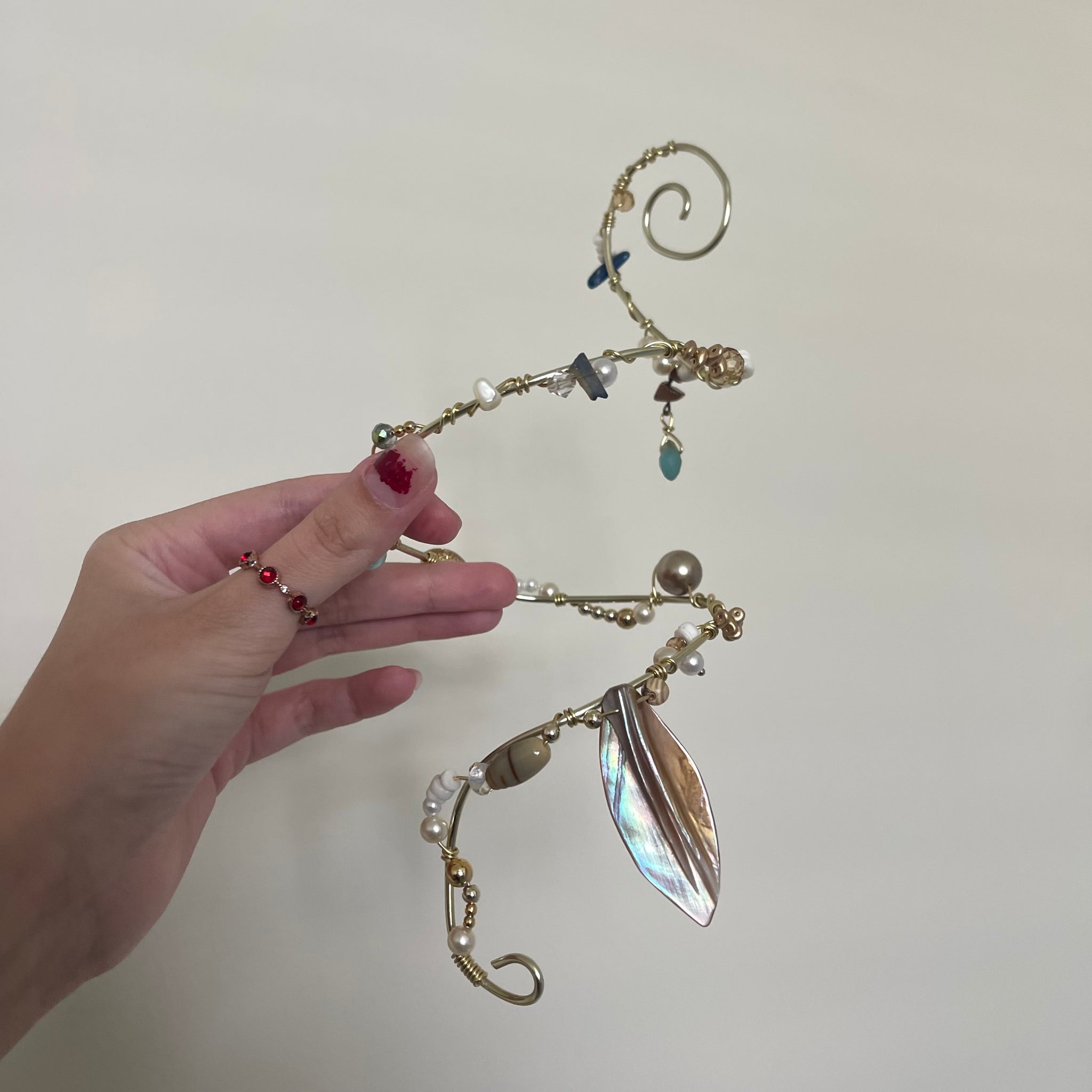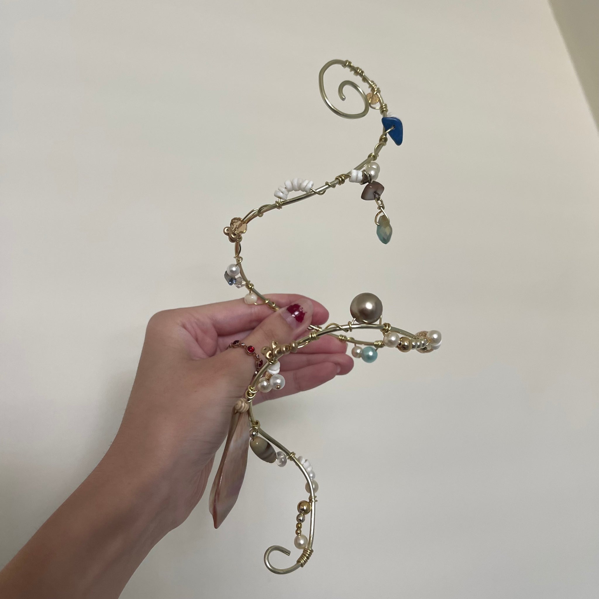 Made with: Shells, Aluminum, Glass, Blue Lapis, Lampwork glass and clear quartz.