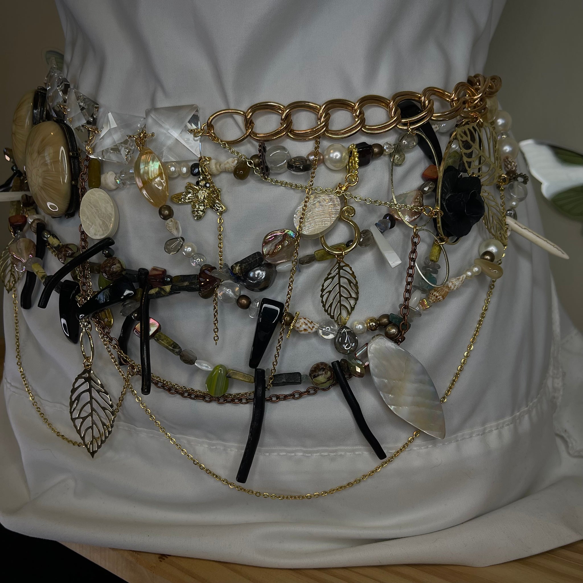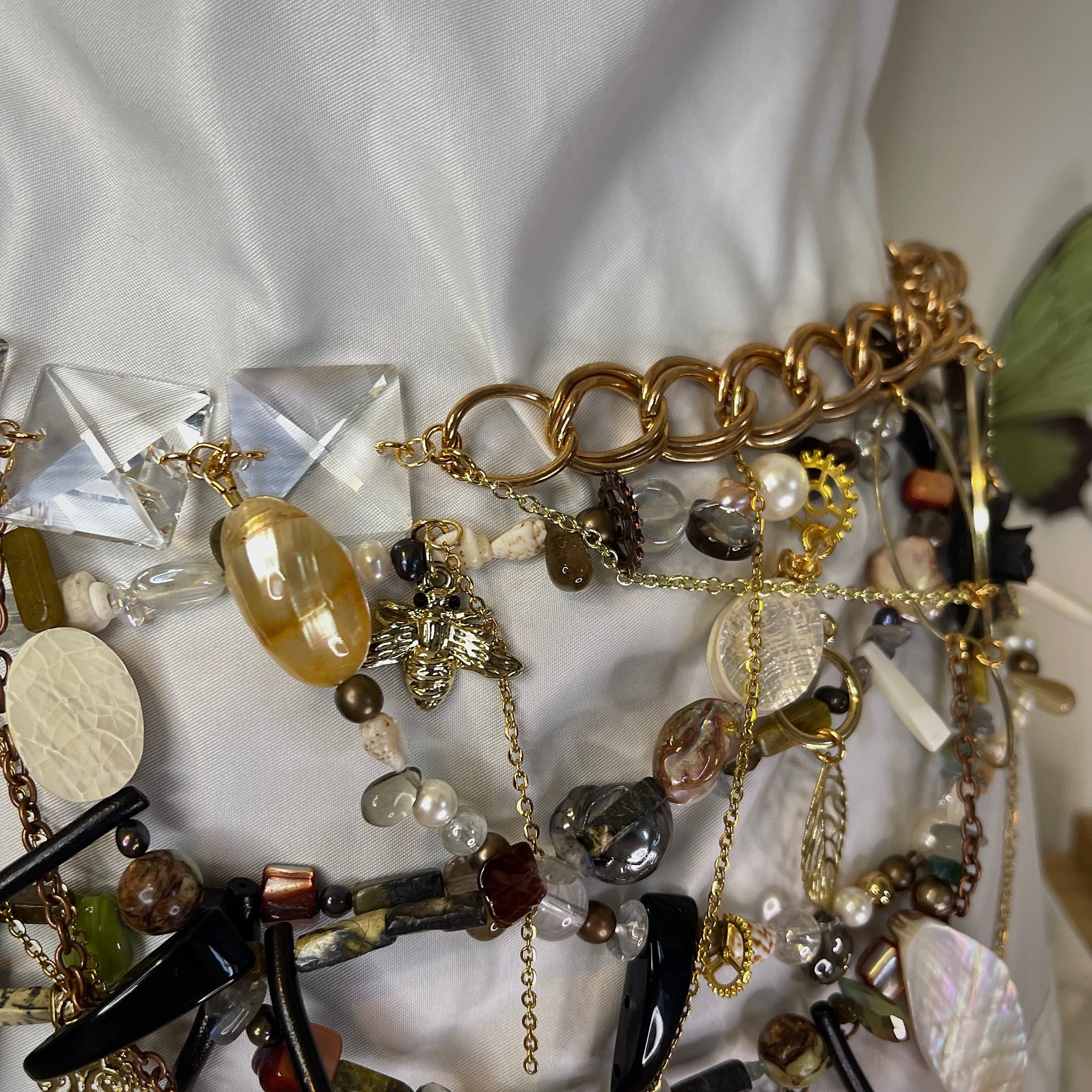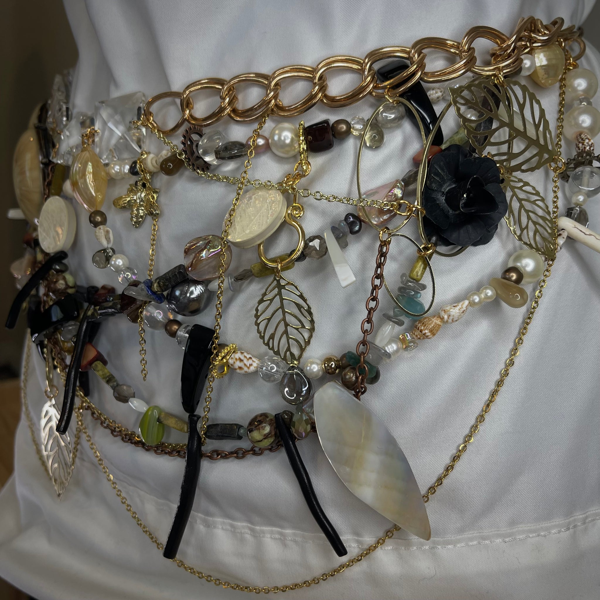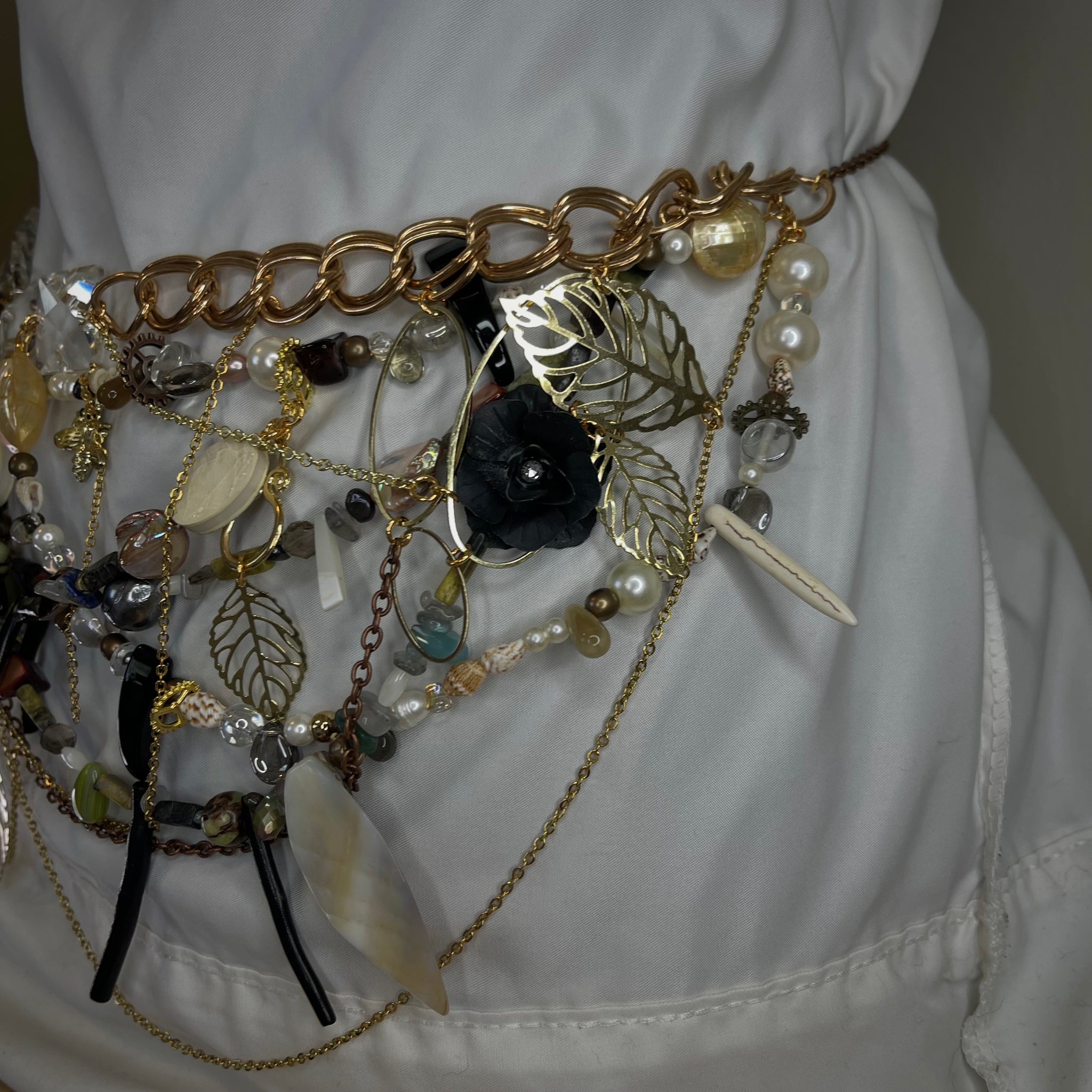 Made with: Magnetite, Smokey Quartz, Shell, Glass, Freshwater Pearls, Tiger charms, Flower charm, Rustic charm, Czech glass, Labradorite, Opal, Clear Quartz, Daggers, Stainless steel, Mother of pearl and antique charms.