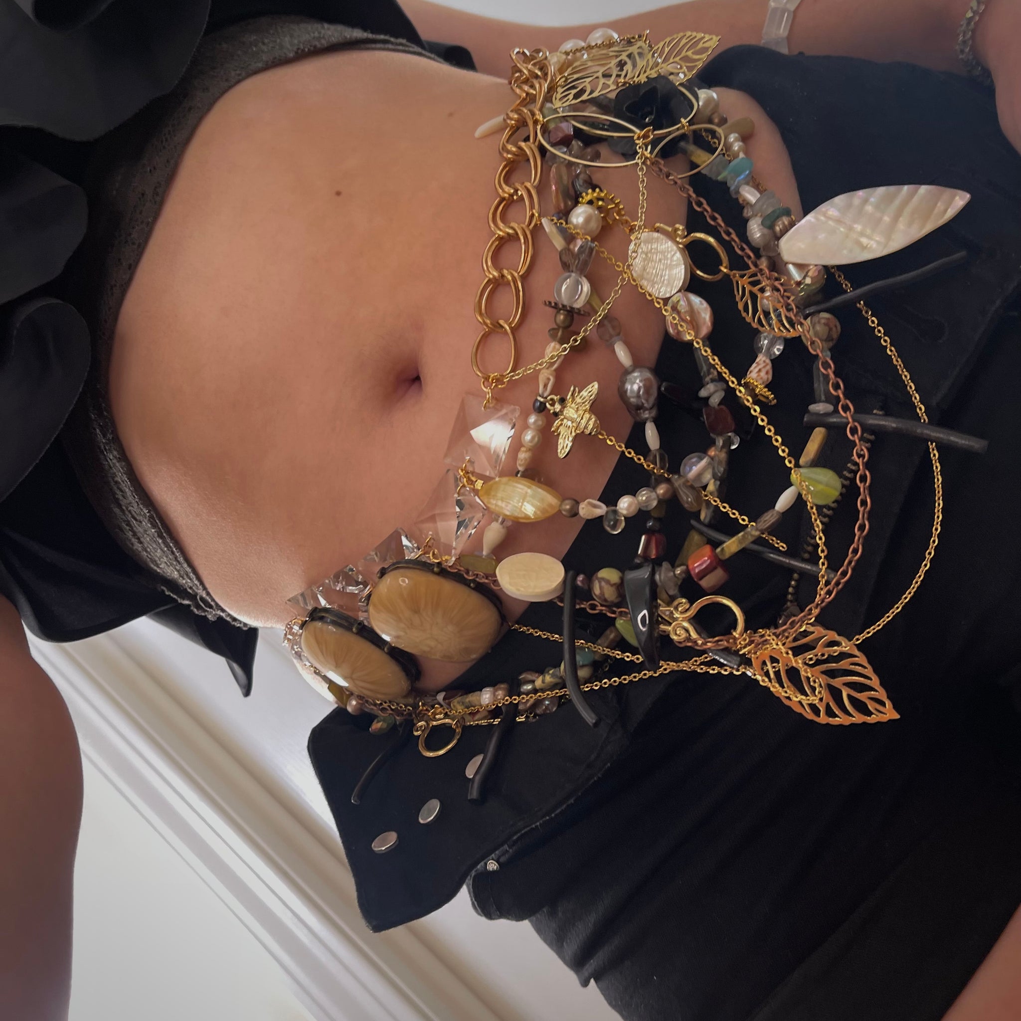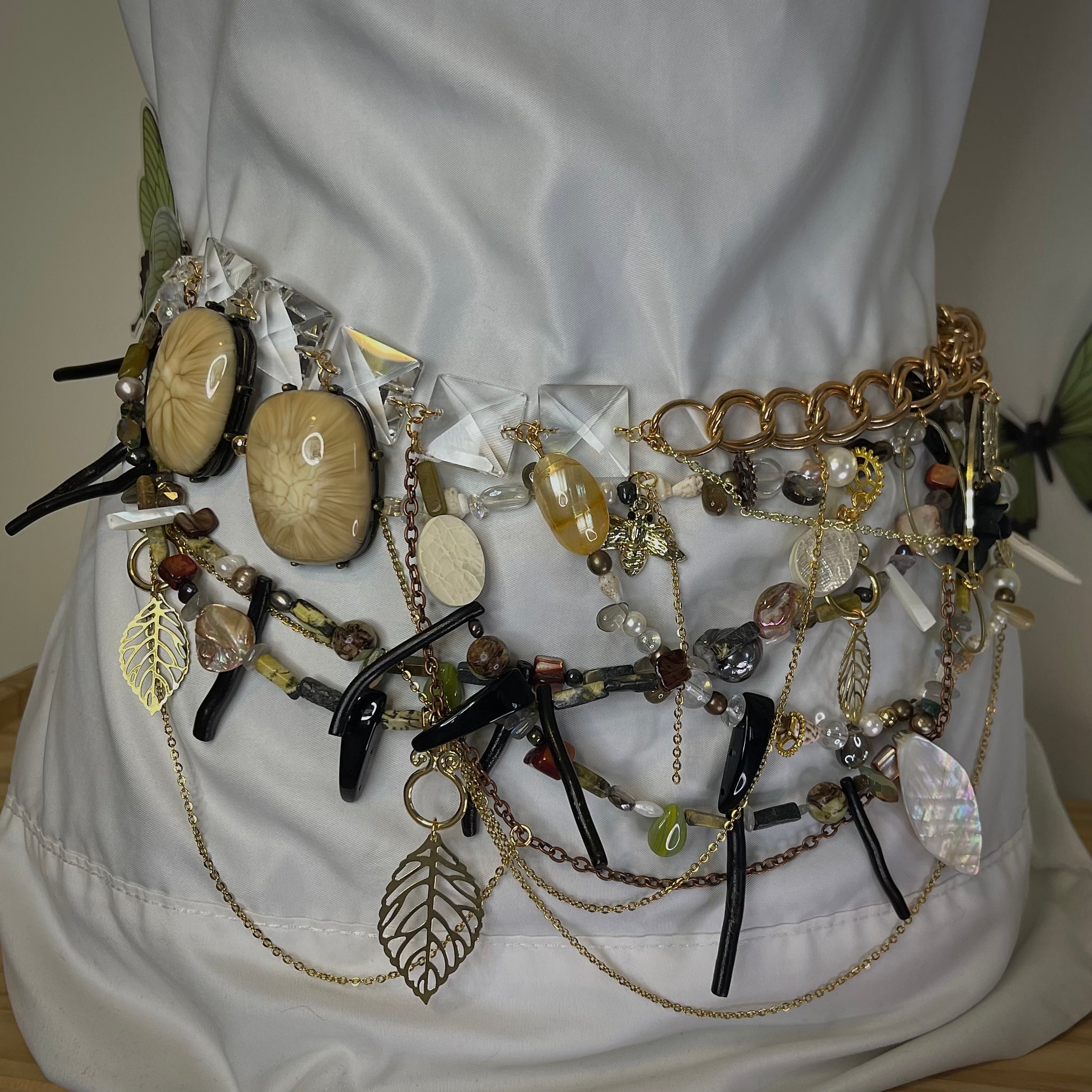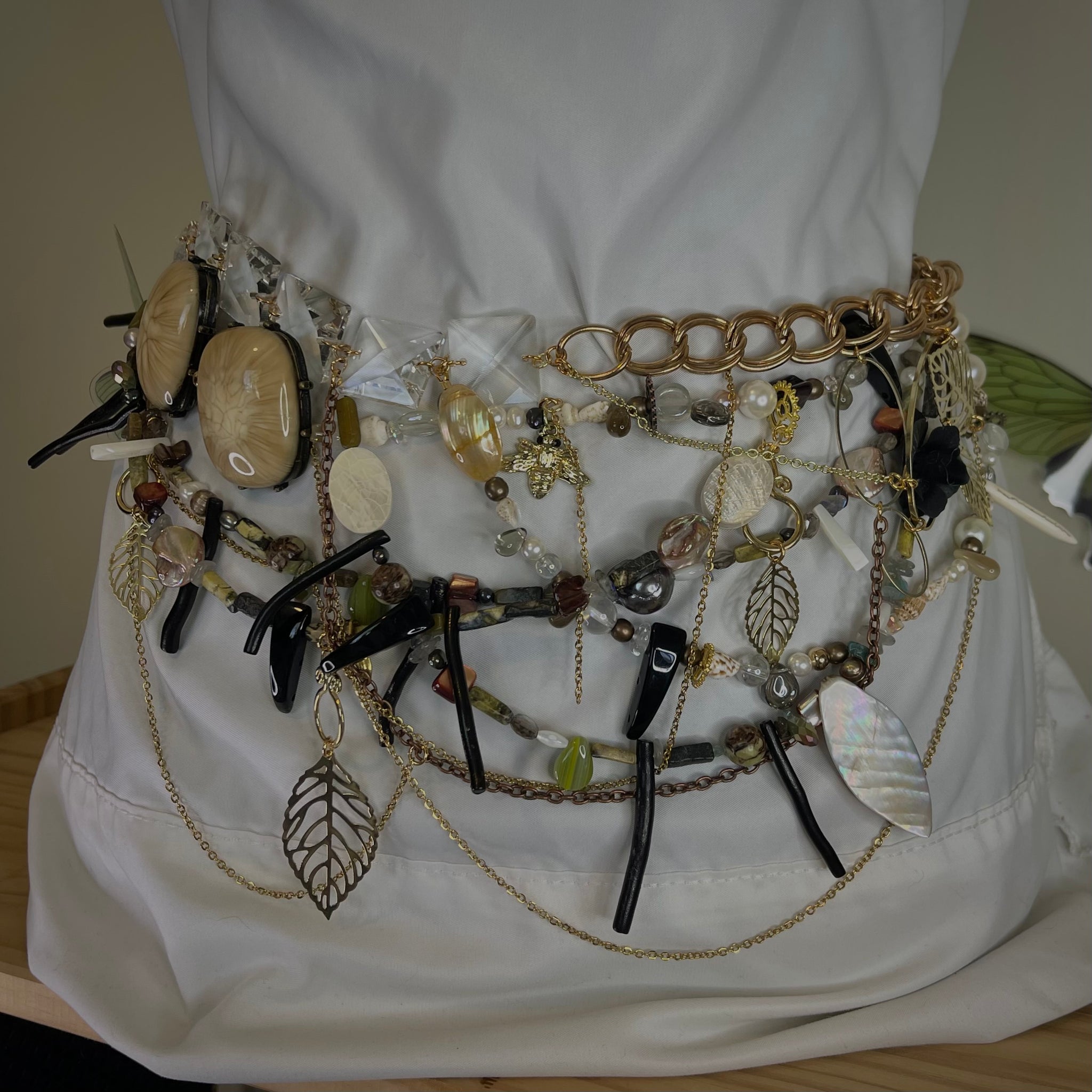 Made with: Magnetite, Smokey Quartz, Shell, Glass, Freshwater Pearls, Tiger charms, Flower charm, Rustic charm, Czech glass, Labradorite, Opal, Clear Quartz, Daggers, Stainless steel, Mother of pearl and antique charms.
