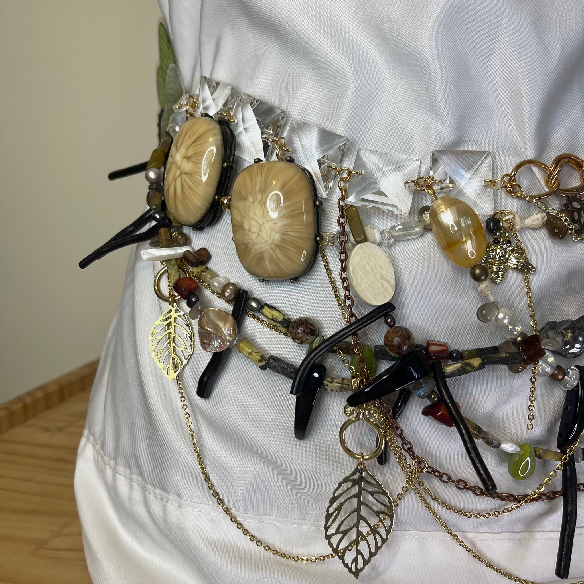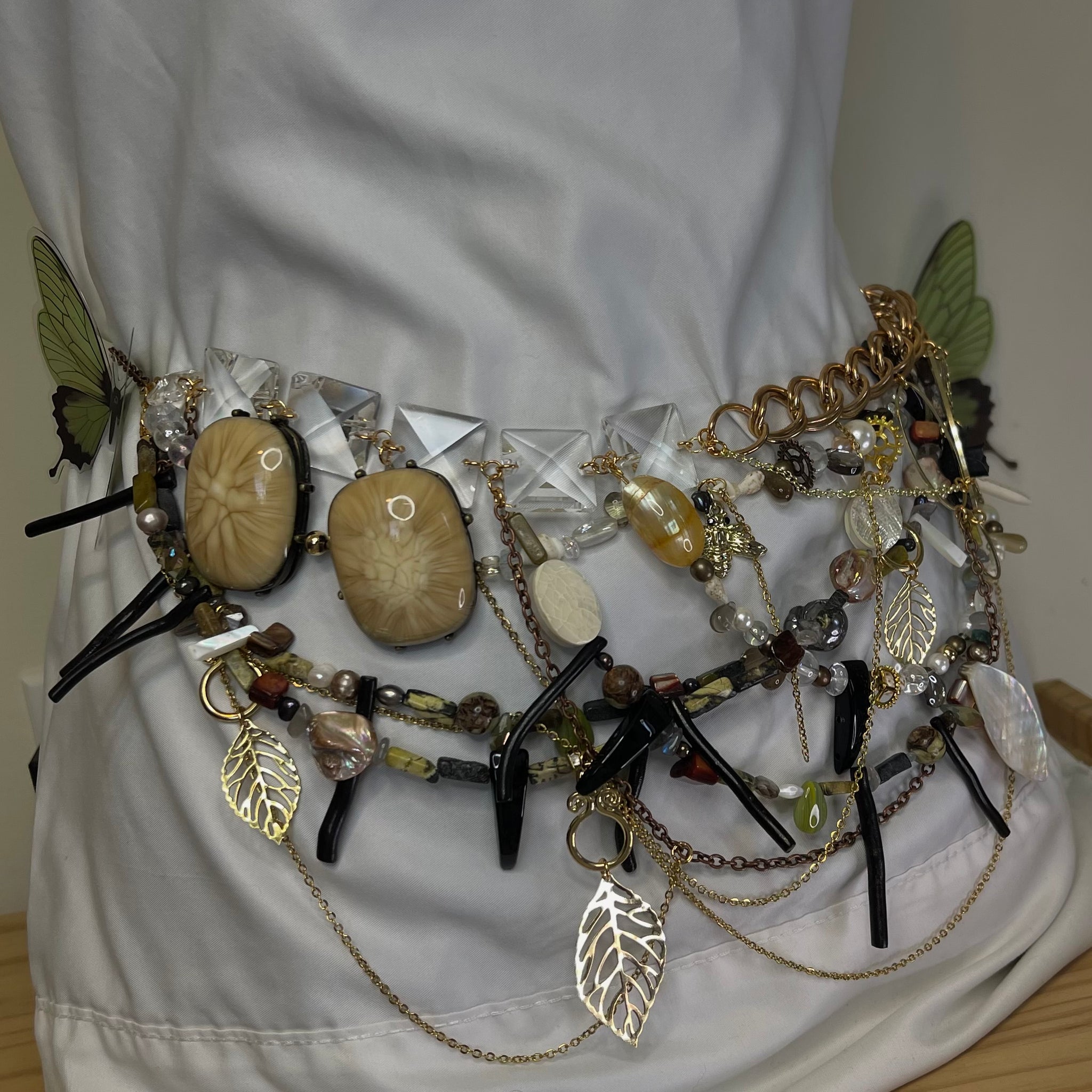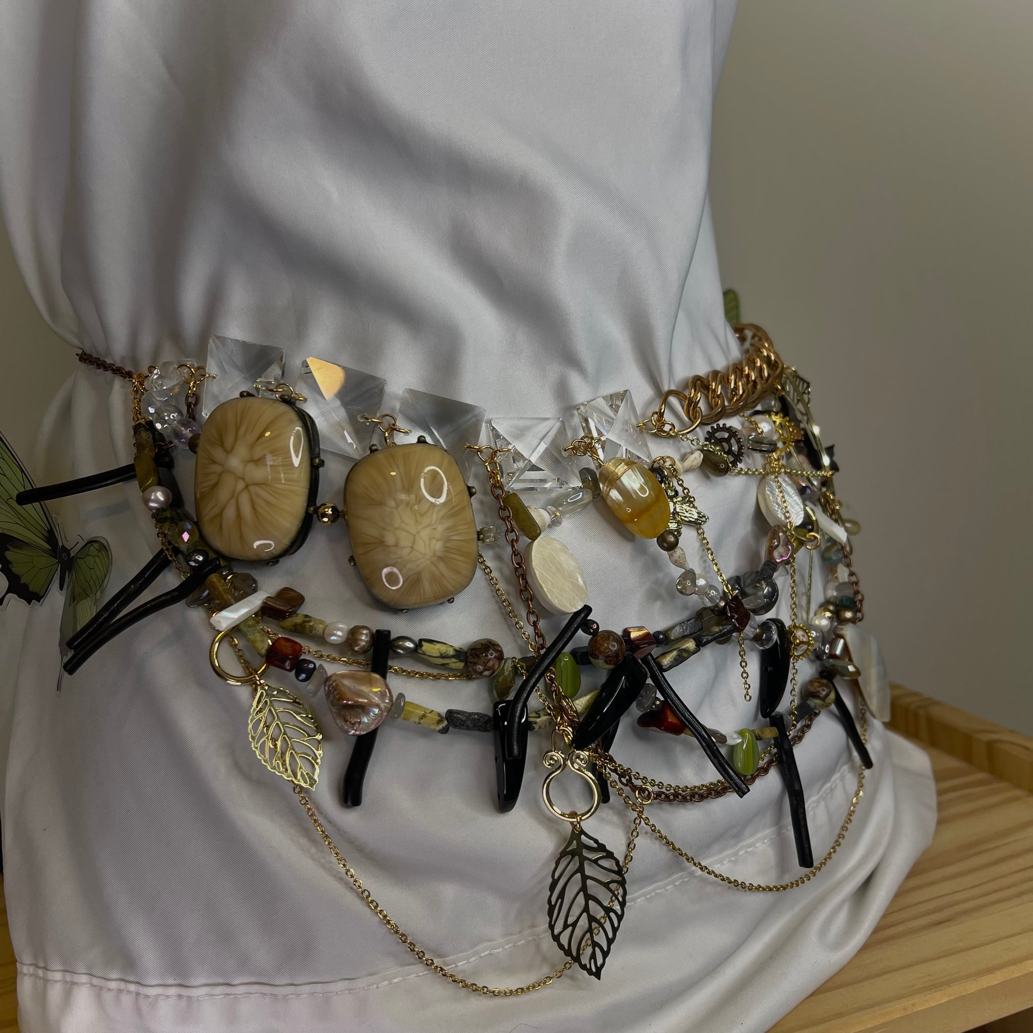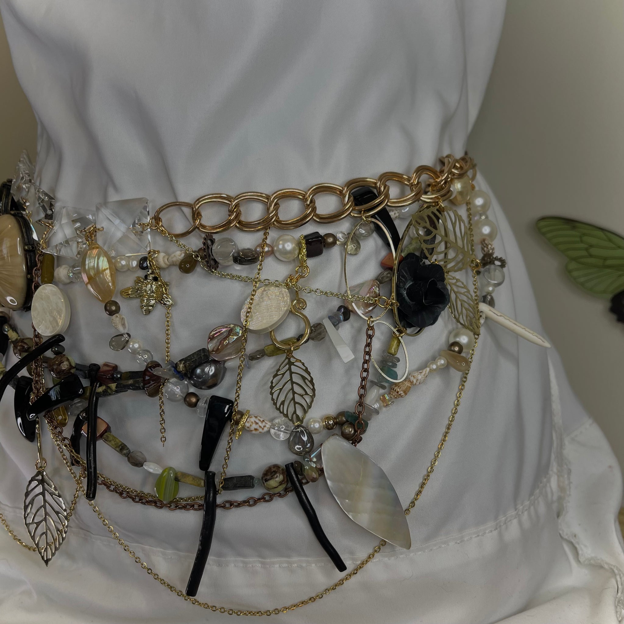 Made with: Magnetite, Smokey Quartz, Shell, Glass, Freshwater Pearls, Tiger charms, Flower charm, Rustic charm, Czech glass, Labradorite, Opal, Clear Quartz, Daggers, Stainless steel, Mother of pearl and antique charms.