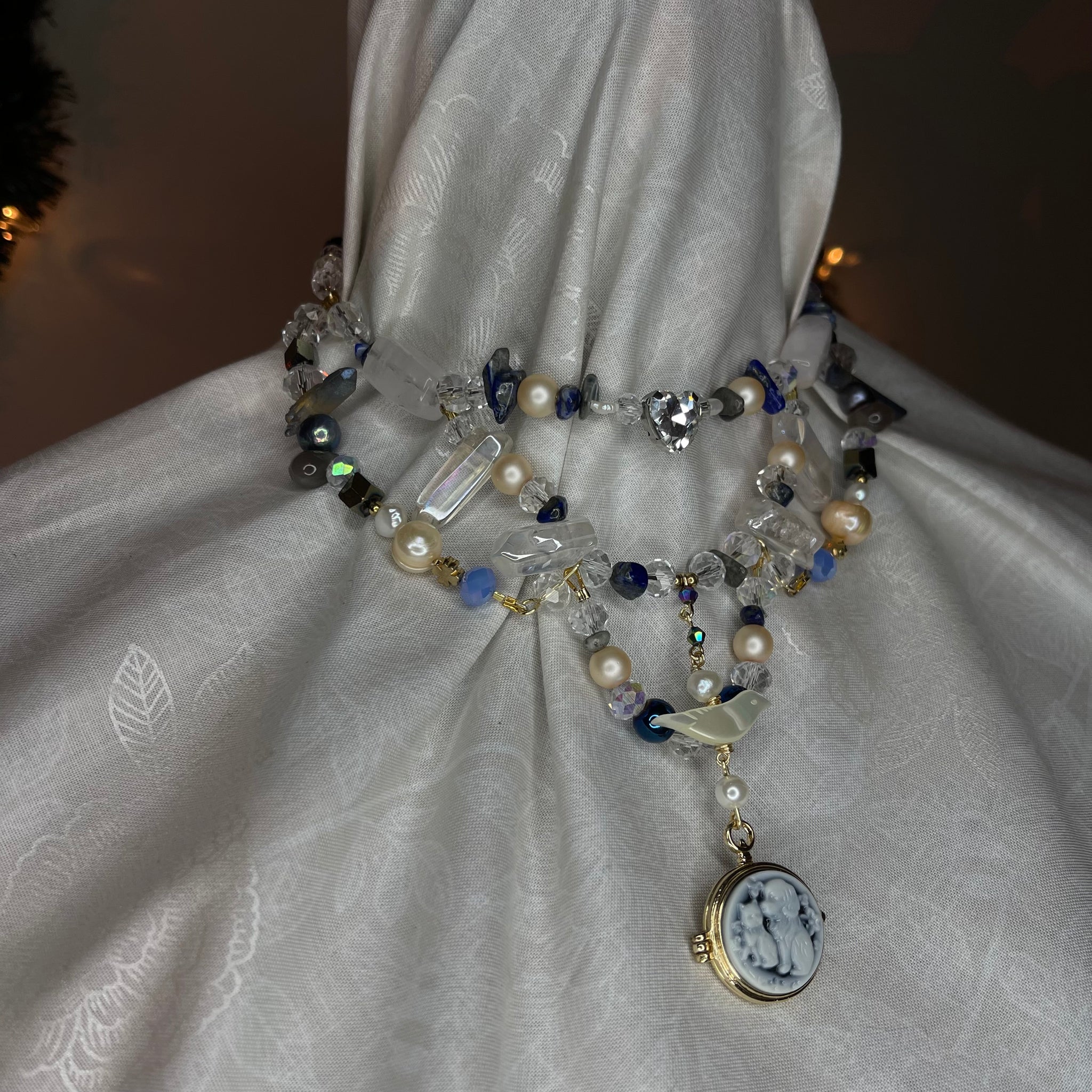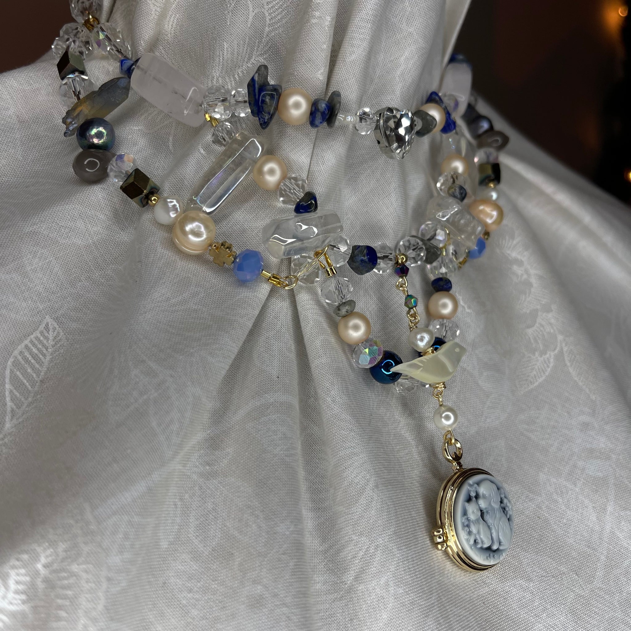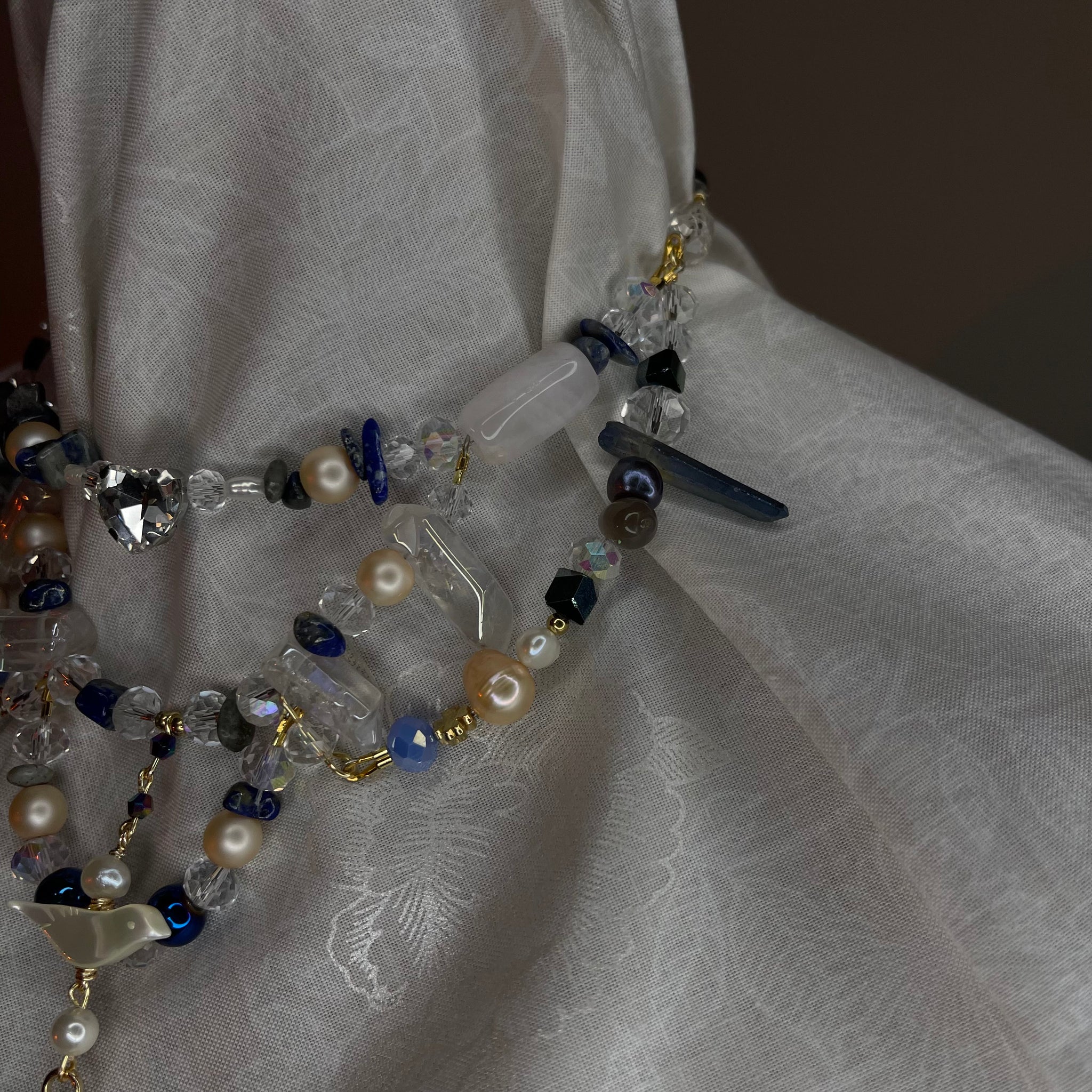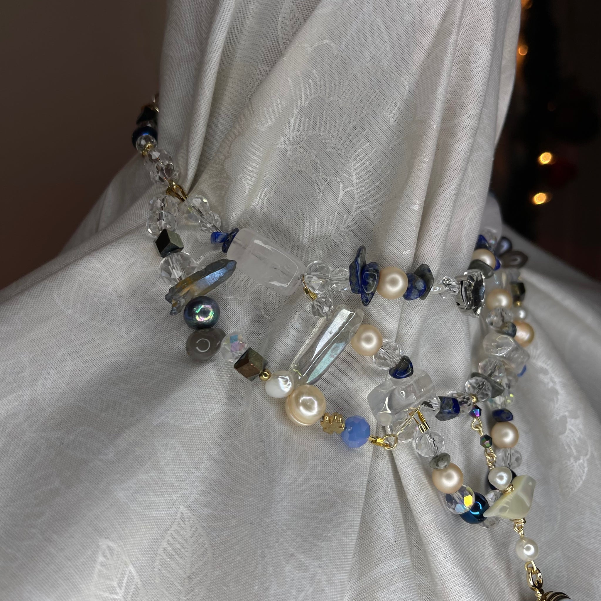 Made with: Freshwater pearls, Labradorite, Glass, Clear Quartz, Moonstone, Blue Lapiz, Cloudy Quartz and mother of pearl