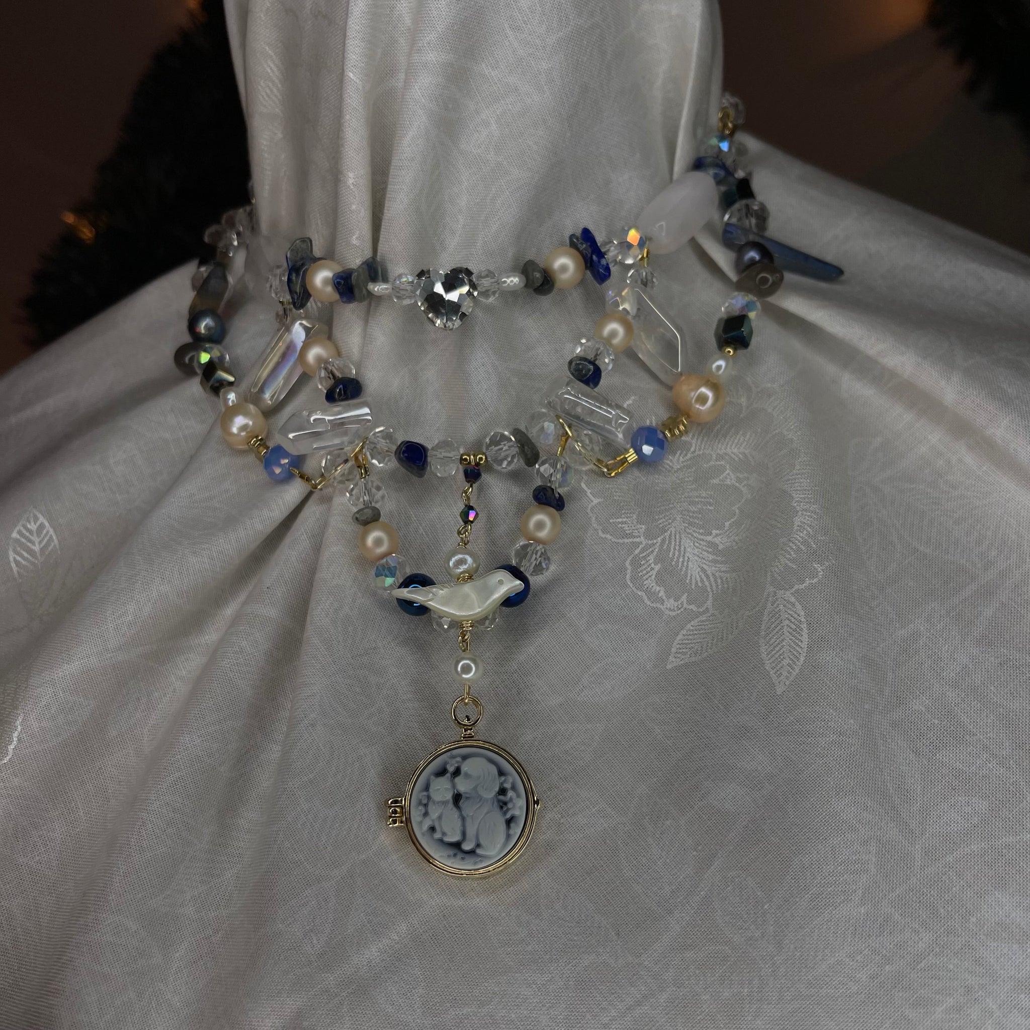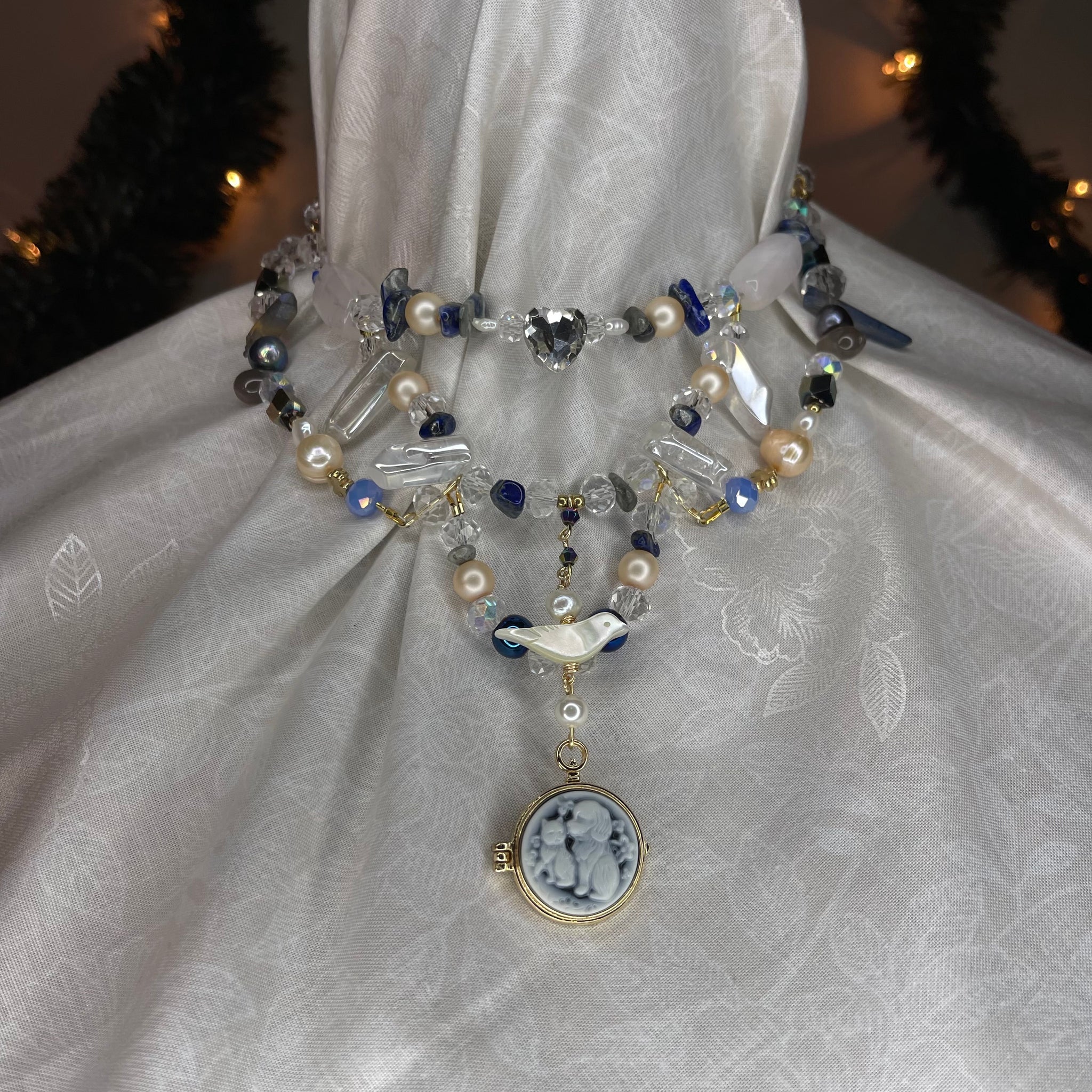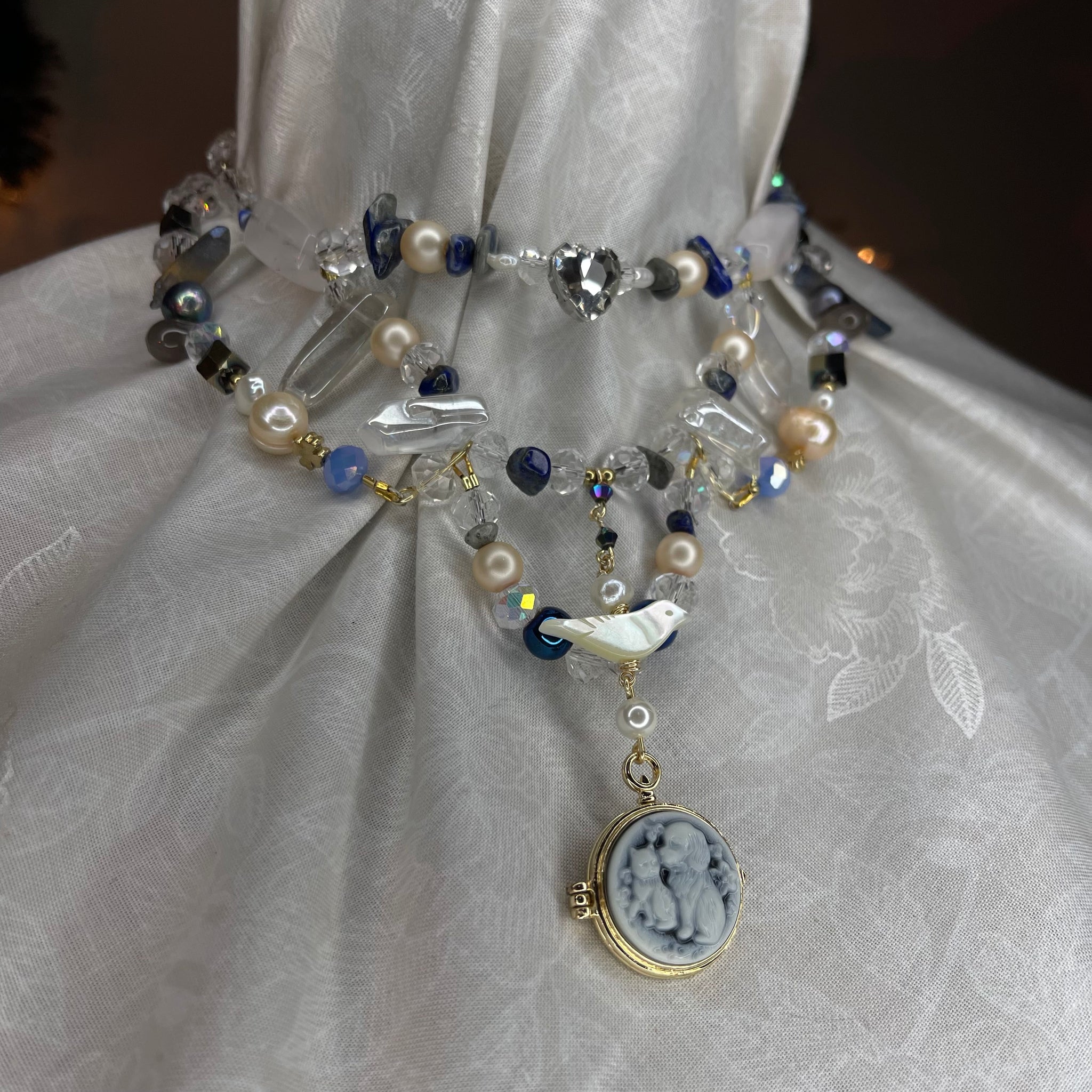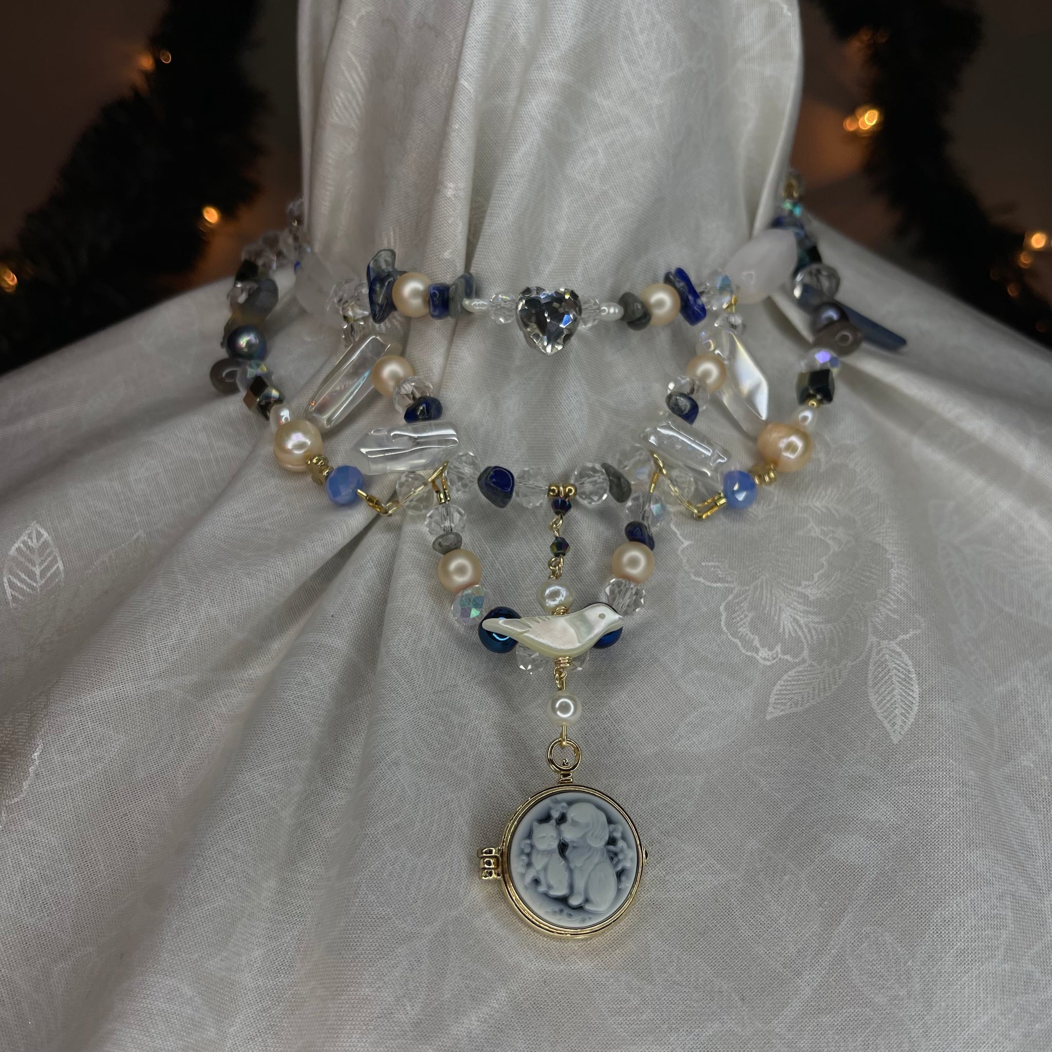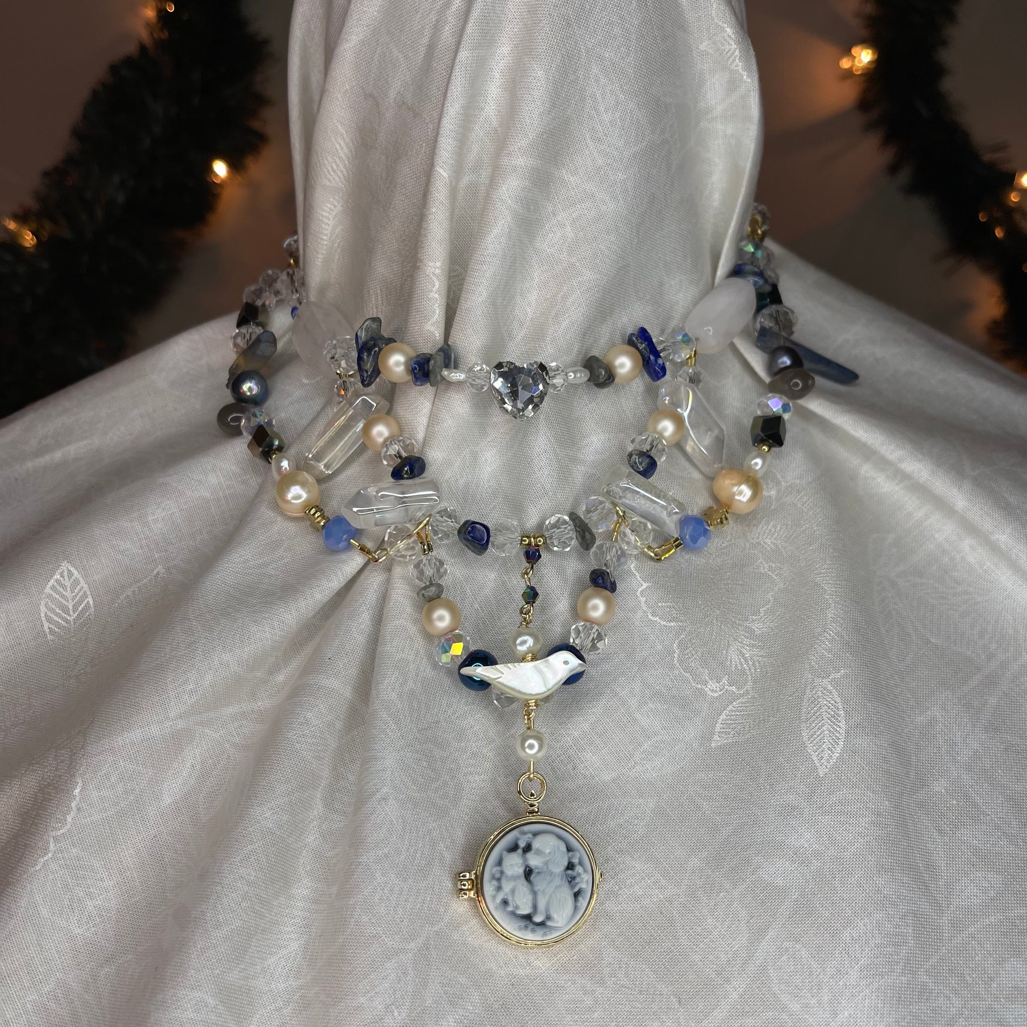 Made with: Freshwater pearls, Labradorite, Glass, Clear Quartz, Moonstone, Blue Lapiz, Cloudy Quartz and mother of pearl