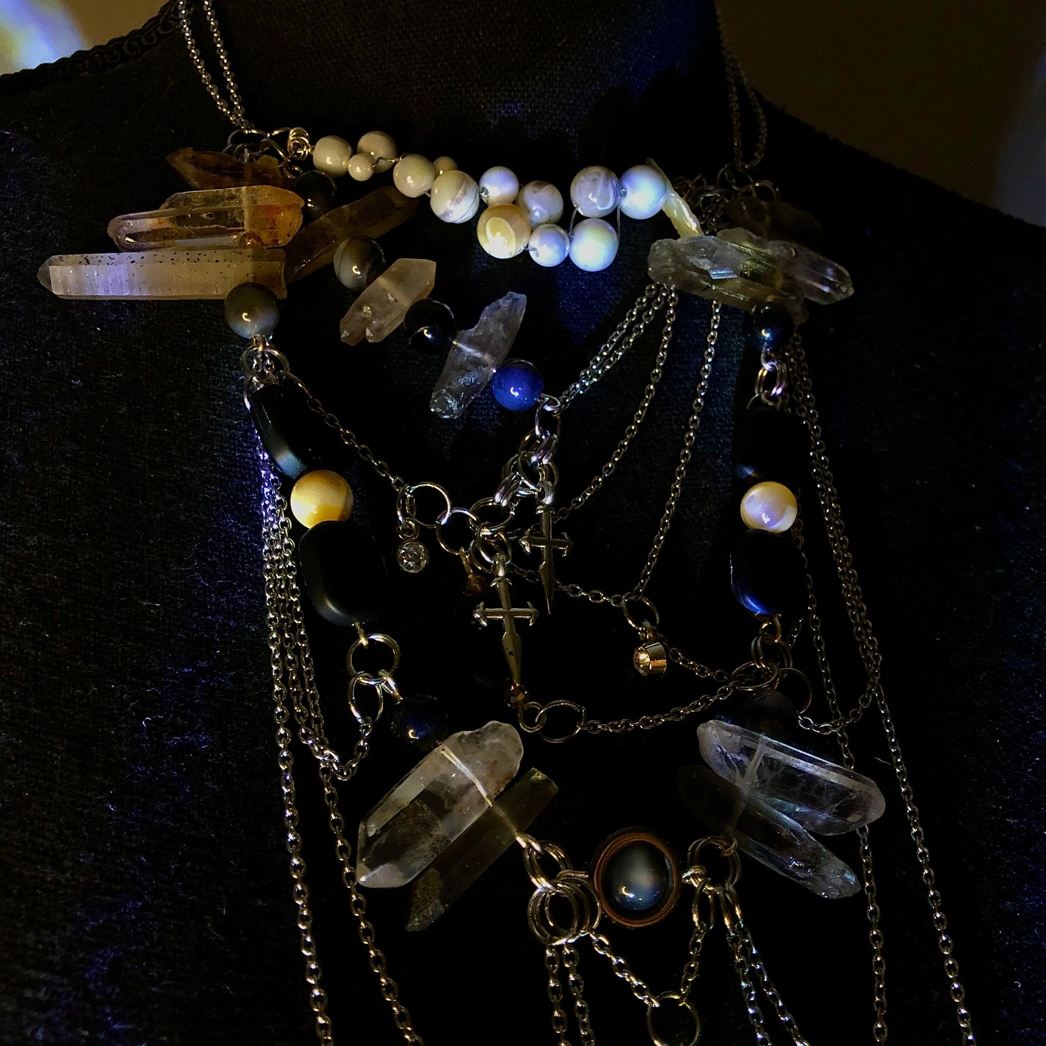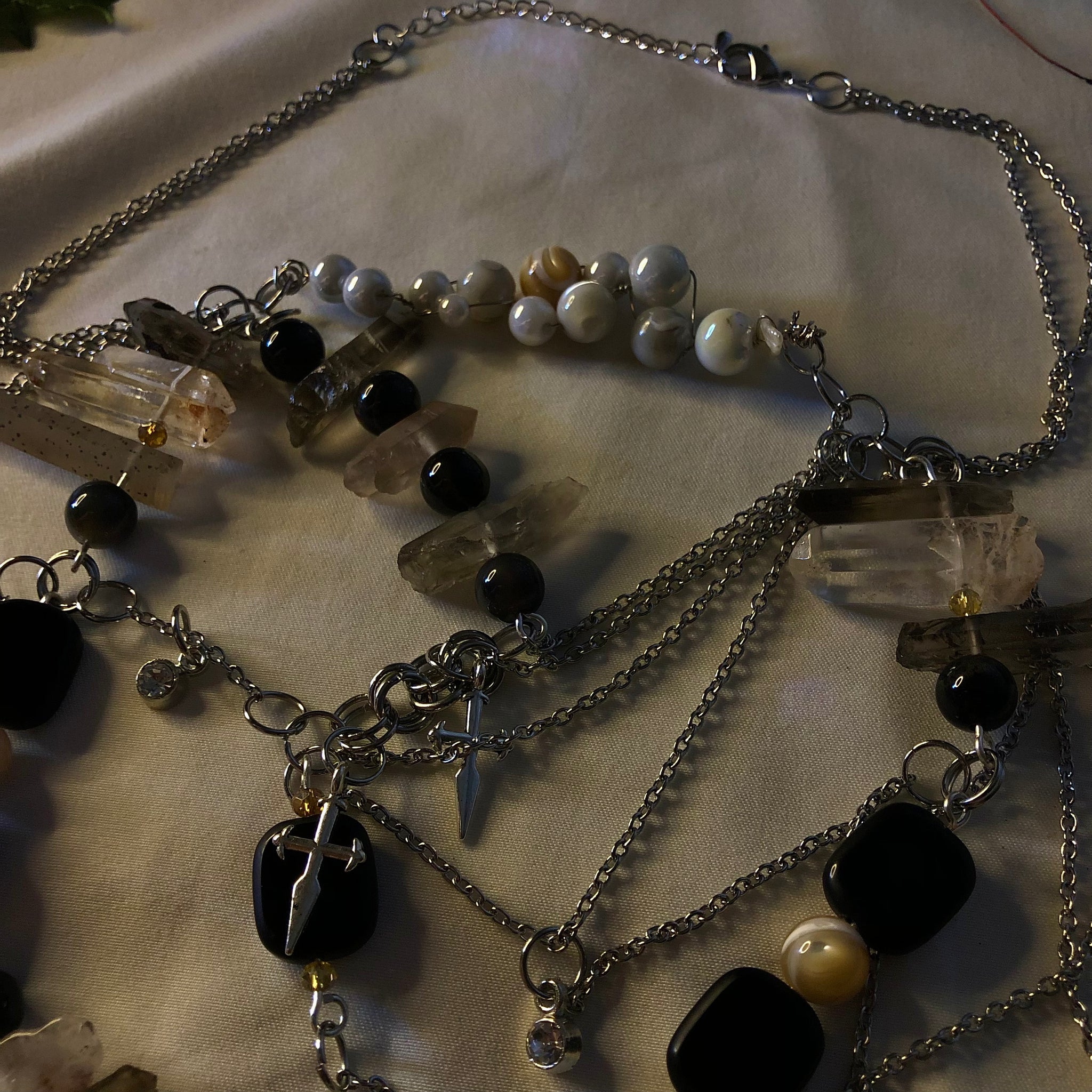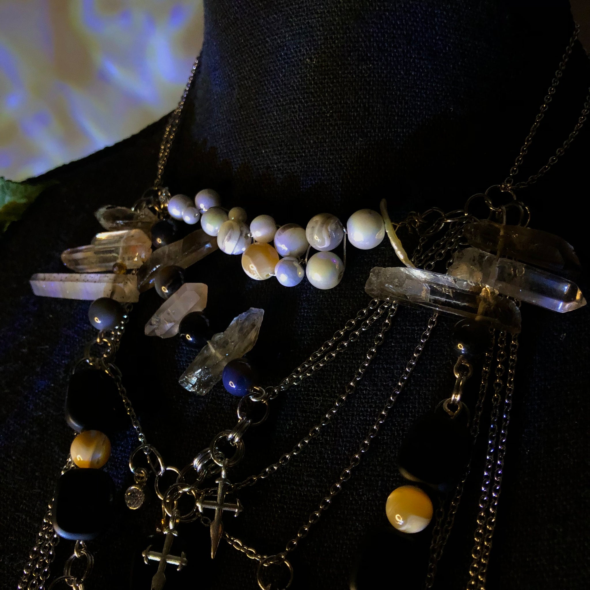 Stainless Steel Chain made with Tuxedo Agate, Czech Beads, Smoky Quartz, White & Beige Mother of Pearls, White Mother of Pearls, Amphibole angel Phantom Quartz, and A White Biwa Pearl.
