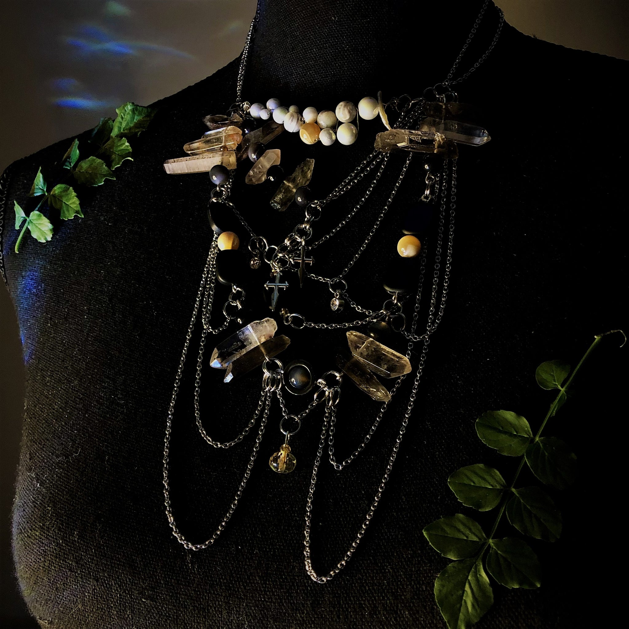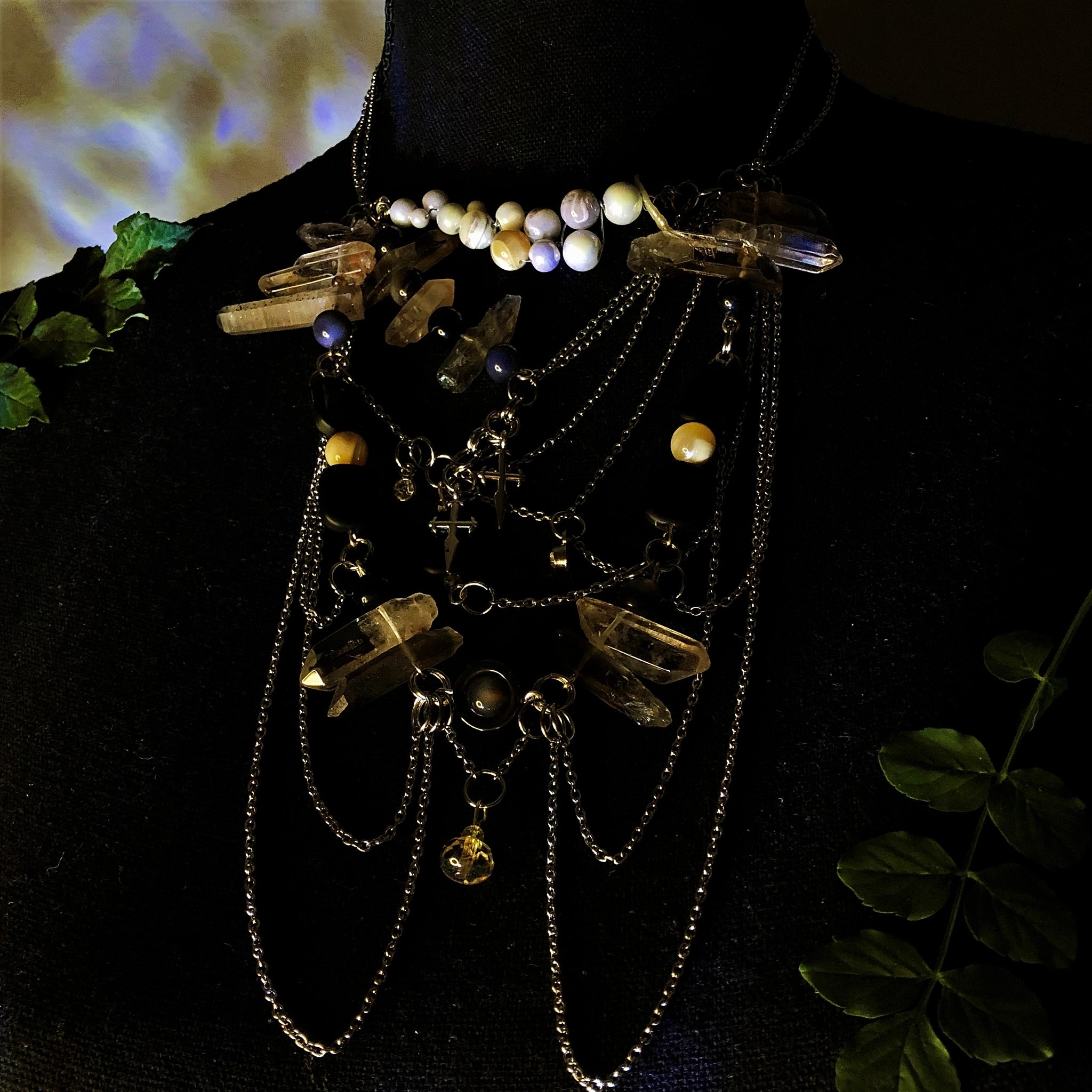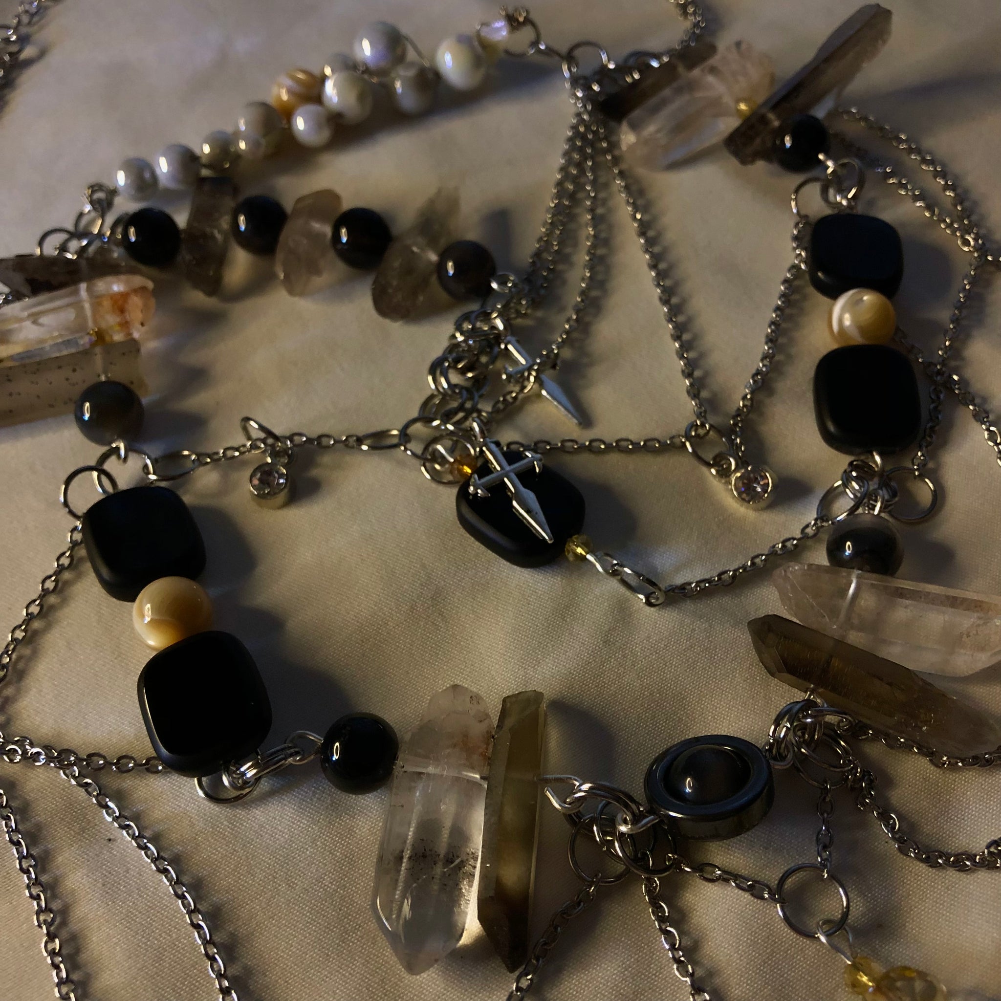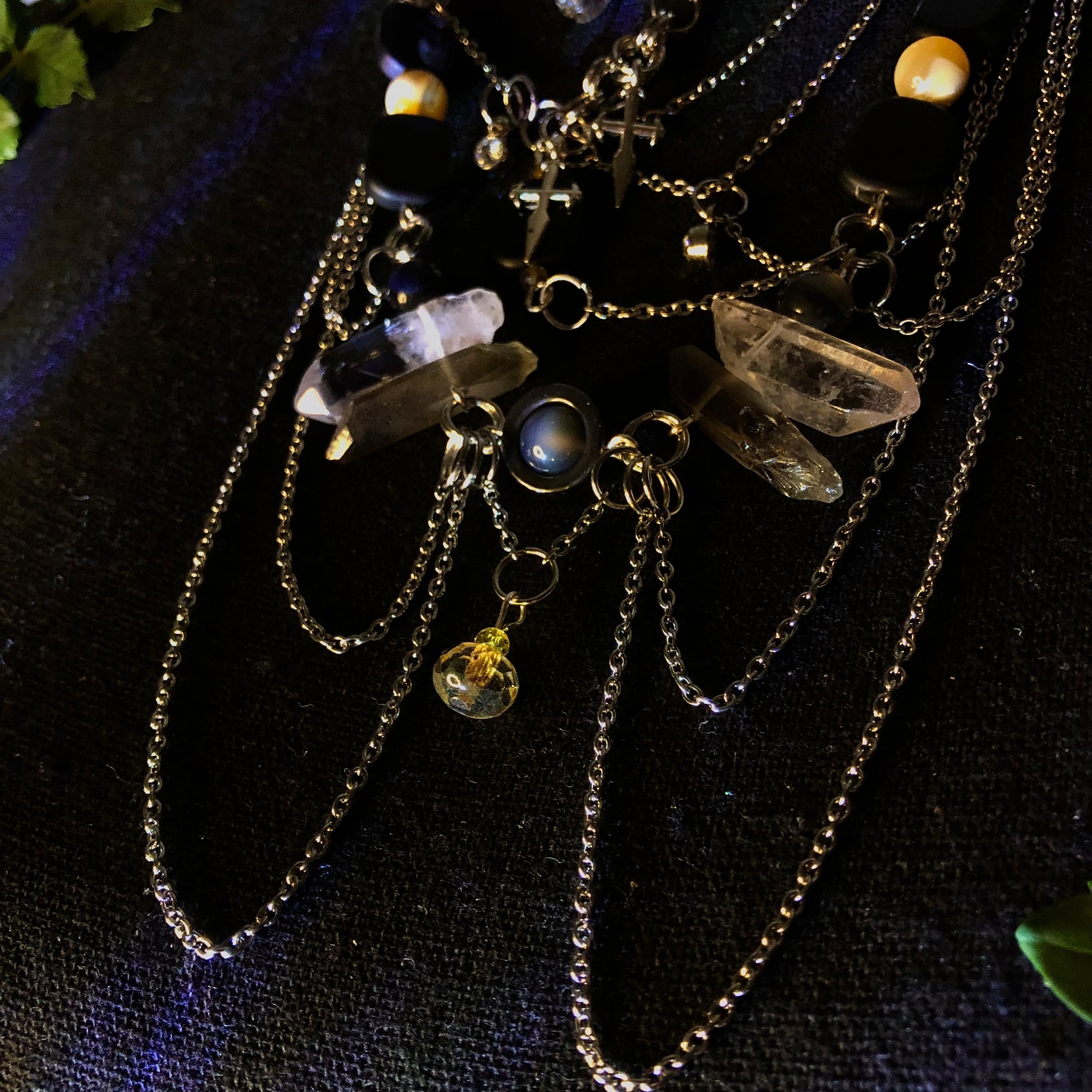 Stainless Steel Chain made with Tuxedo Agate, Czech Beads, Smoky Quartz, White & Beige Mother of Pearls, White Mother of Pearls, Amphibole angel Phantom Quartz, and A White Biwa Pearl.
