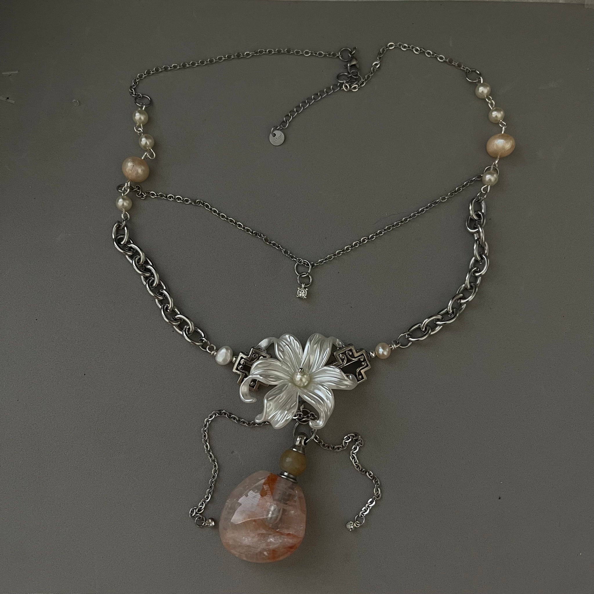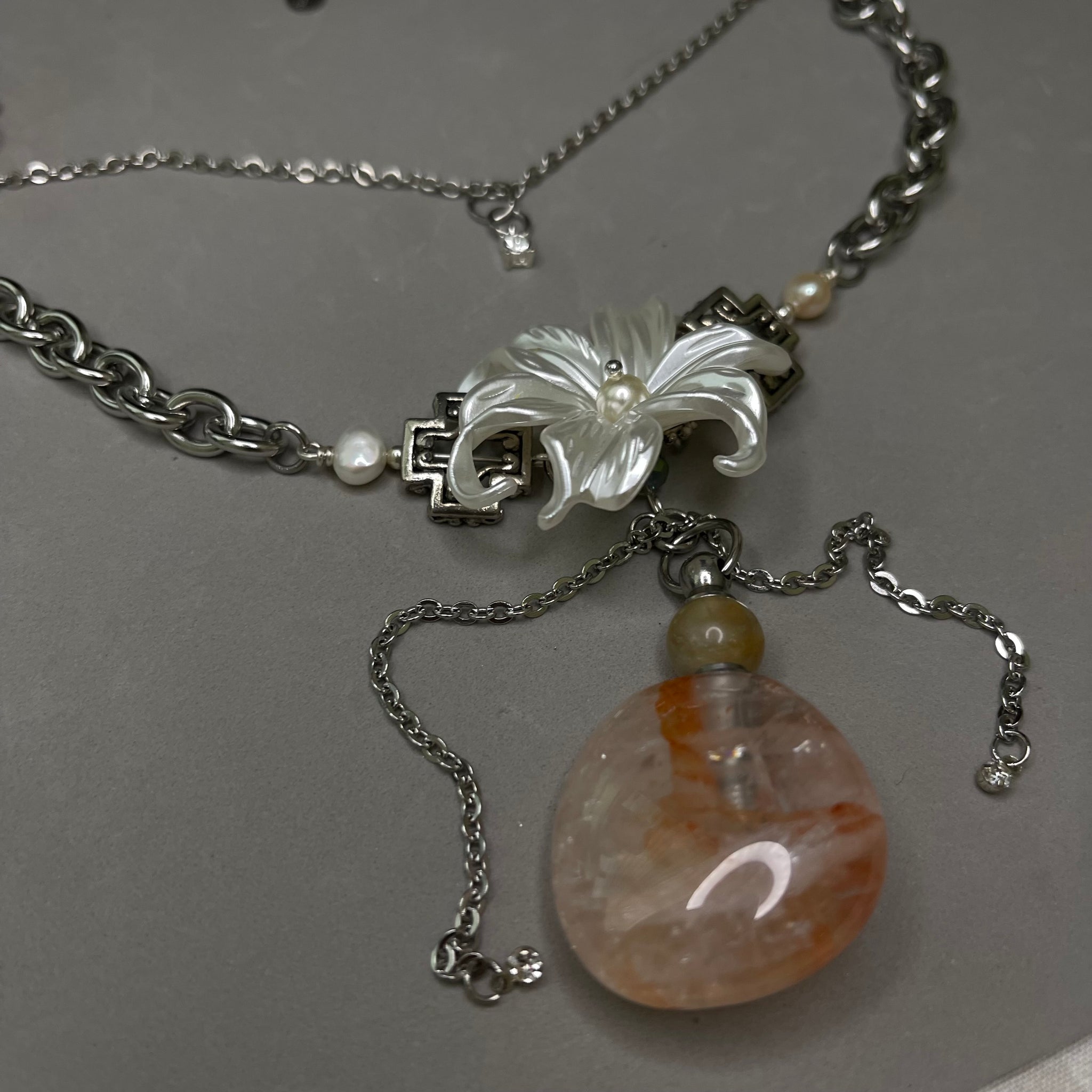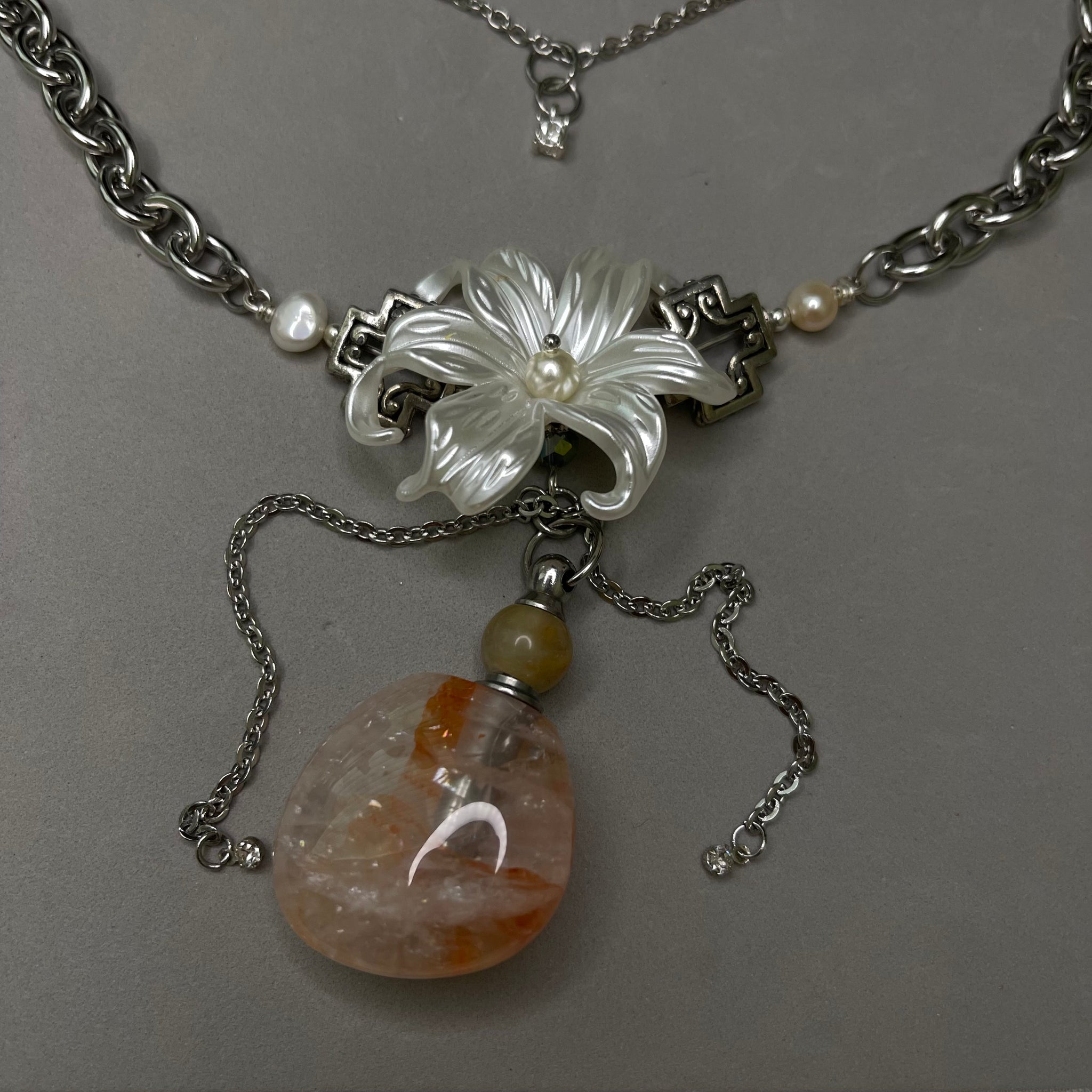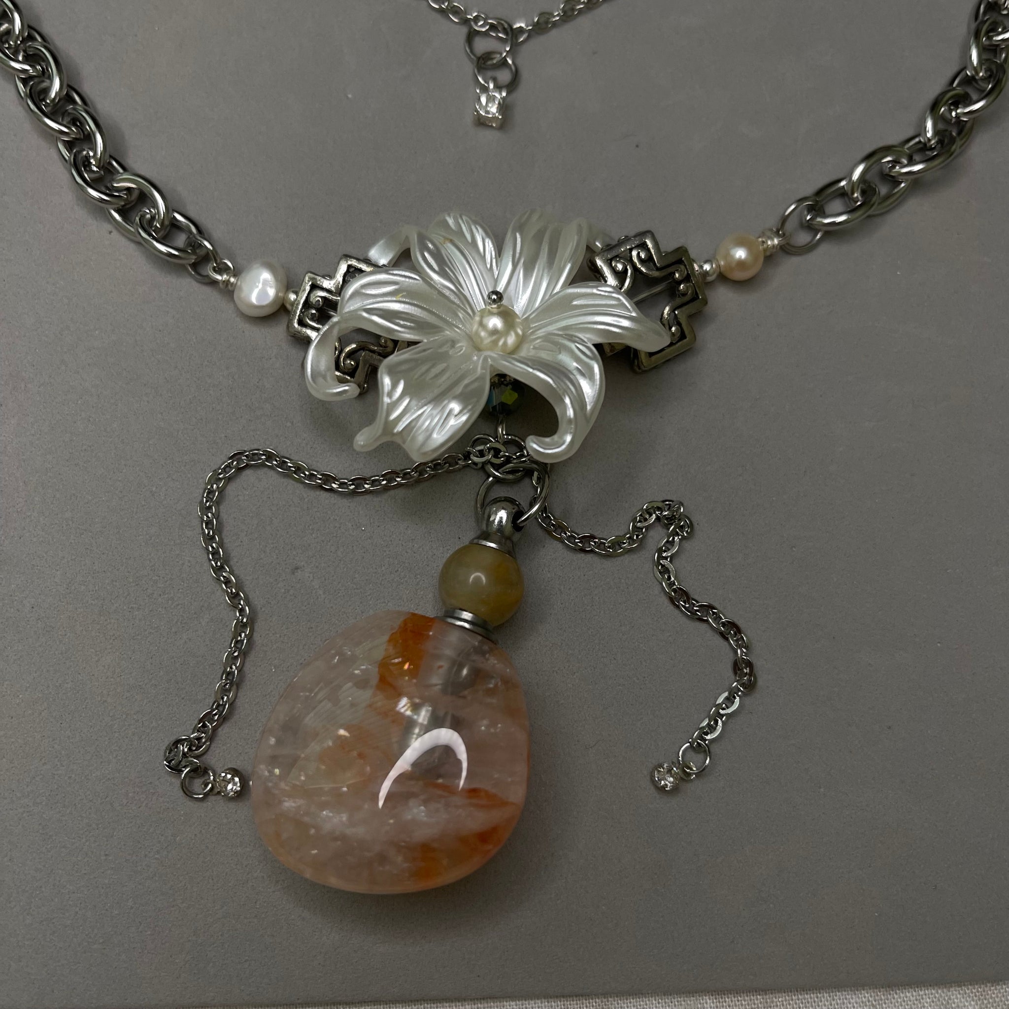 Made with: Carnelian oil bottle, freshwater pearls, stainless steel, zirconia and glass.