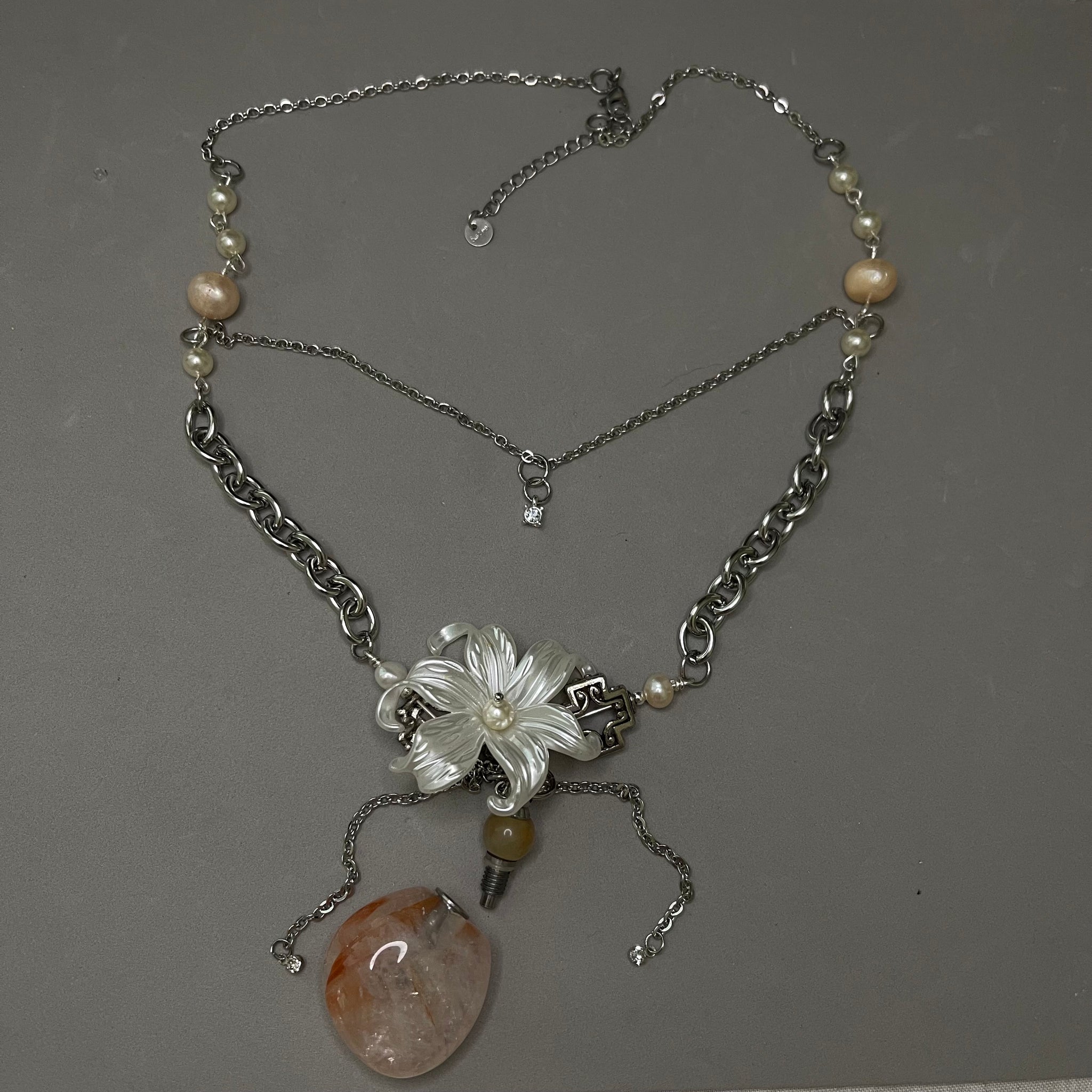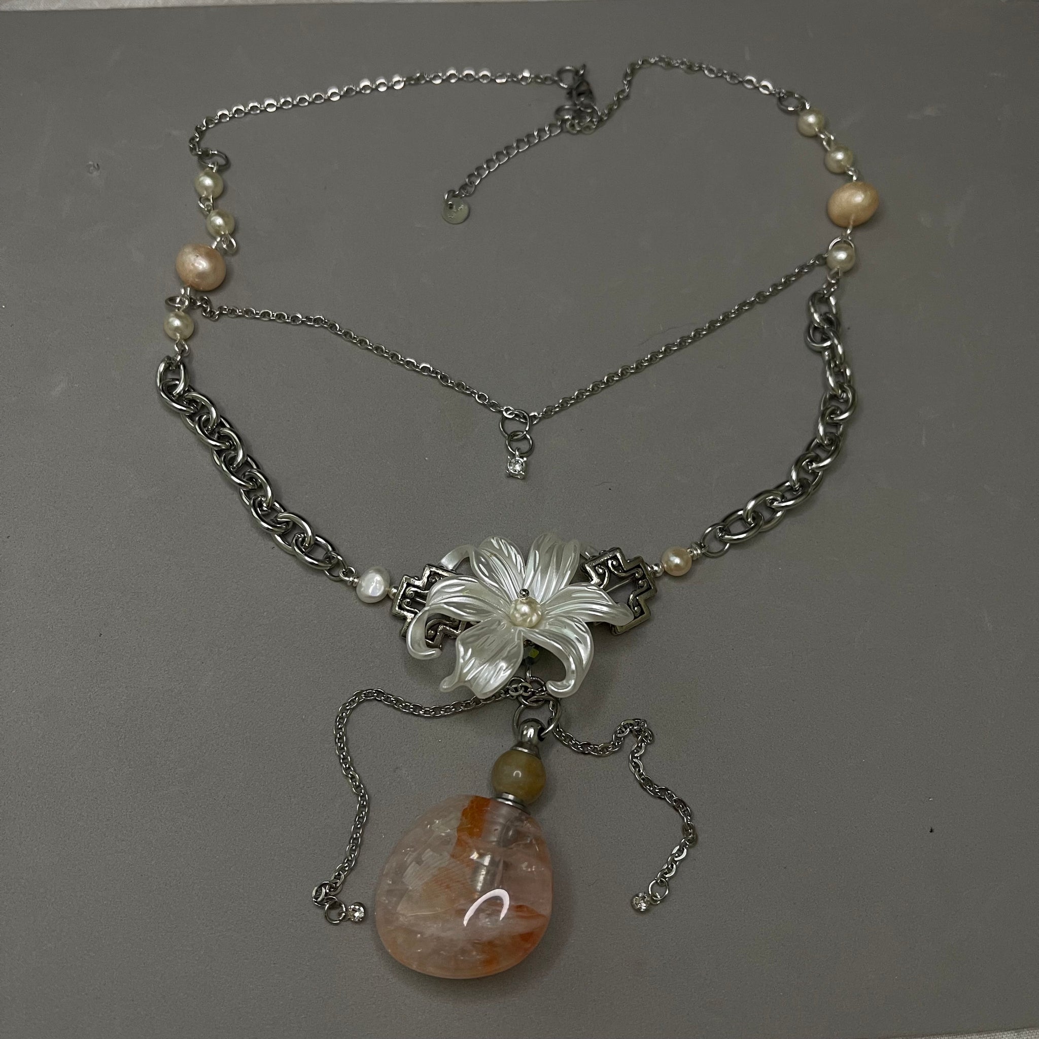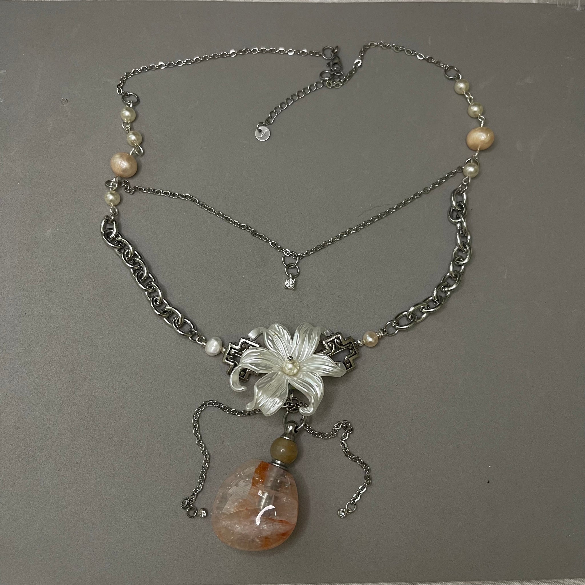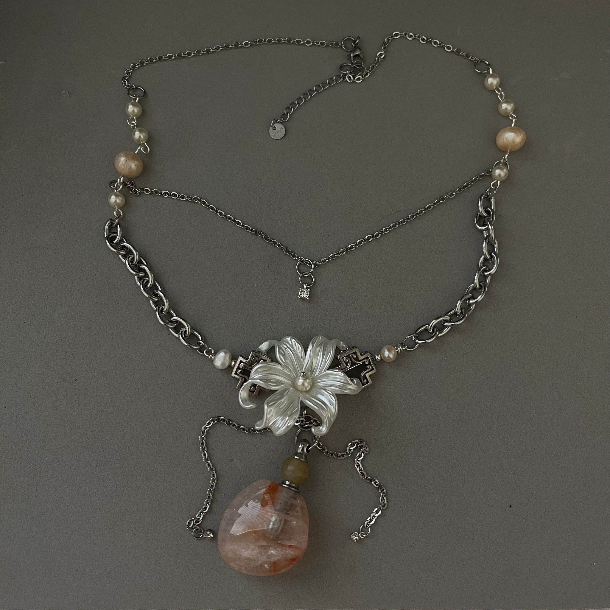Made with: Carnelian oil bottle, freshwater pearls, stainless steel, zirconia and glass.