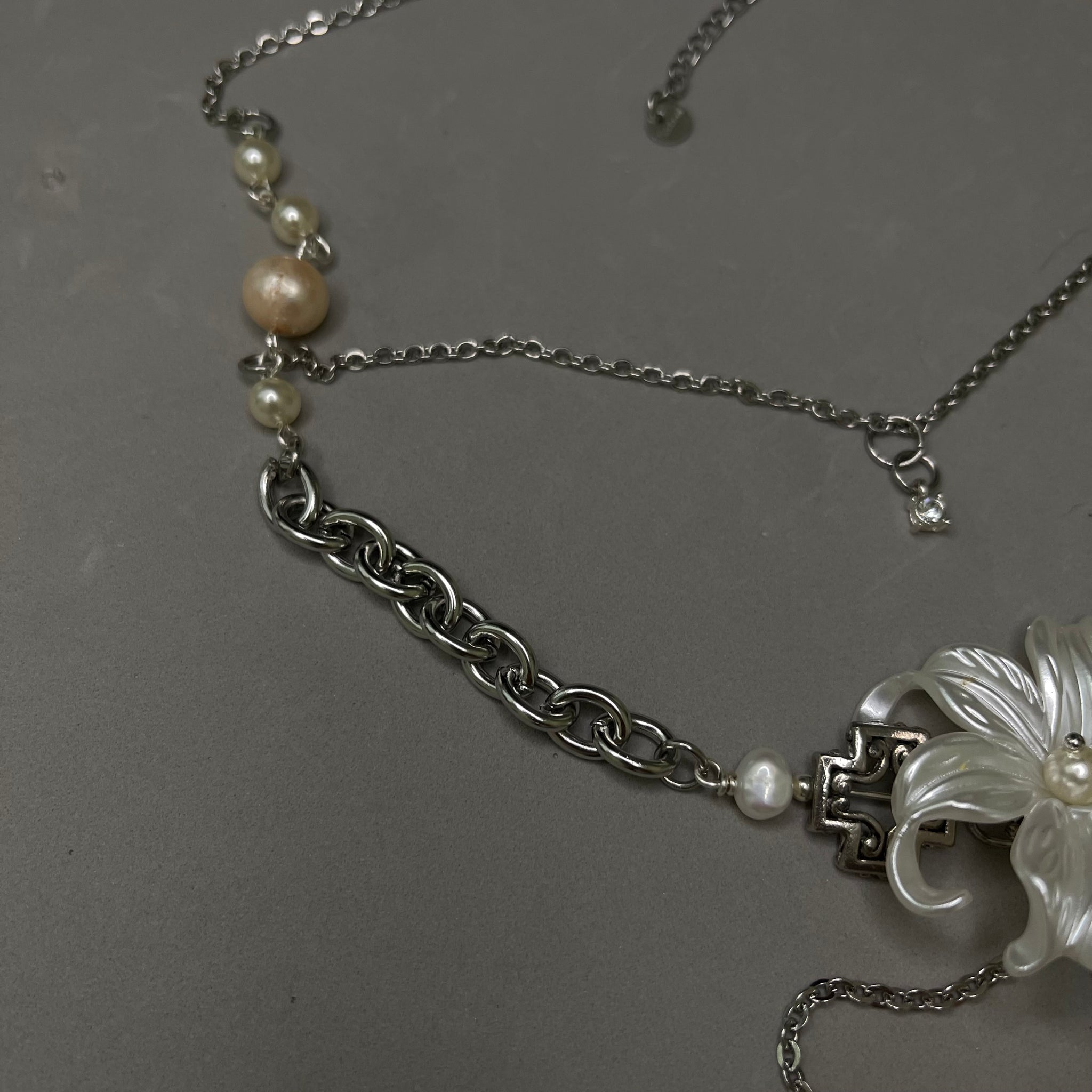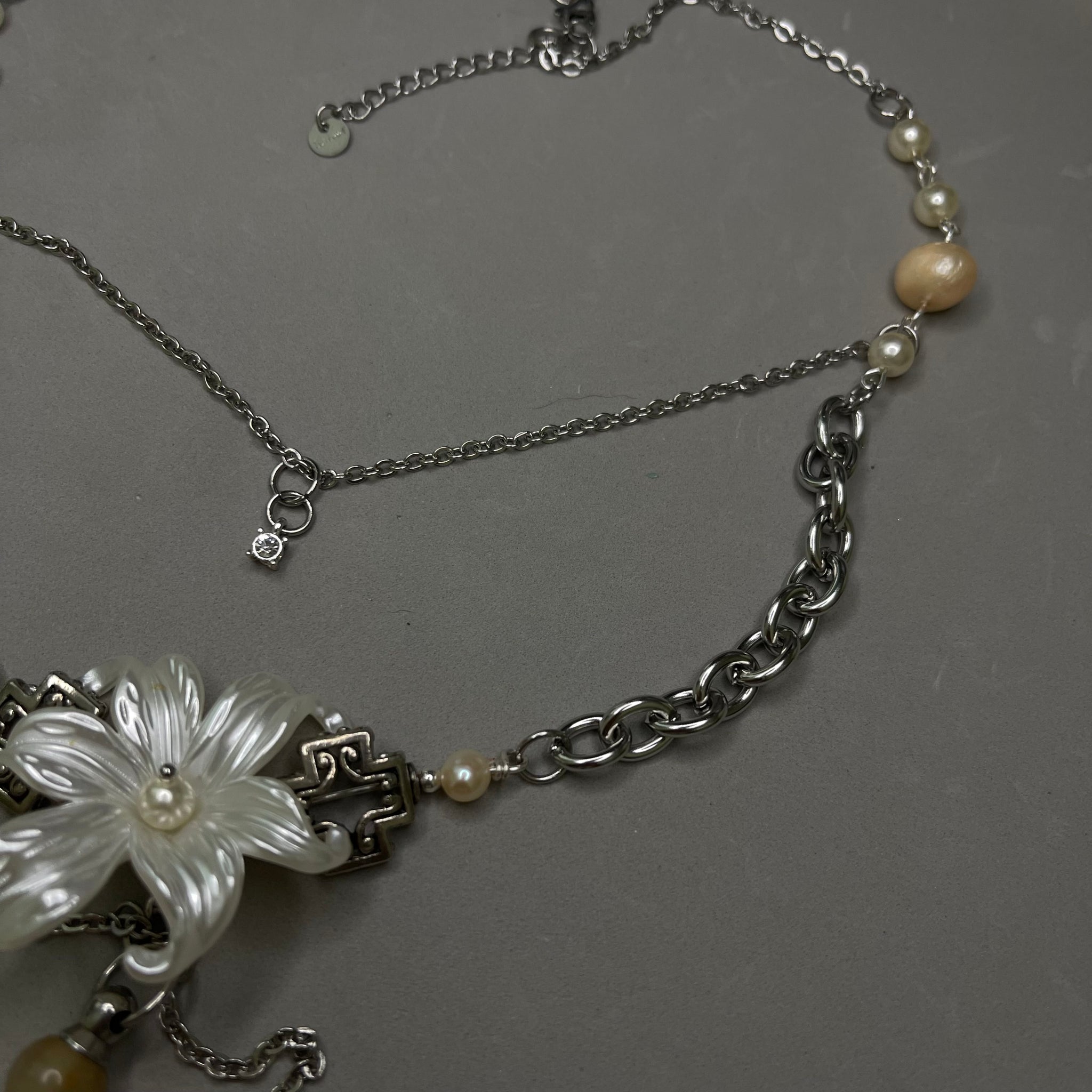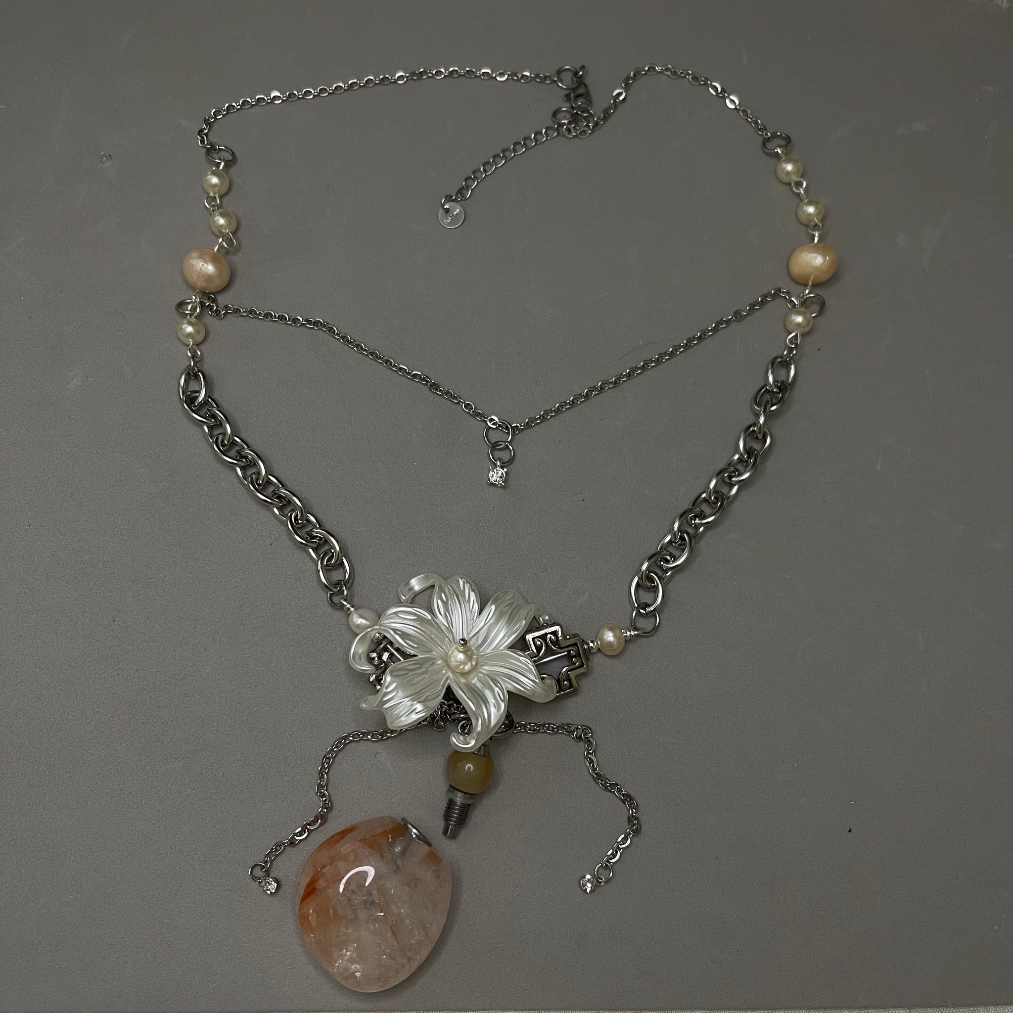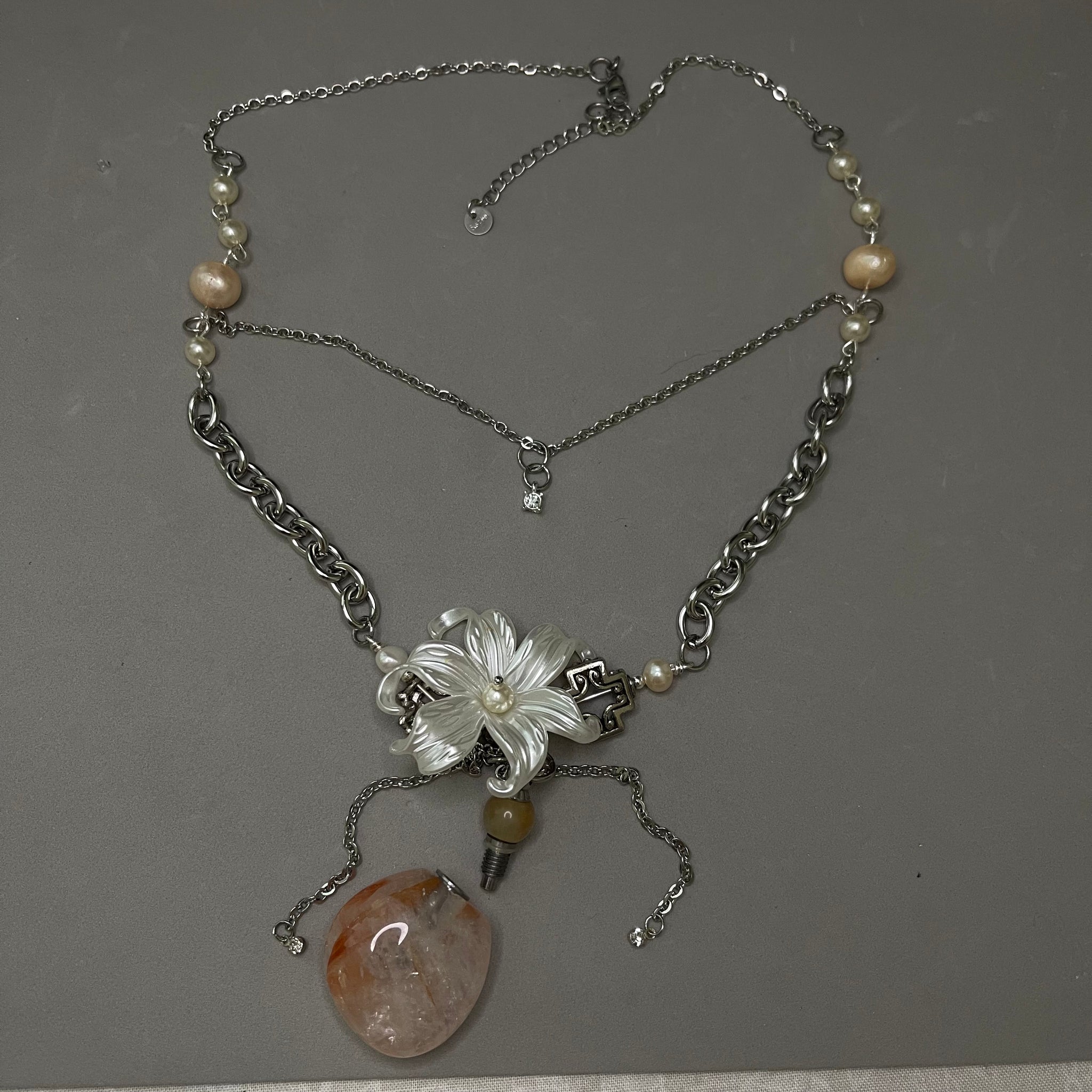 Made with: Carnelian oil bottle, freshwater pearls, stainless steel, zirconia and glass.