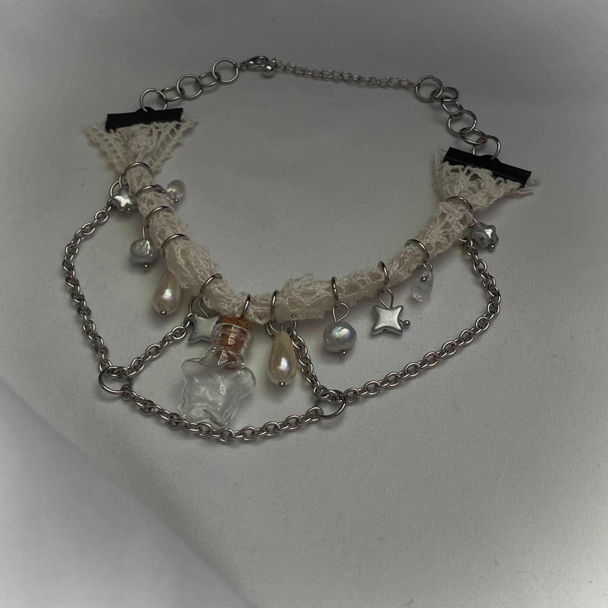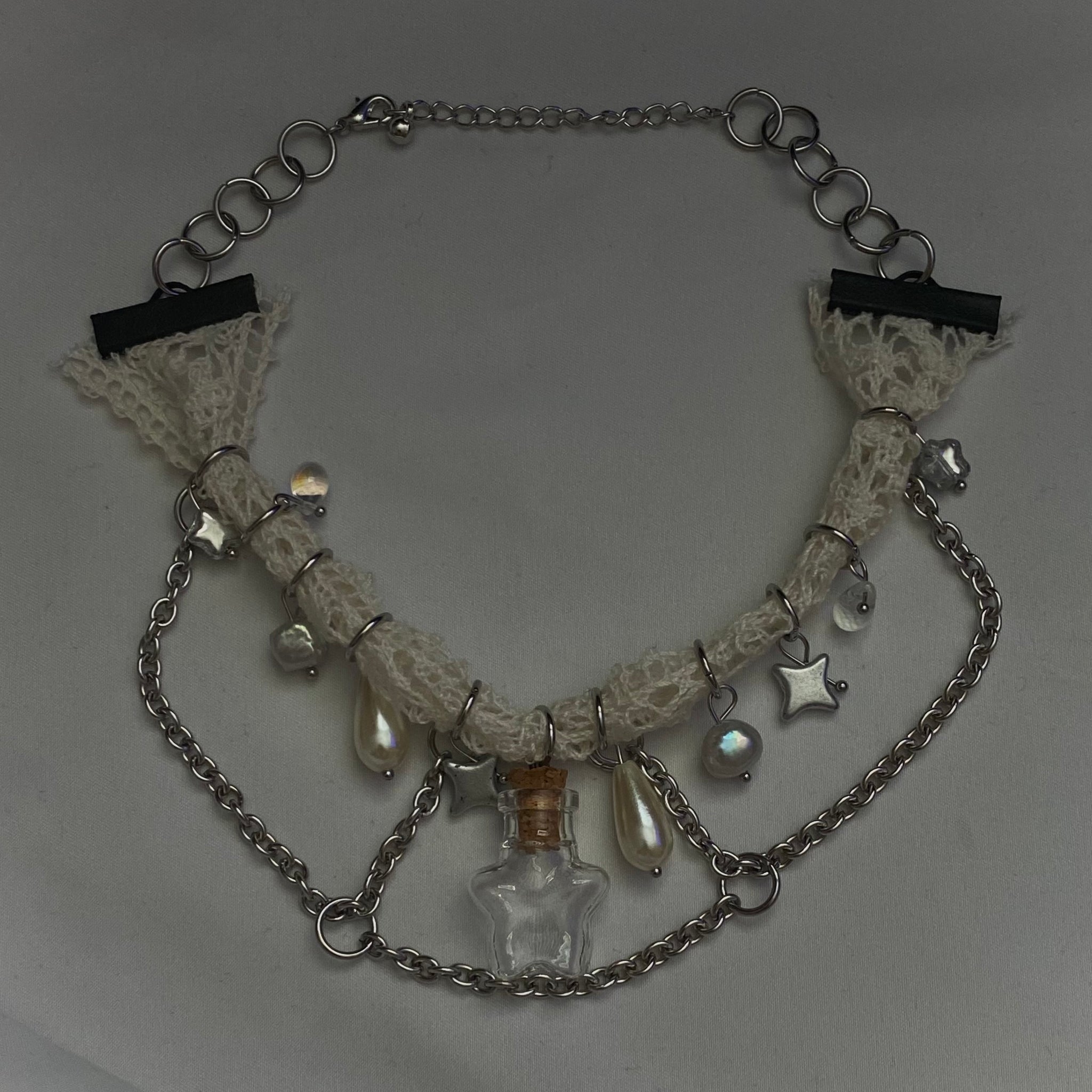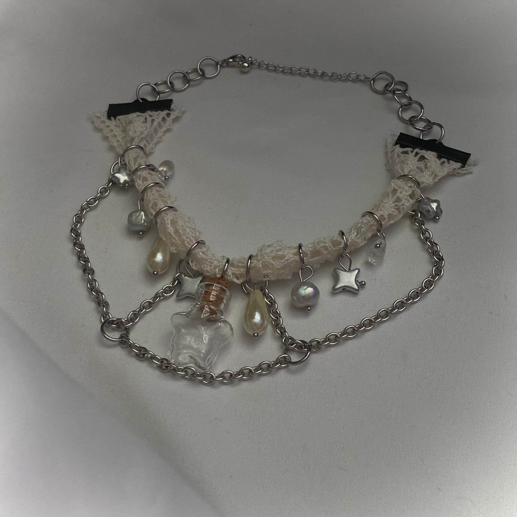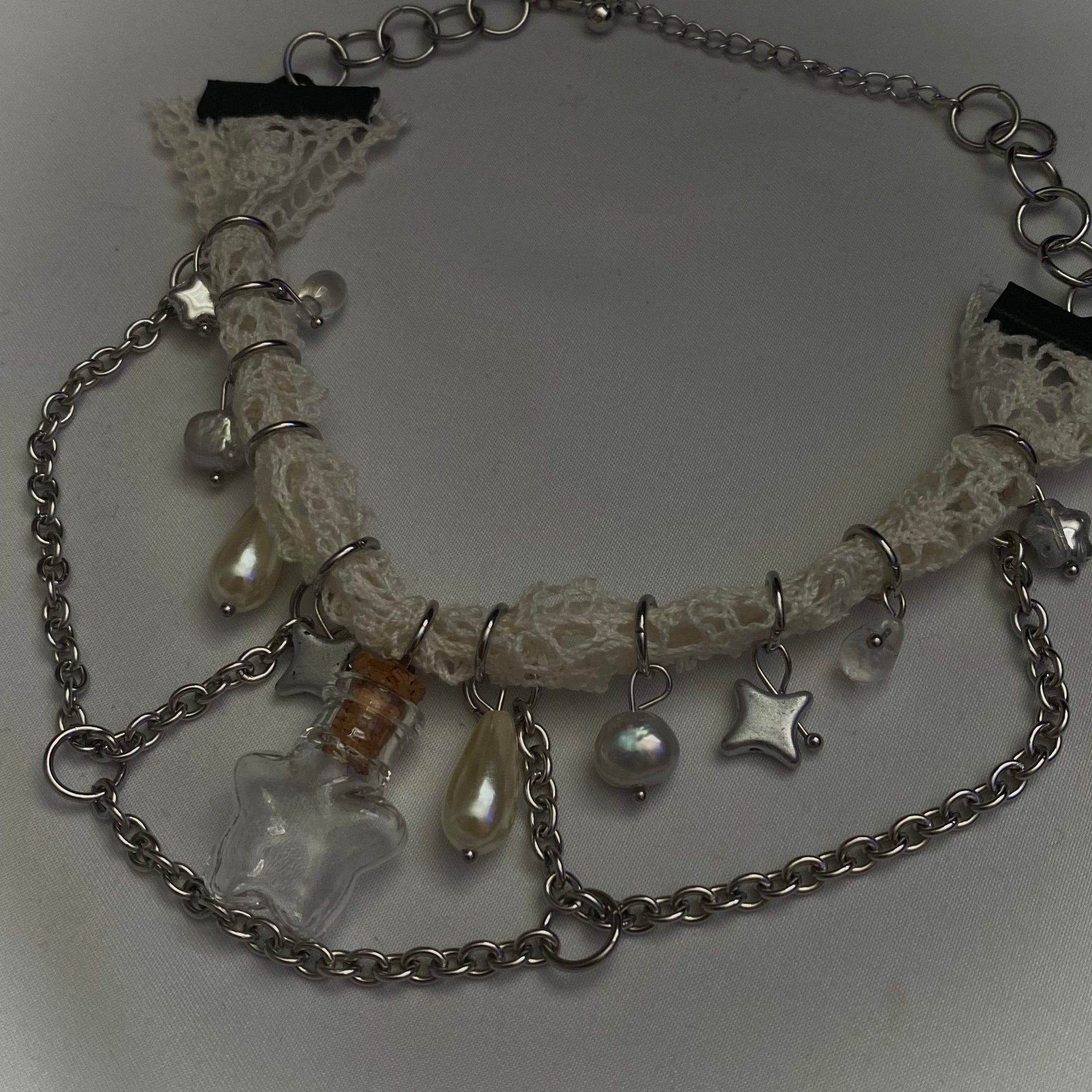 Made with stars, freshwater pearls, antique beads, drop beads, glass star bottle (DOES NOT OPEN!!) and crochet ribbon.