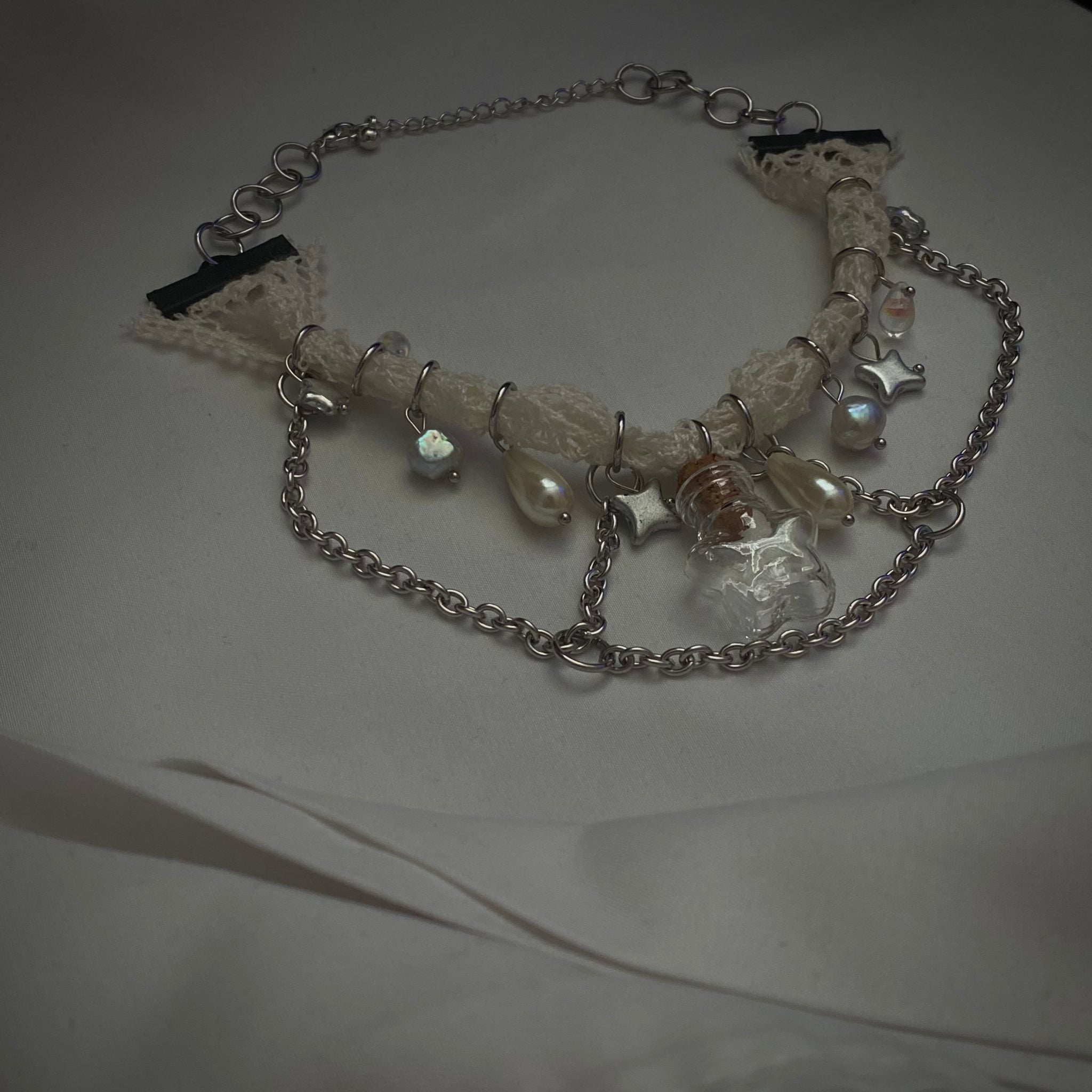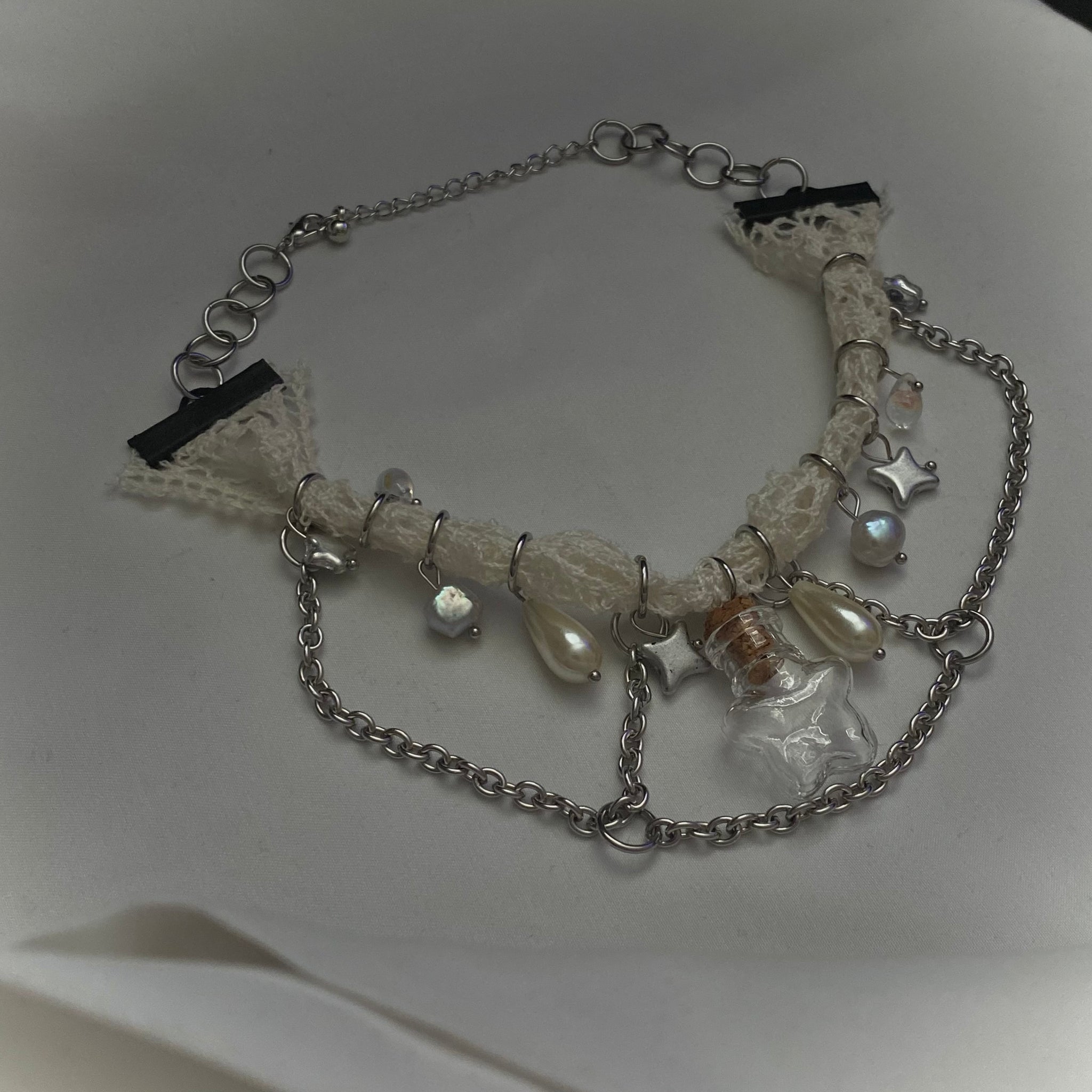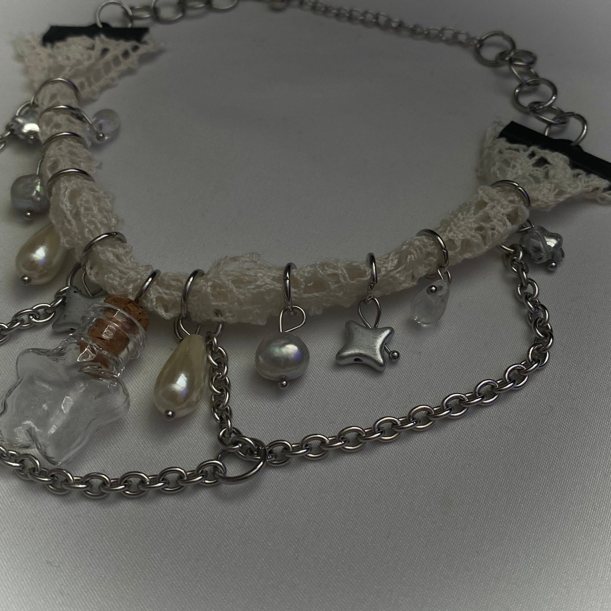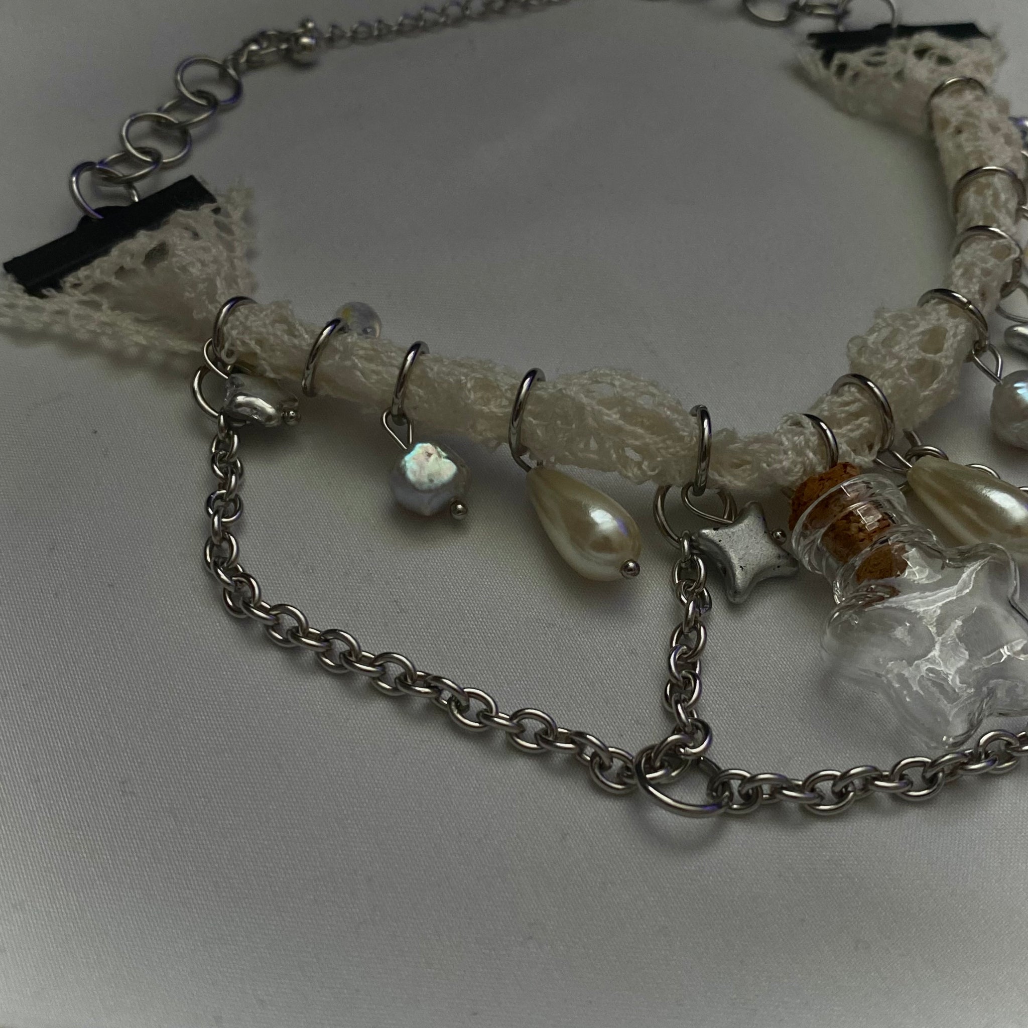 Made with stars, freshwater pearls, antique beads, drop beads, glass star bottle (DOES NOT OPEN!!) and crochet ribbon.