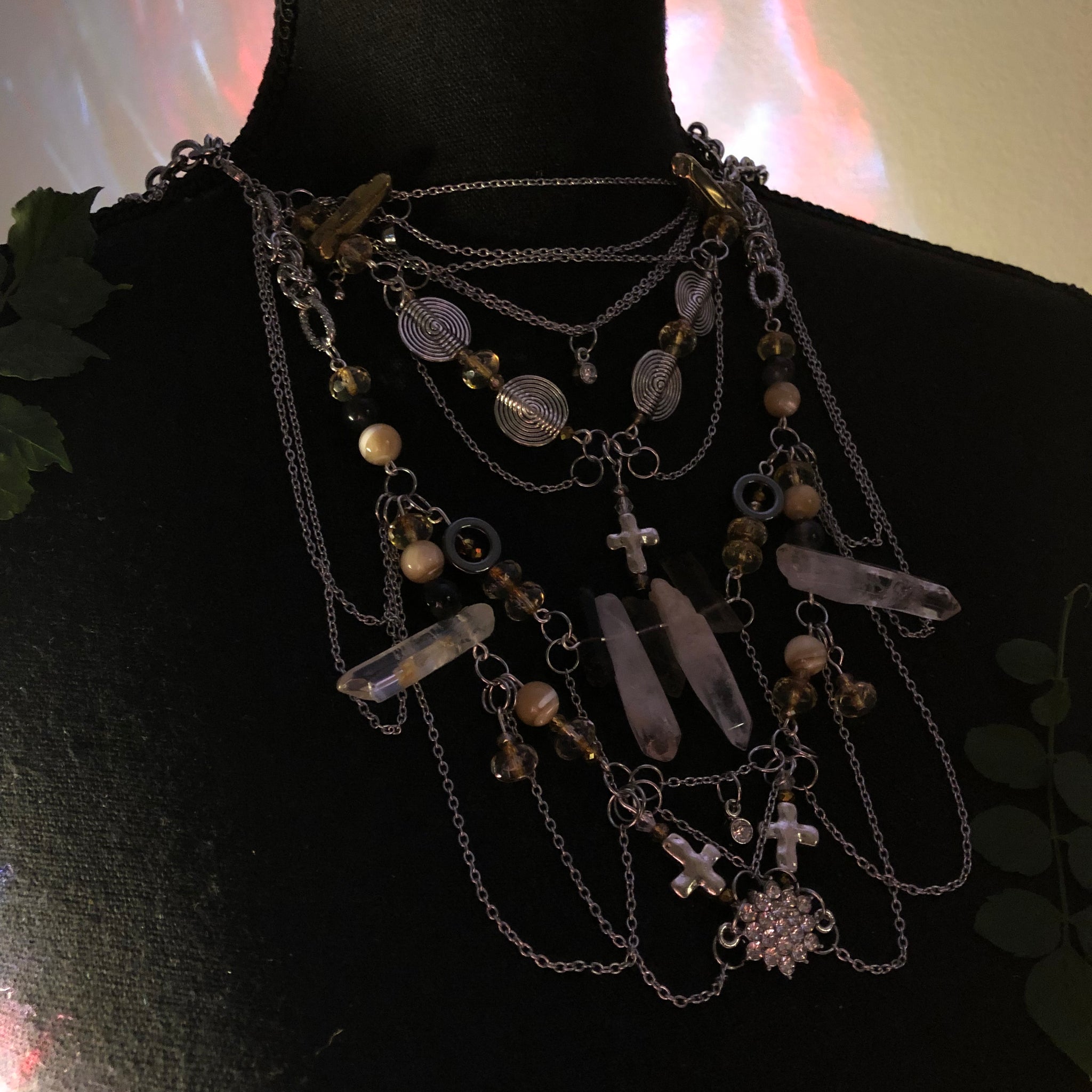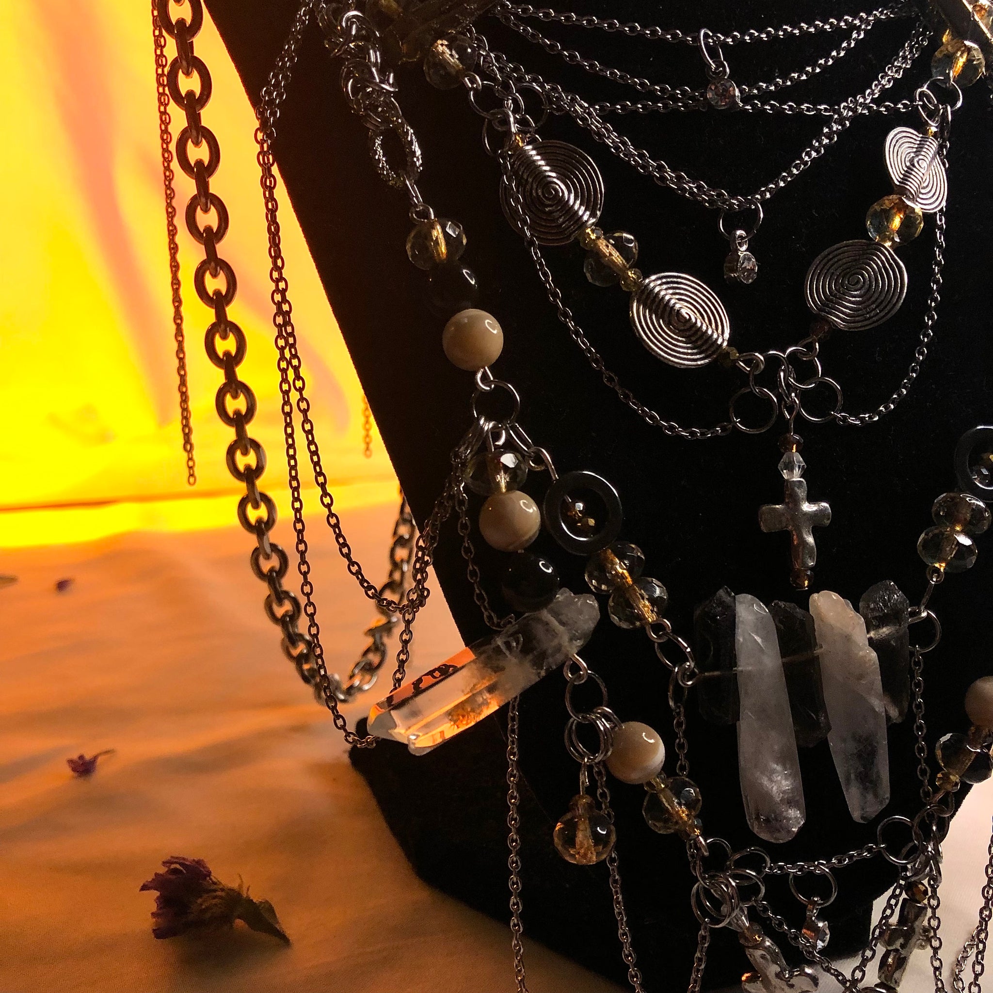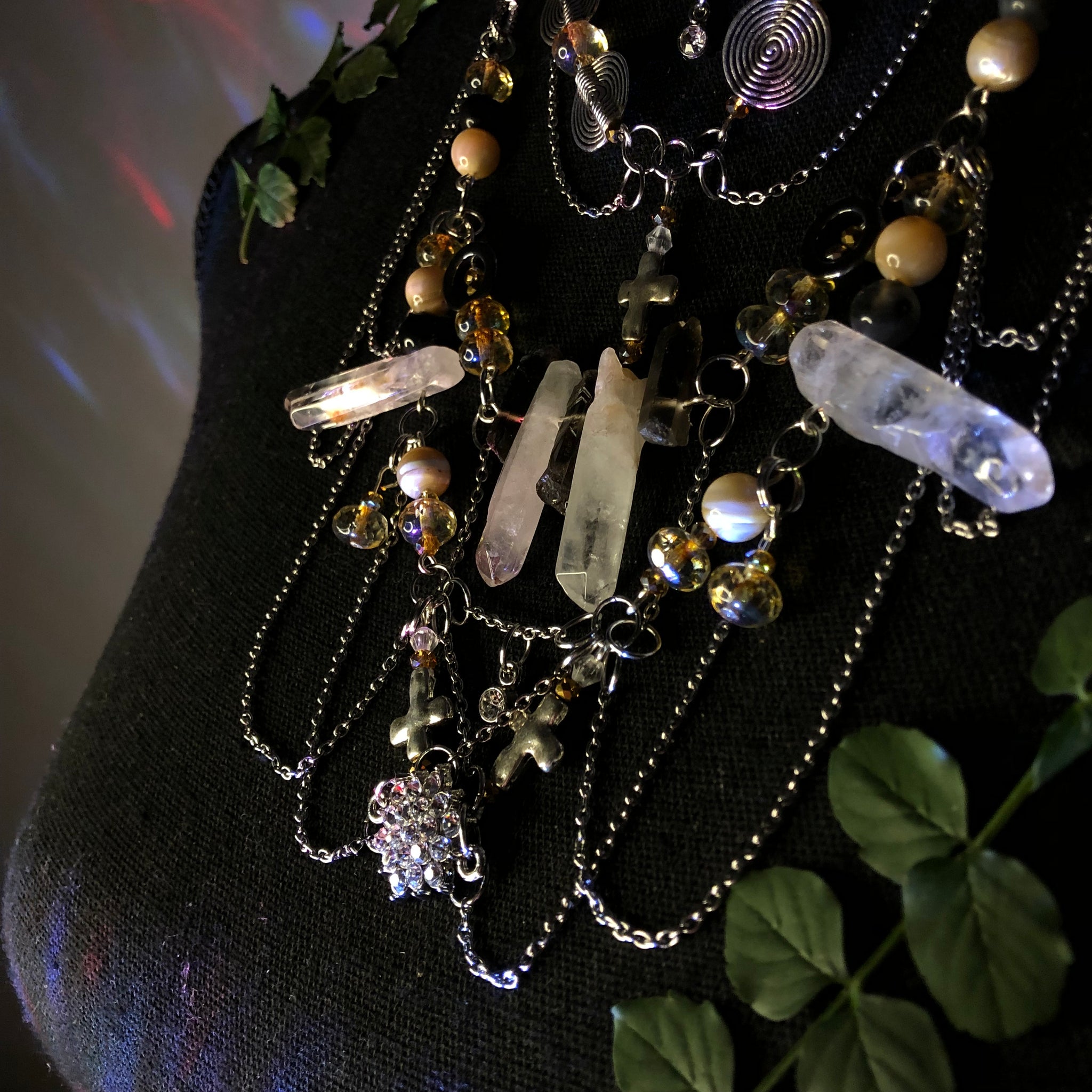 Stainless Steel chain made with Czech beads, Tuxedo Agate, Smoky Quartz, Beige Mother of Pearl, Amber Rondelle, Amphibole Angel Phantom Quartz, Metal Crosses and Spirals.