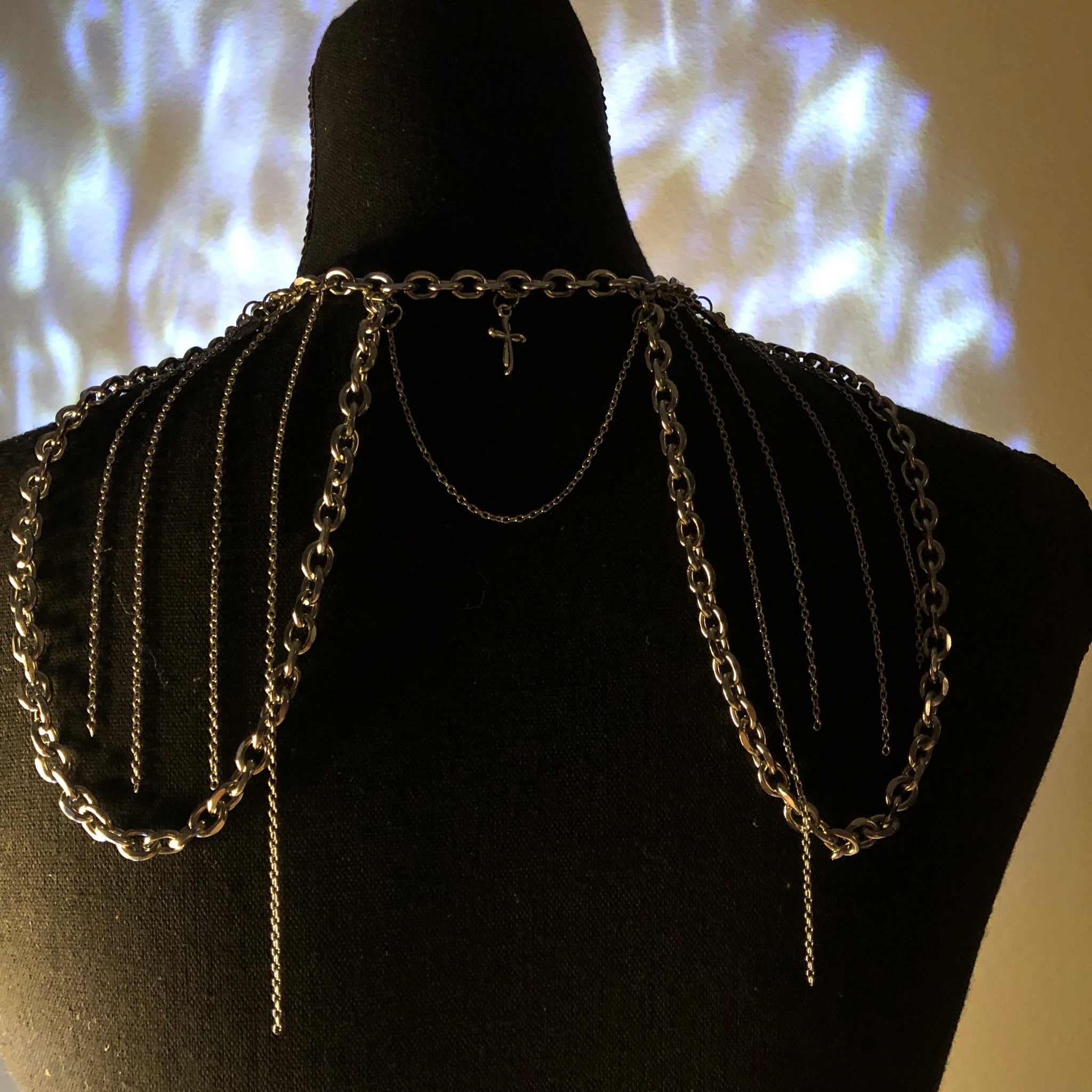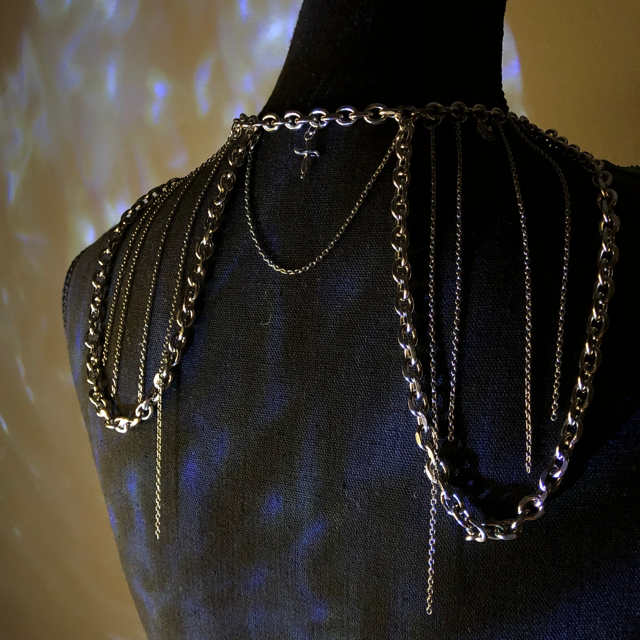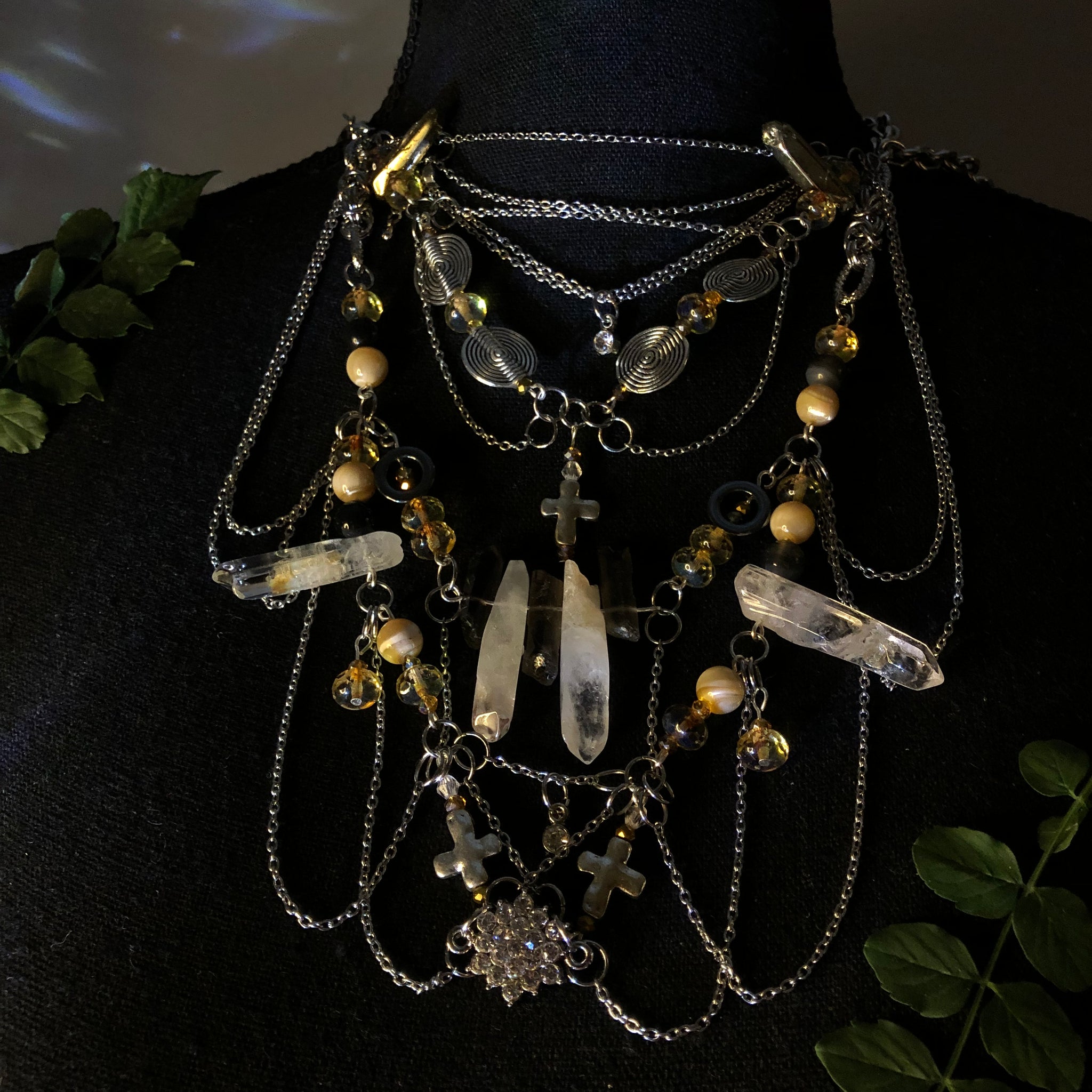 Stainless Steel chain made with Czech beads, Tuxedo Agate, Smoky Quartz, Beige Mother of Pearl, Amber Rondelle, Amphibole Angel Phantom Quartz, Metal Crosses and Spirals.