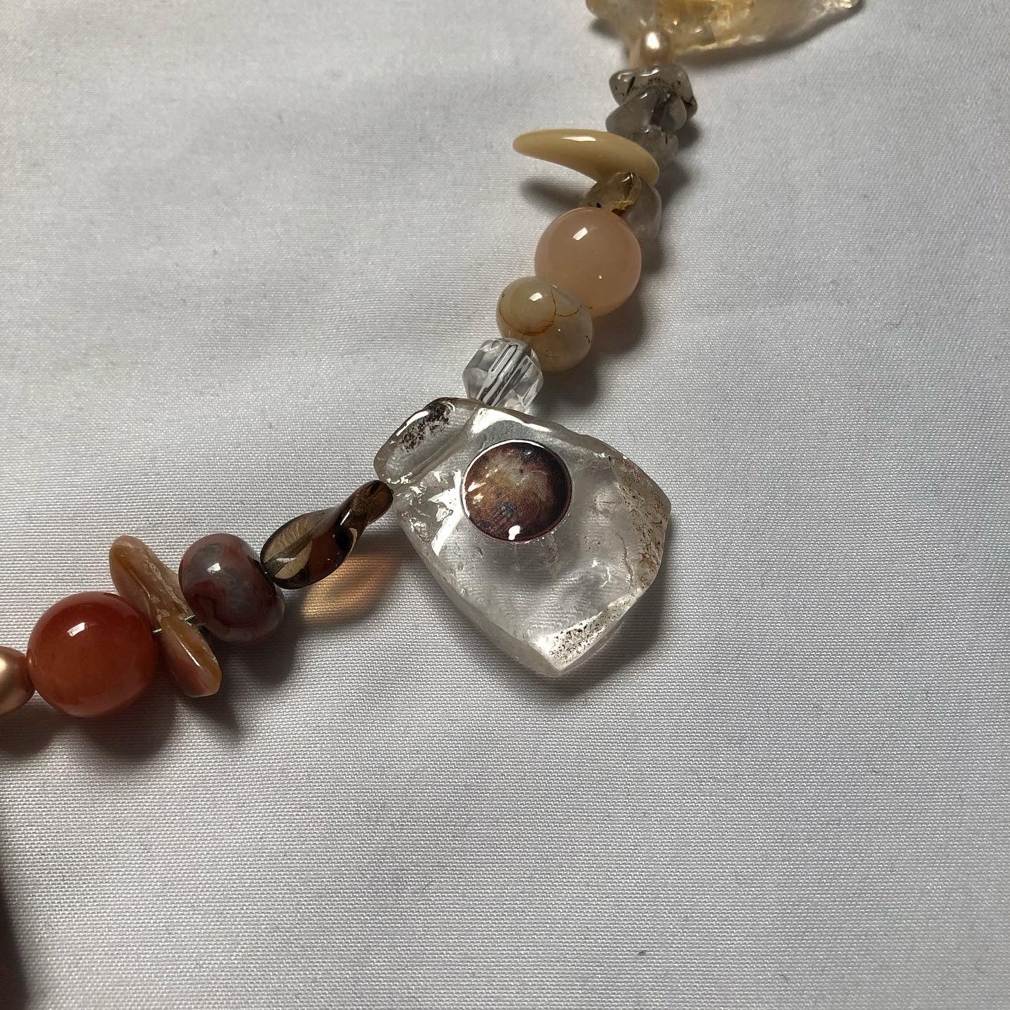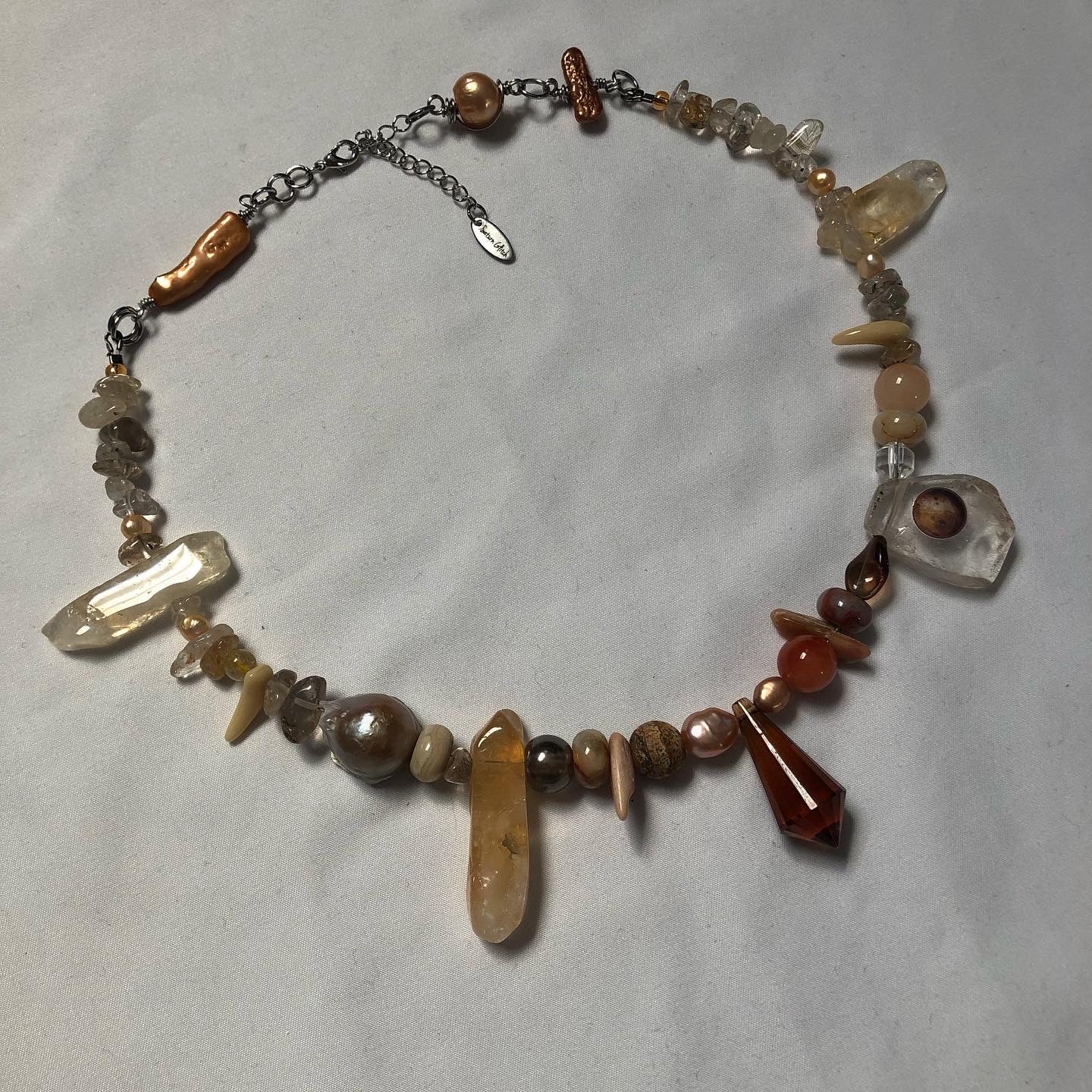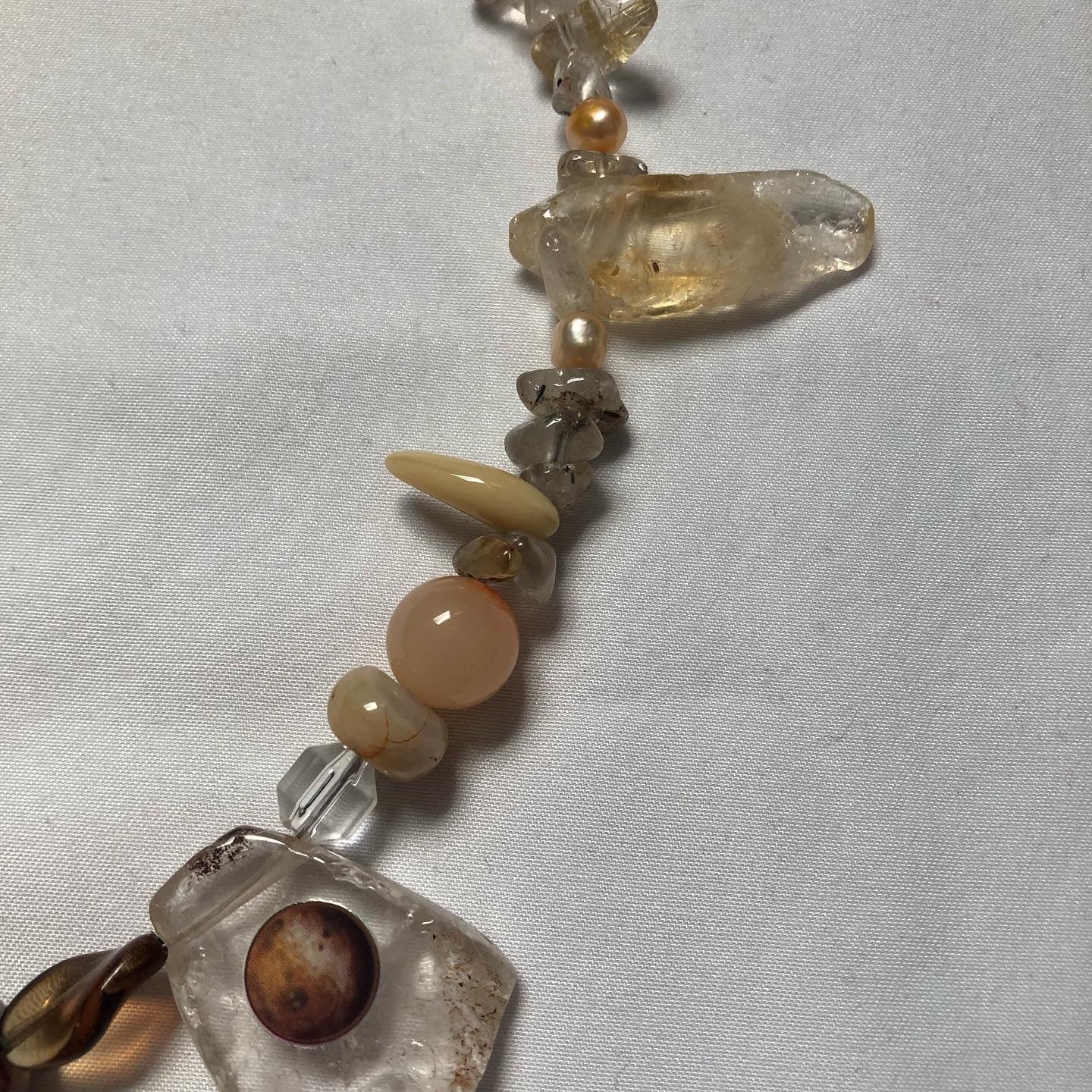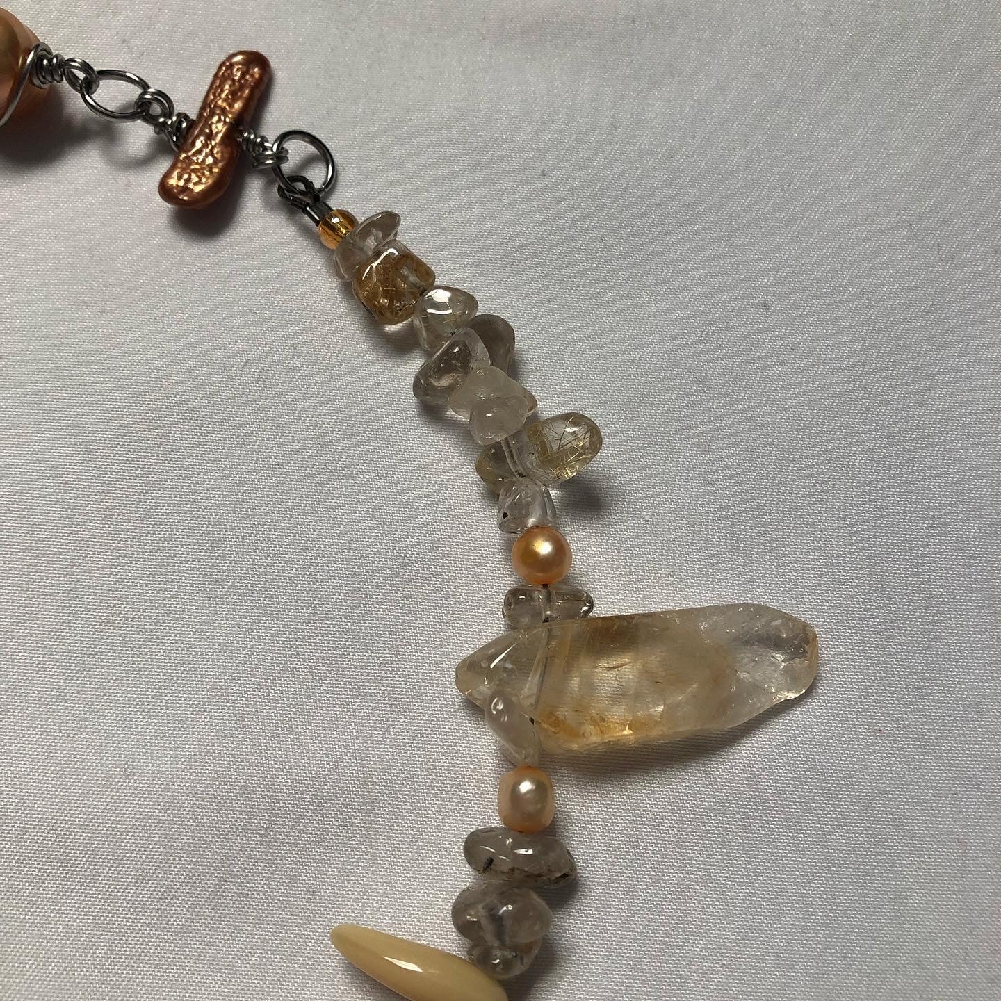 Made with: Golden Rutilated Quartz, Freshwater pearls, citrine, Clear quartz with resined venus sticker, agate, claws, czech glass, peach agate, antique glass and sterling silver components.