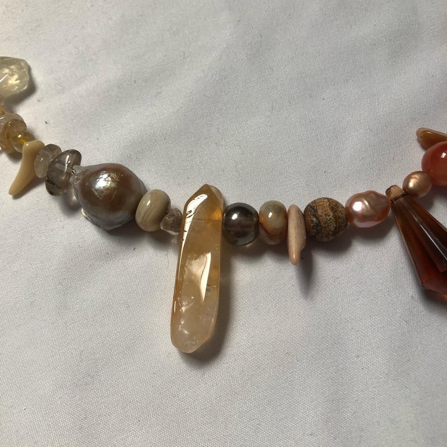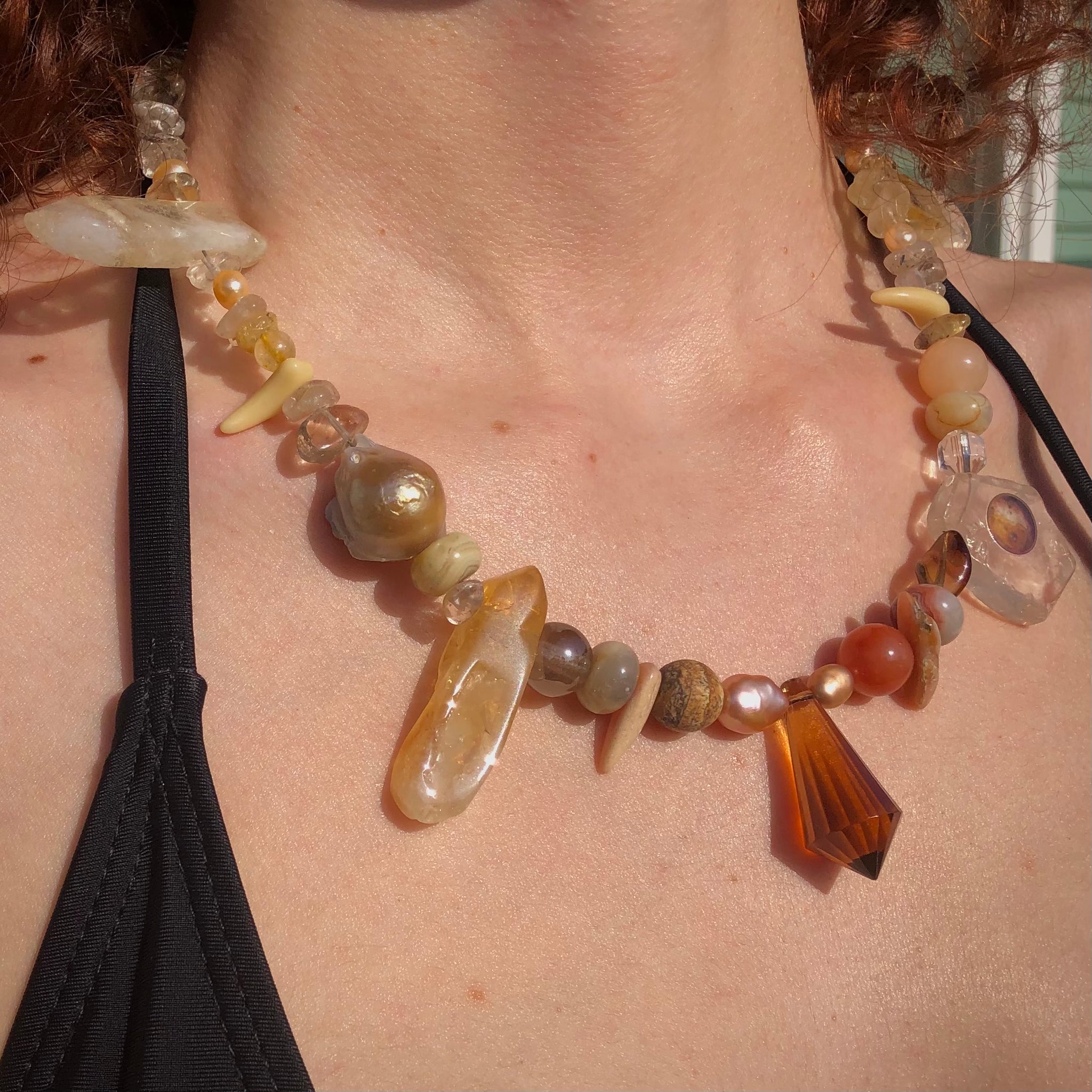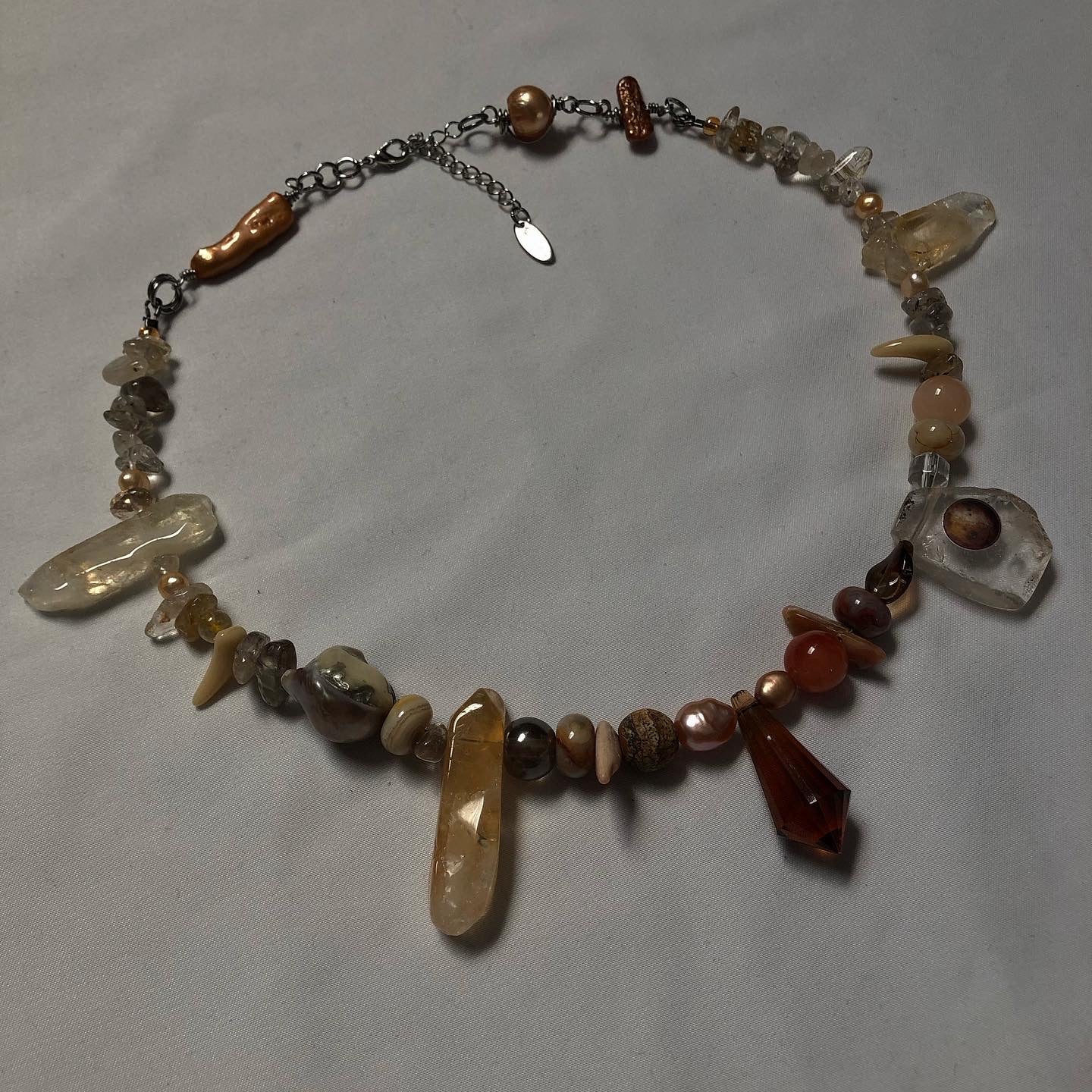 Made with: Golden Rutilated Quartz, Freshwater pearls, citrine, Clear quartz with resined venus sticker, agate, claws, czech glass, peach agate, antique glass and sterling silver components.