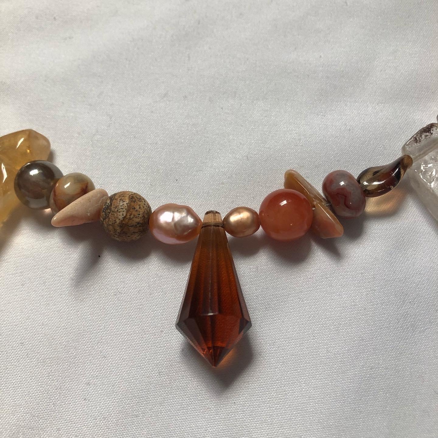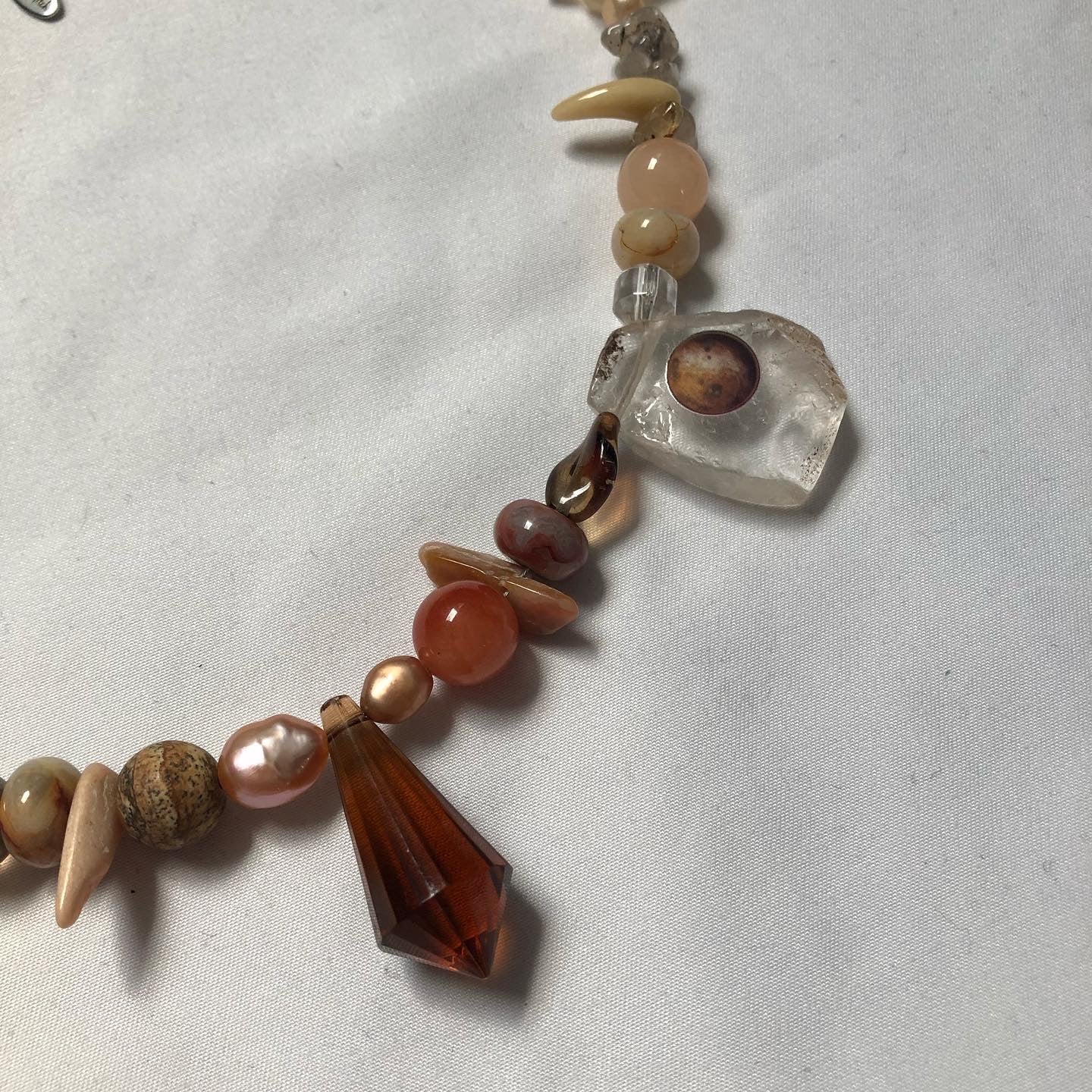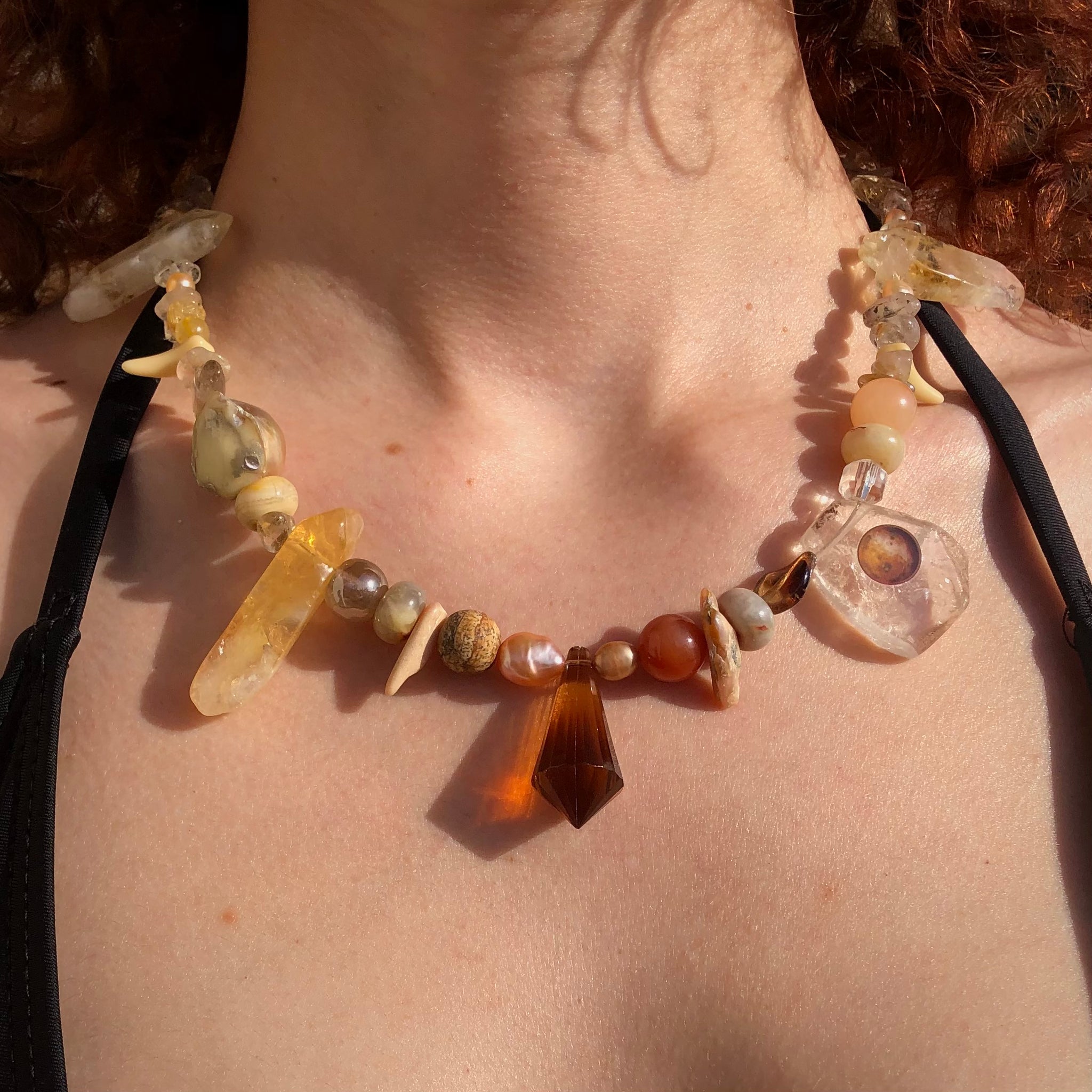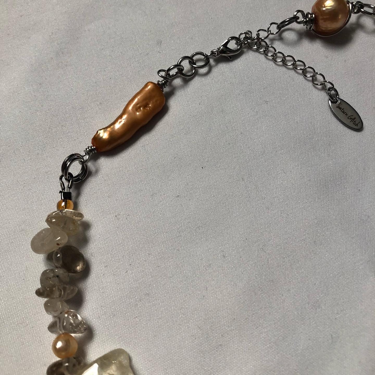 Made with: Golden Rutilated Quartz, Freshwater pearls, citrine, Clear quartz with resined venus sticker, agate, claws, czech glass, peach agate, antique glass and sterling silver components.