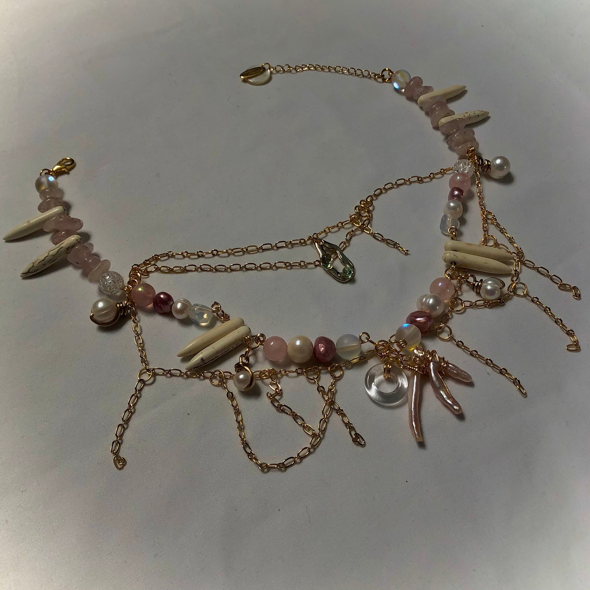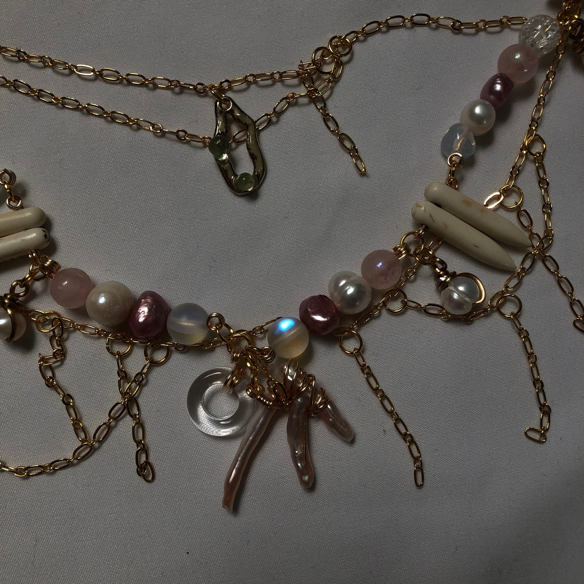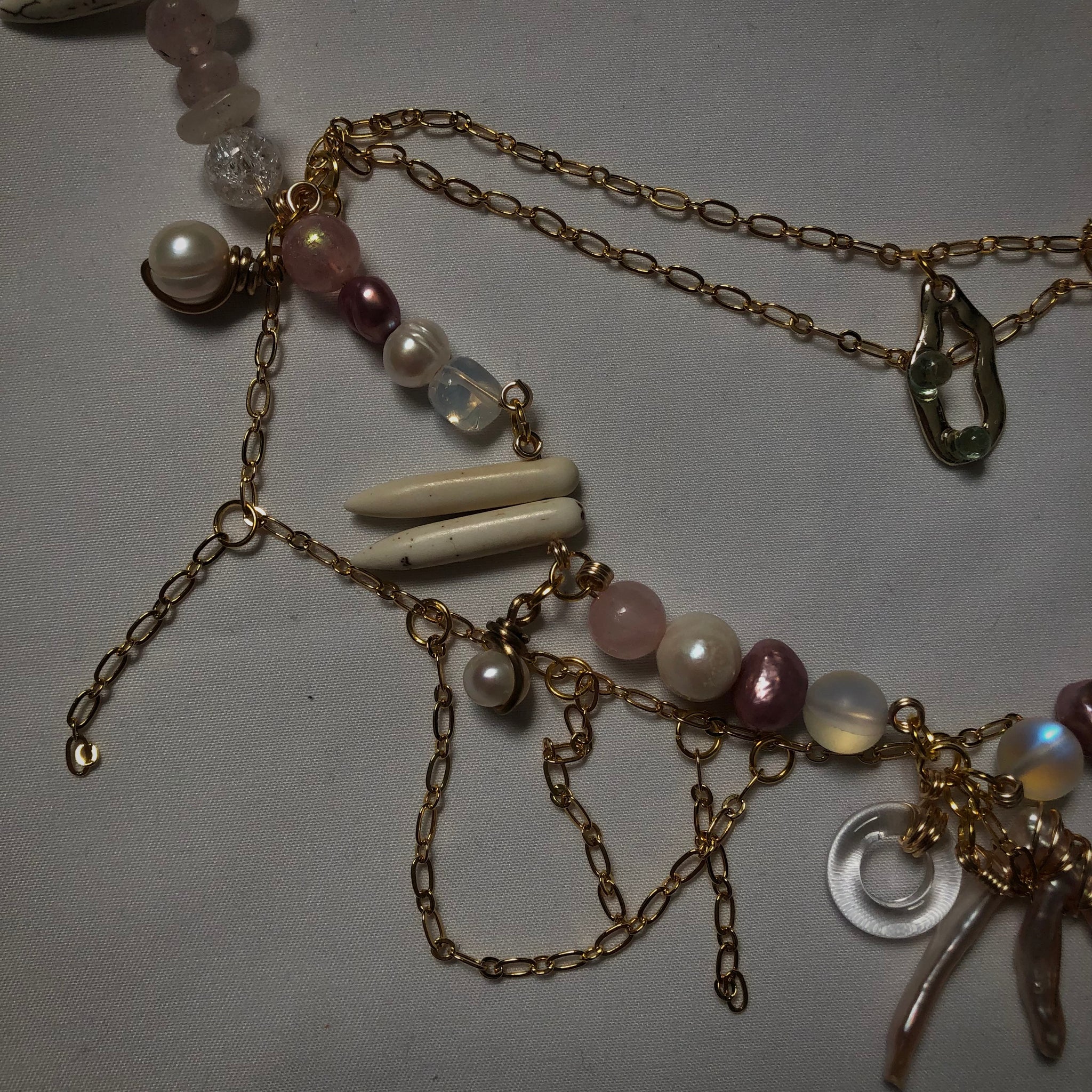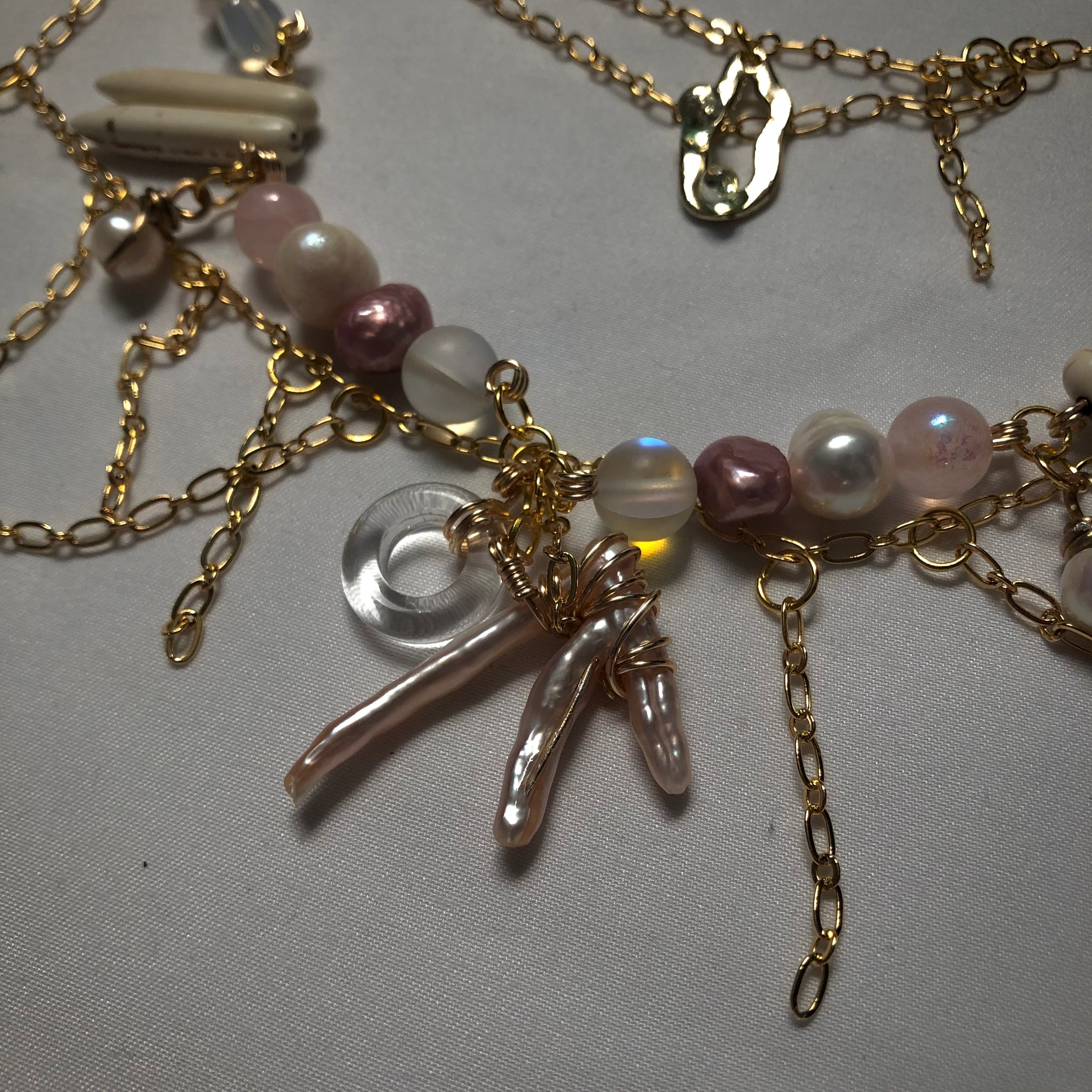 Made with: Freshwater pearls, clear glass hoop, resined gold designed hoop, 24k gold chain, opal, clear quartz, rose quartz and howlite