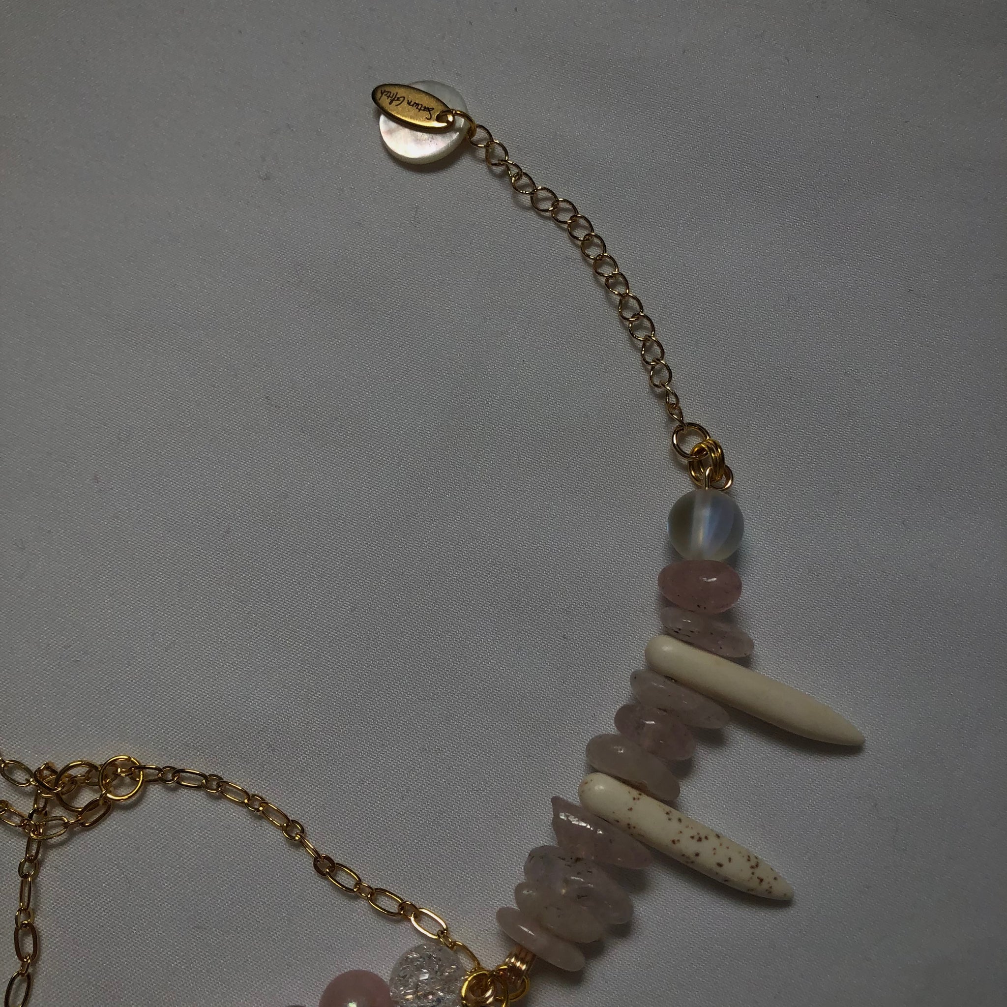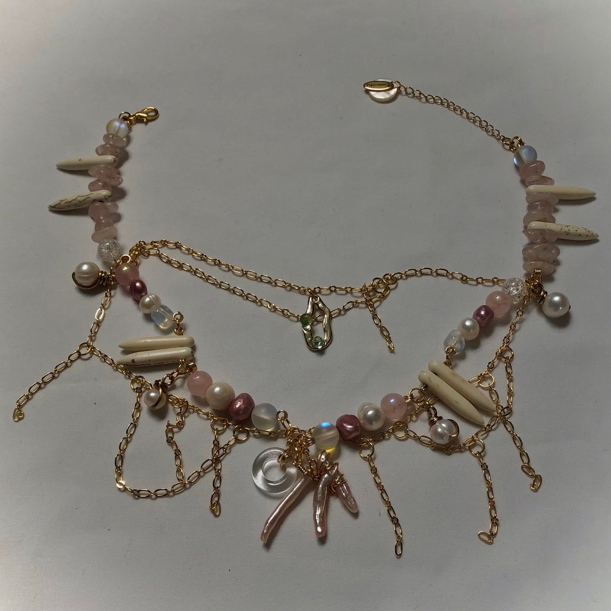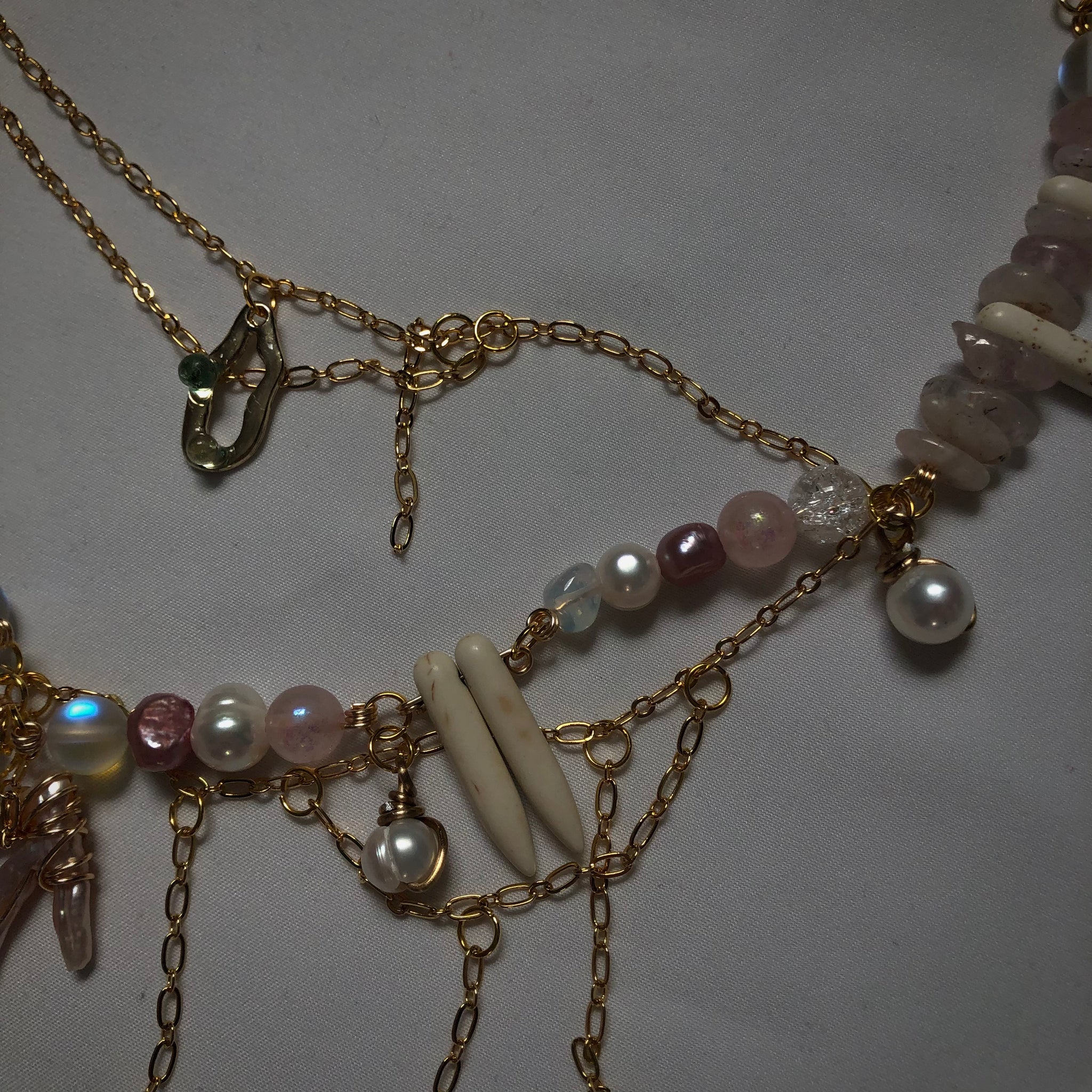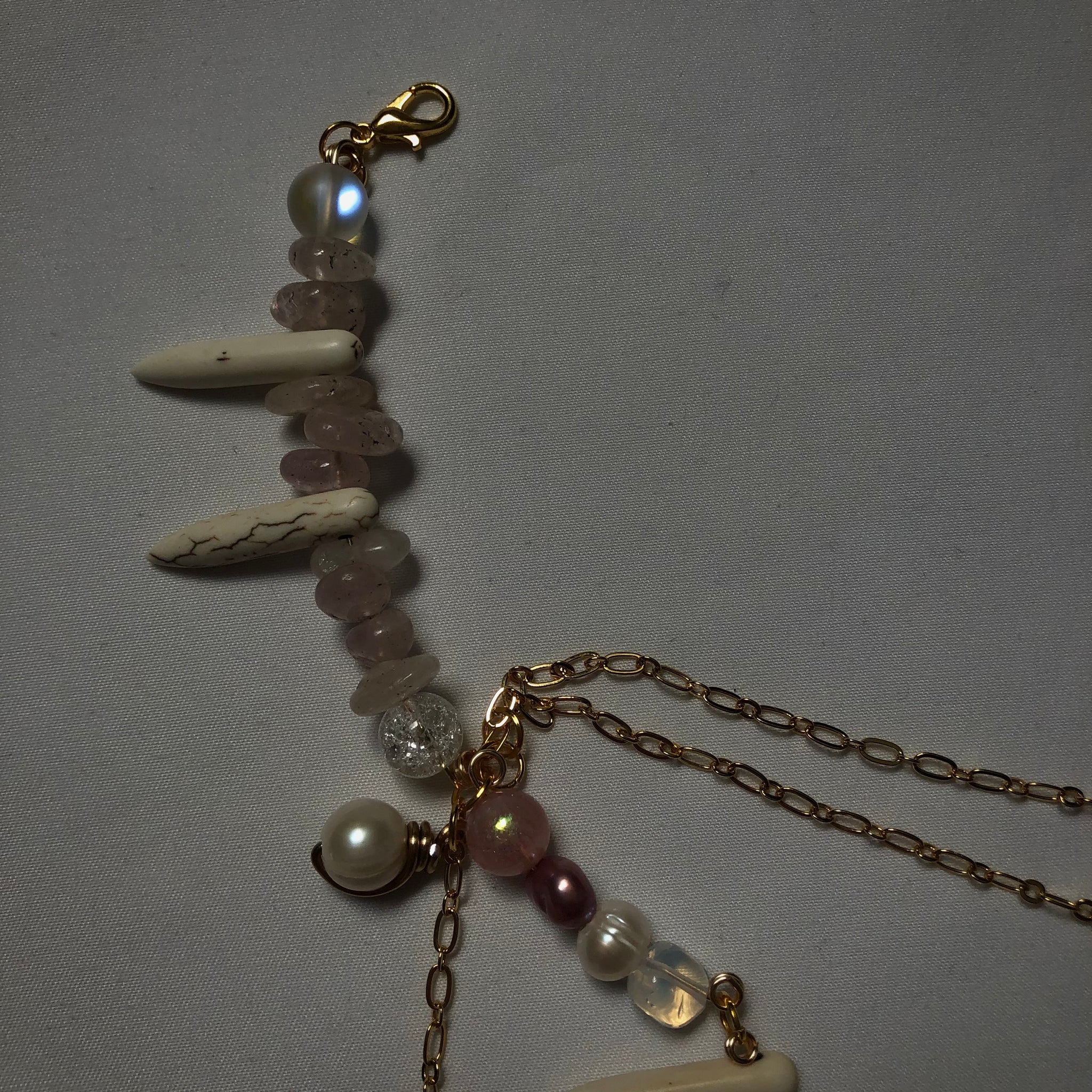 Made with: Freshwater pearls, clear glass hoop, resined gold designed hoop, 24k gold chain, opal, clear quartz, rose quartz and howlite
