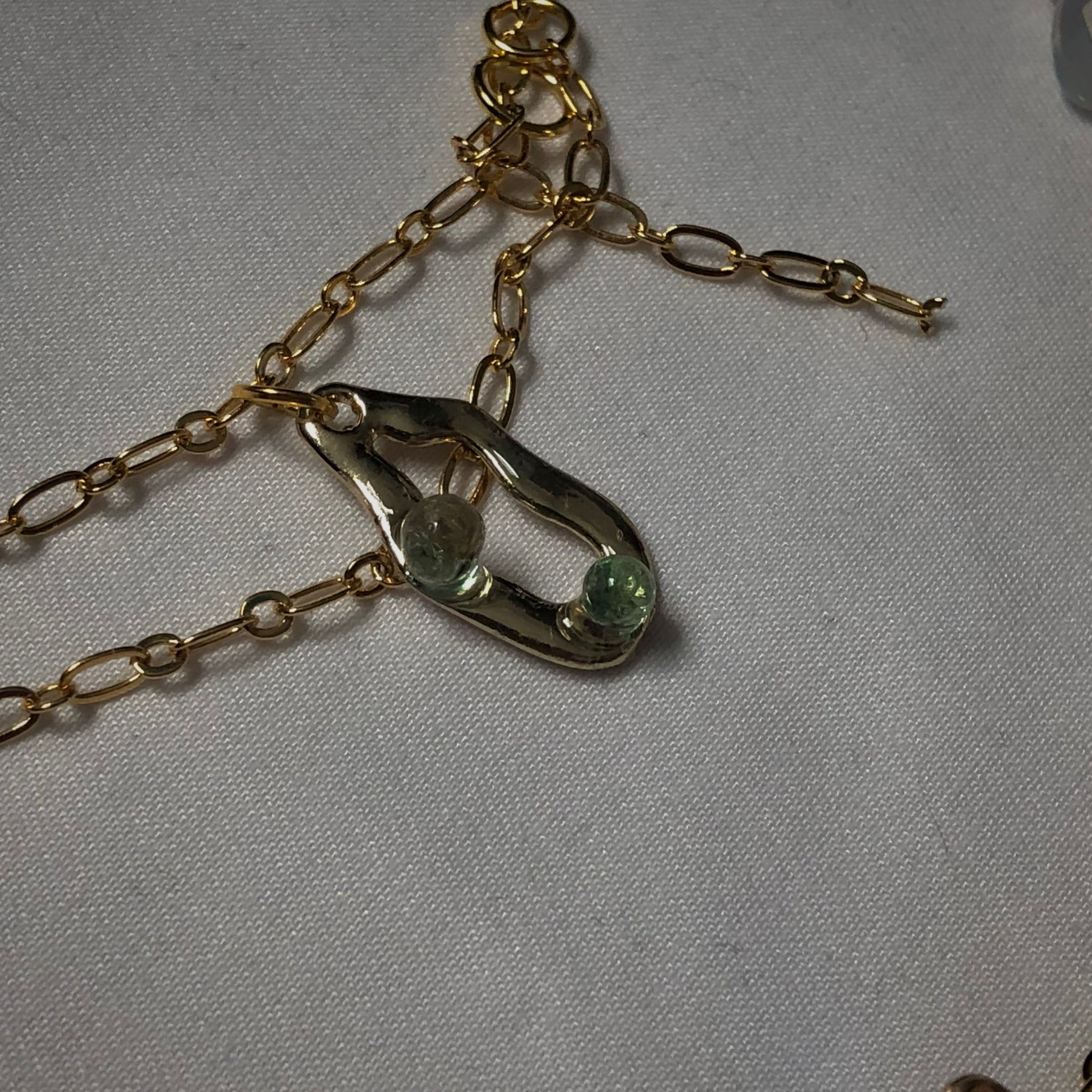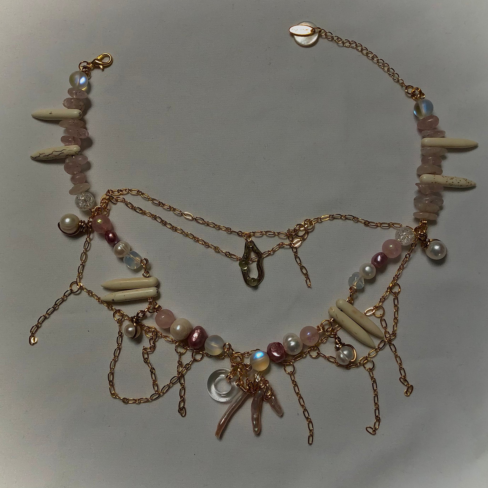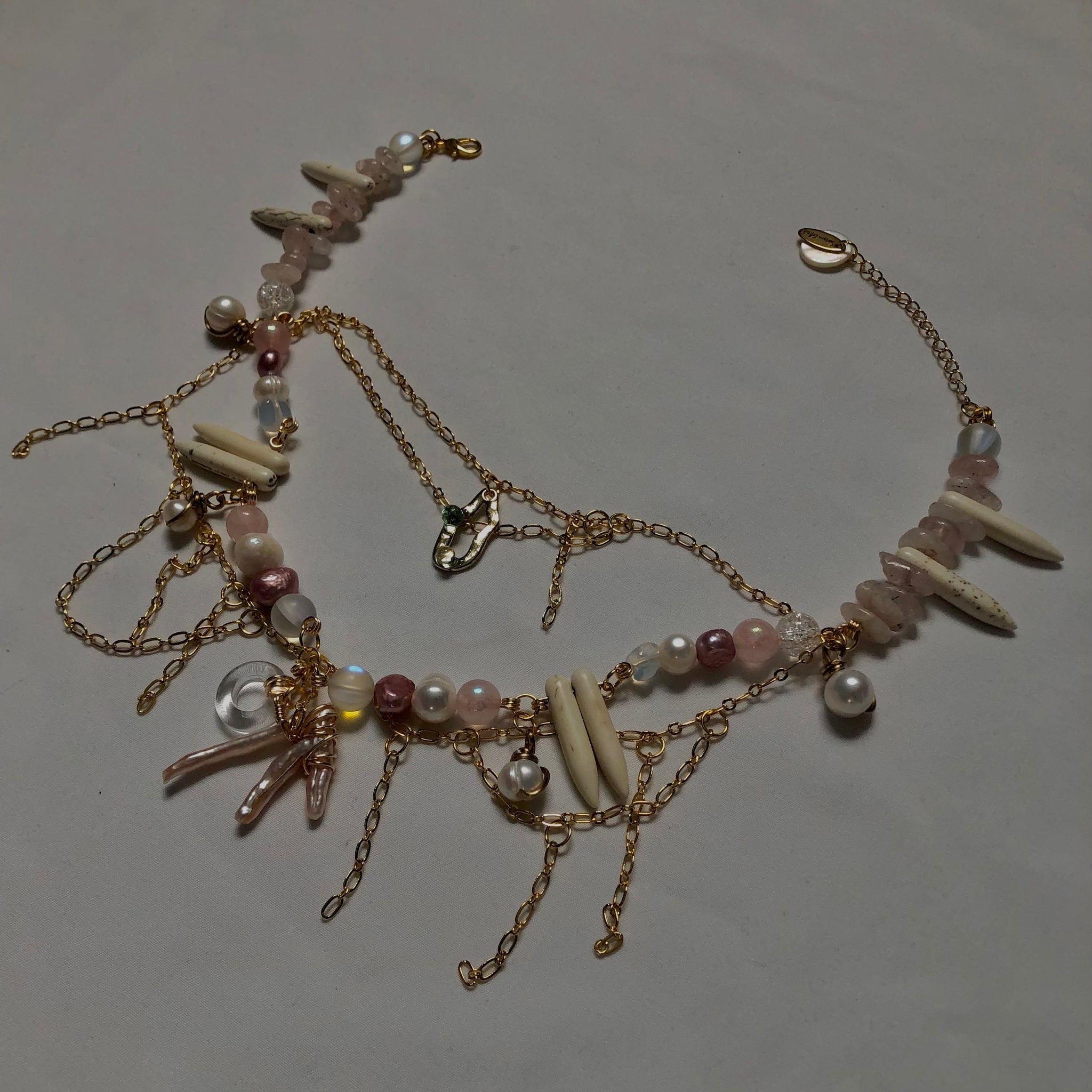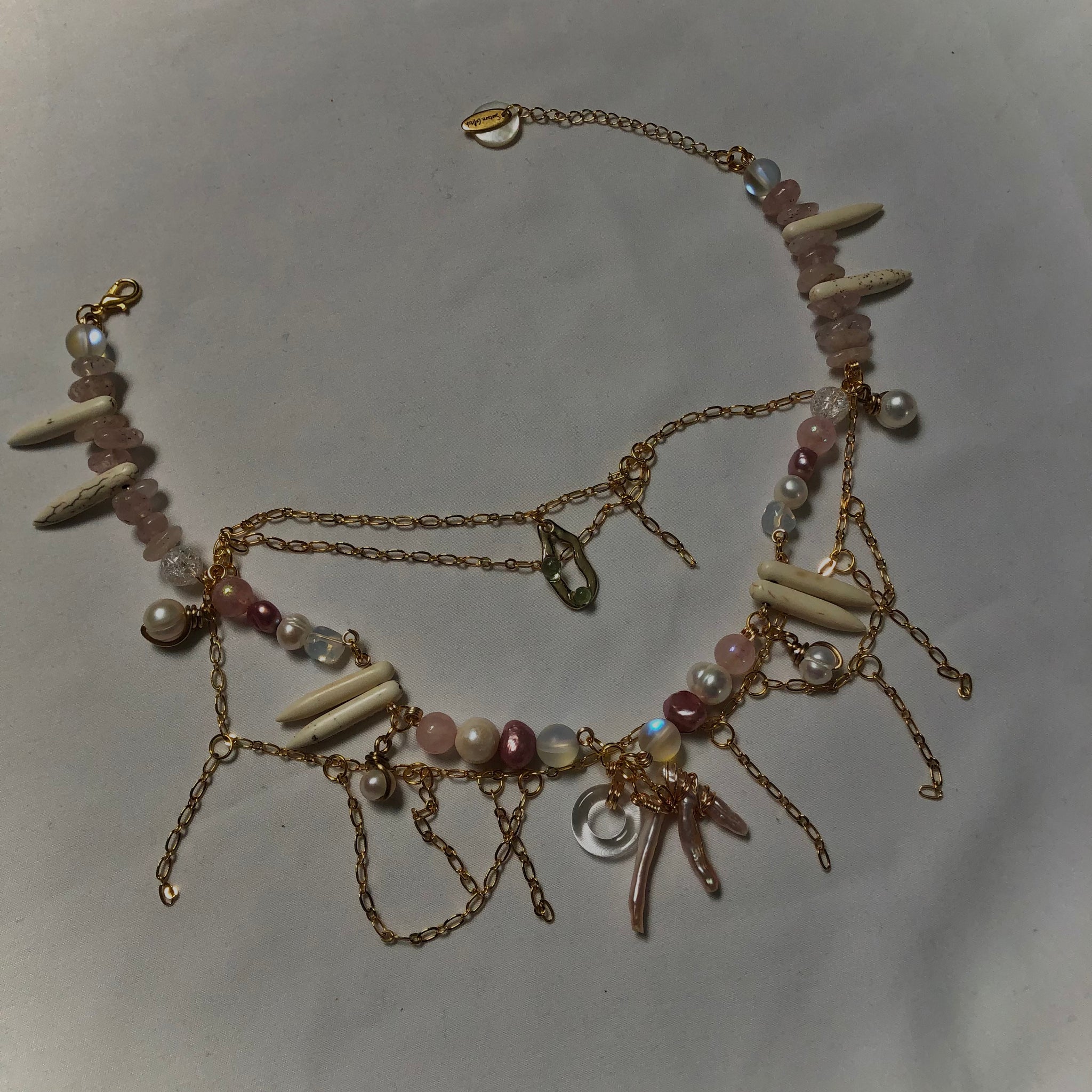 Made with: Freshwater pearls, clear glass hoop, resined gold designed hoop, 24k gold chain, opal, clear quartz, rose quartz and howlite