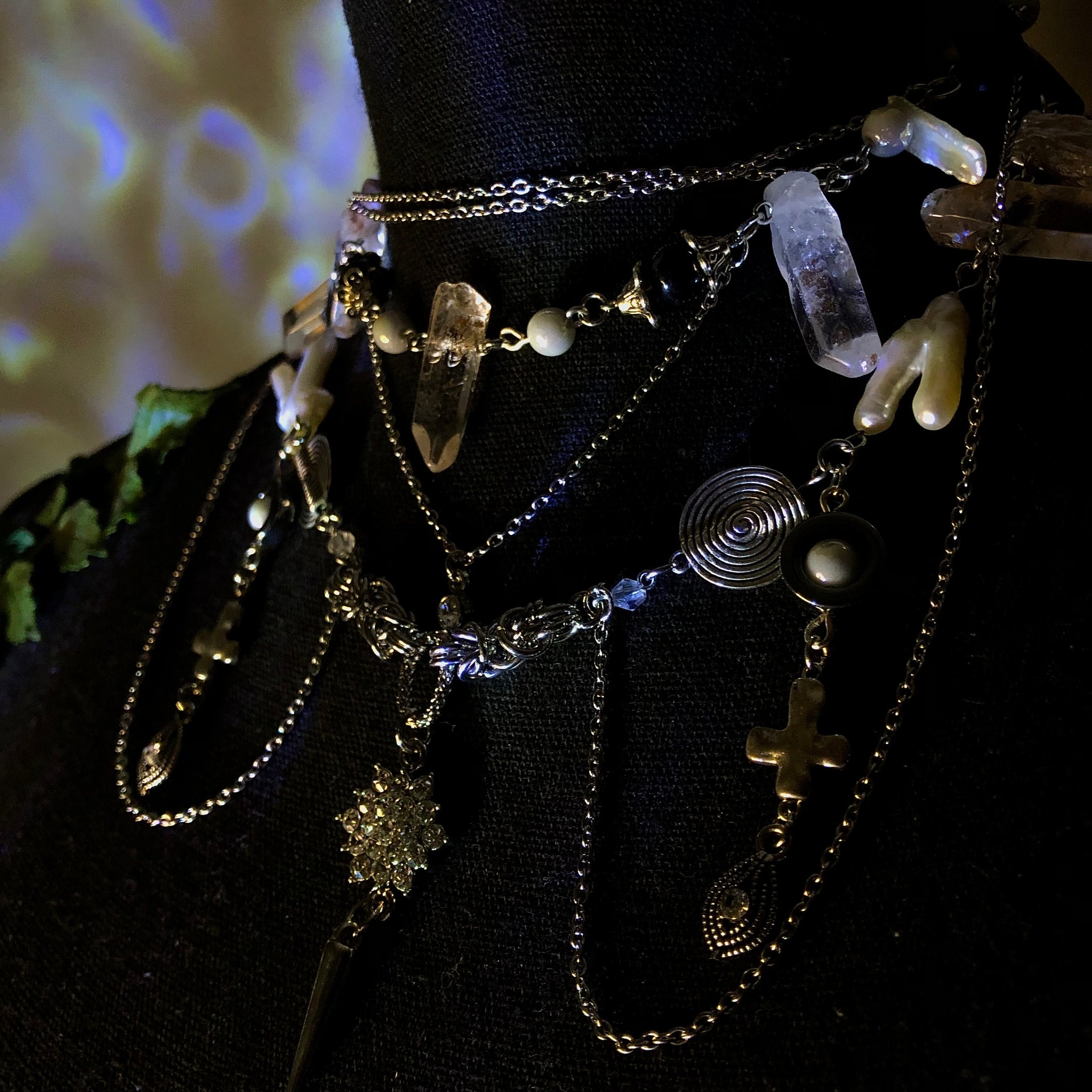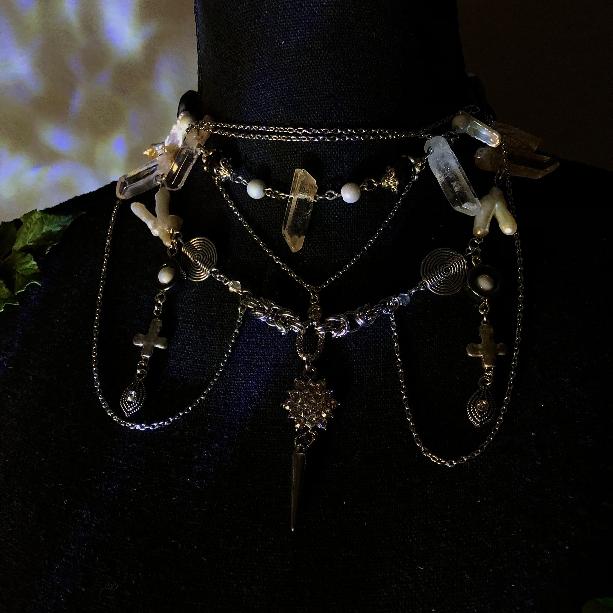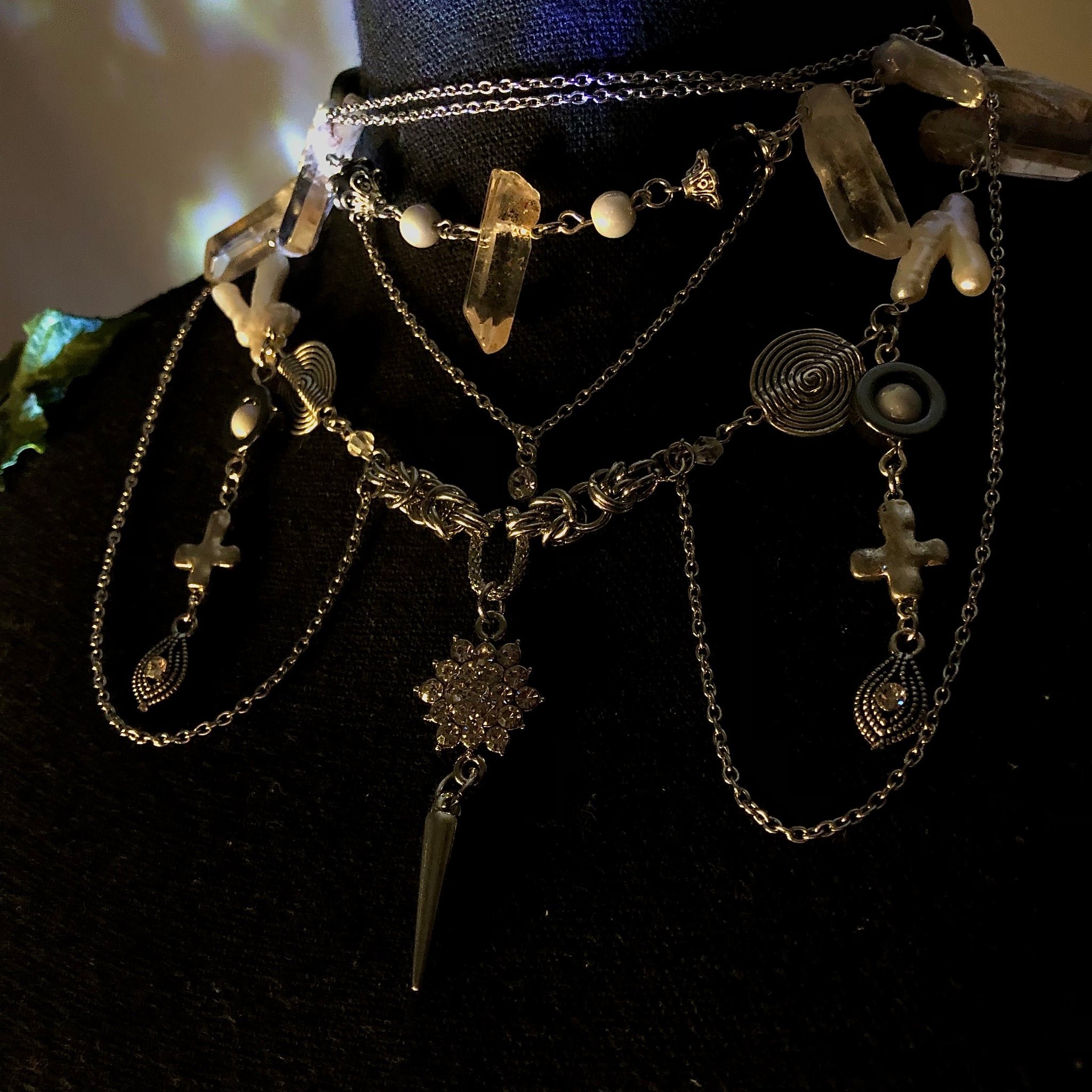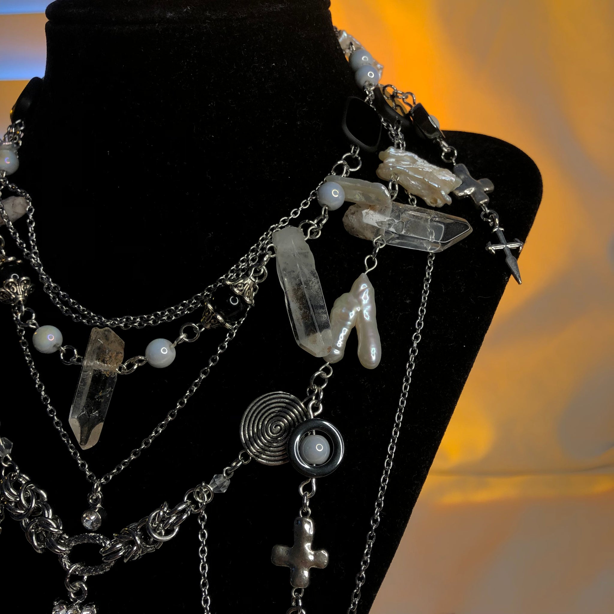 Stainless Steel Chains made with AAAA Chicken Pearl Feet beads, White Mother of Pearls, White Biwa Pearls, Spirals, and Amphibole Angel Phantom Quartz.