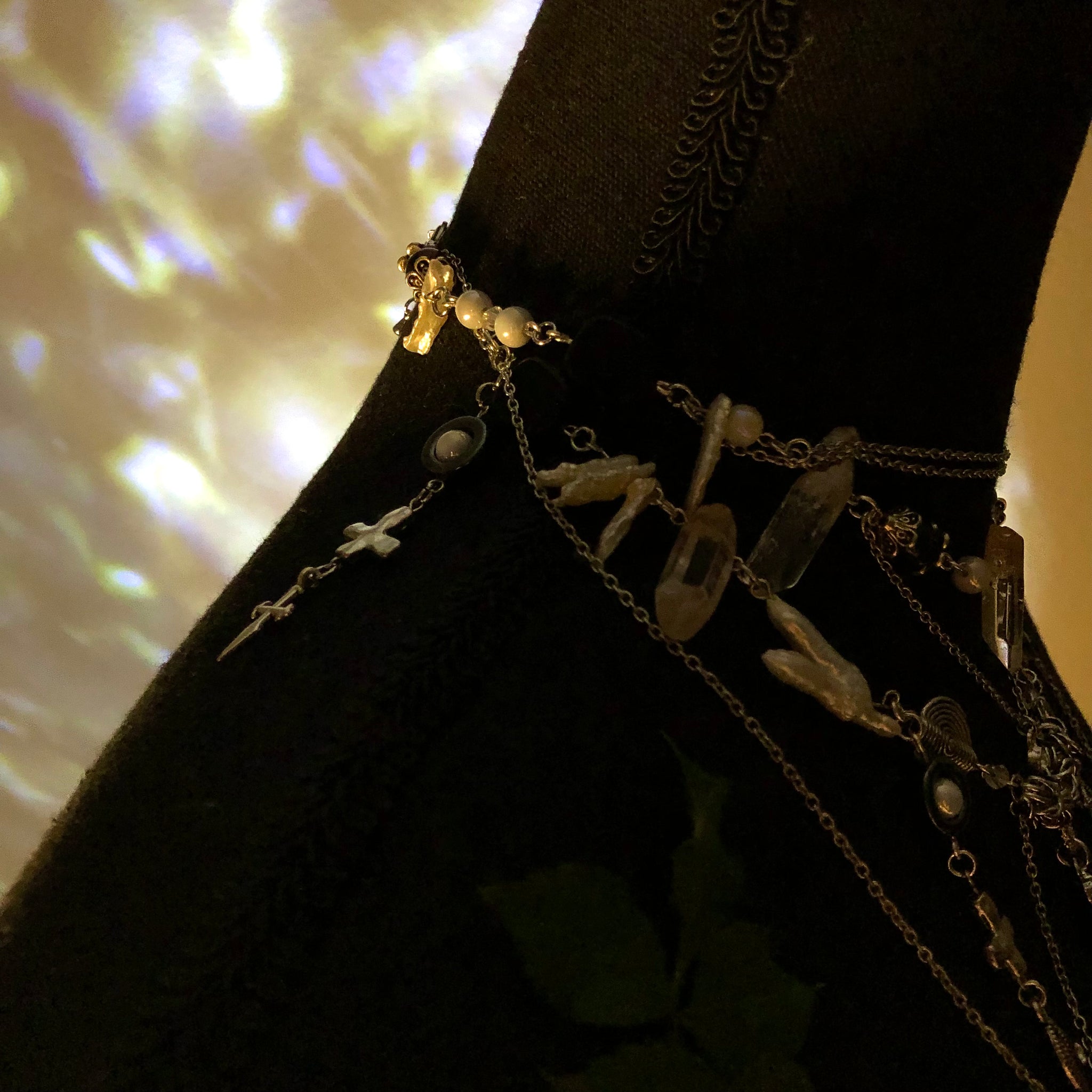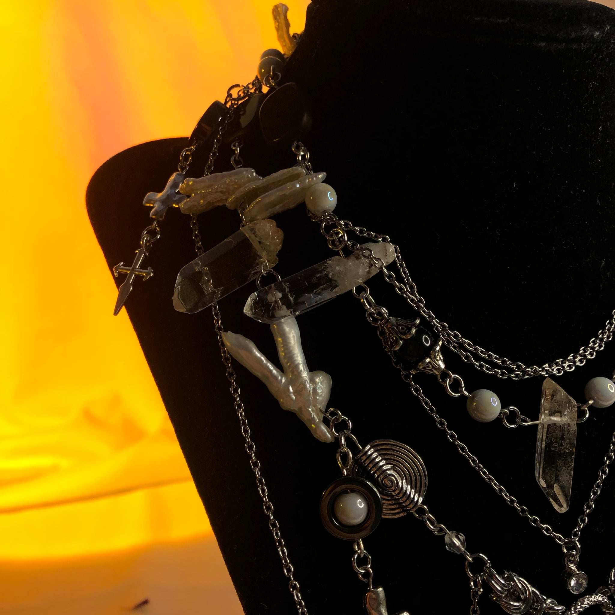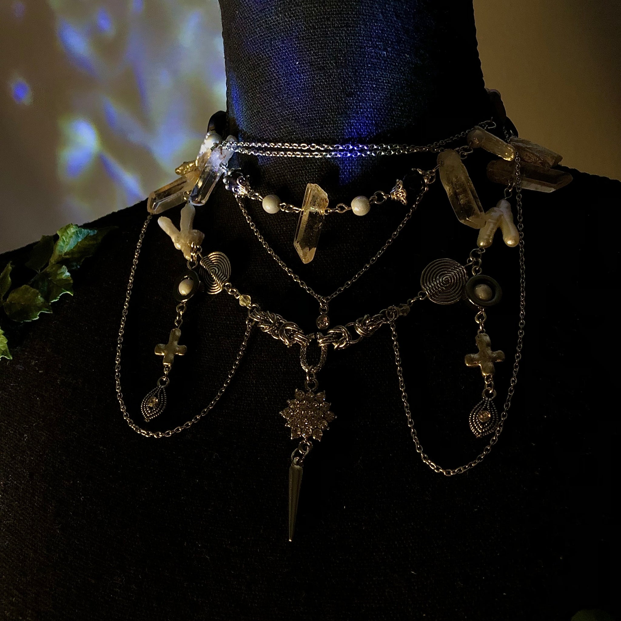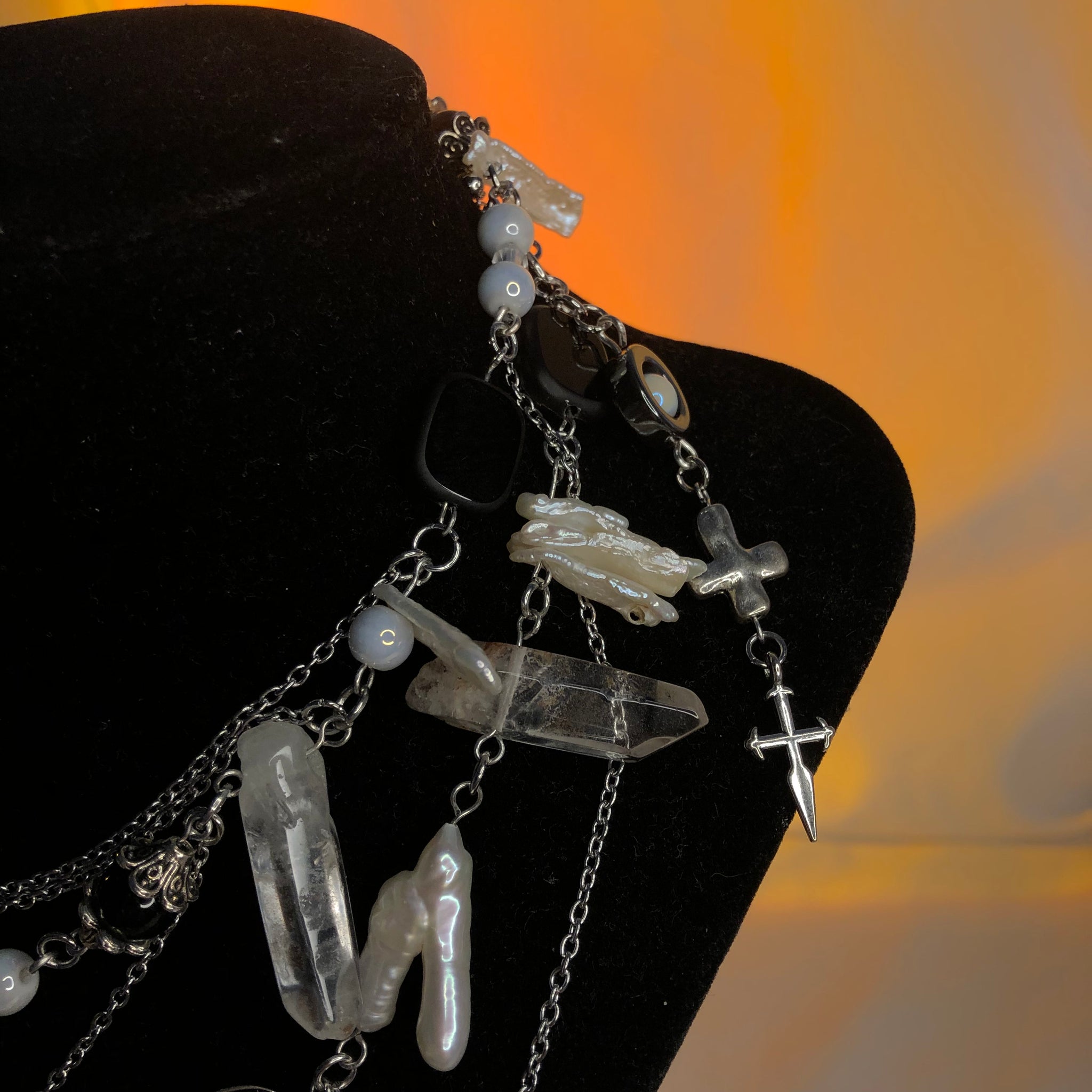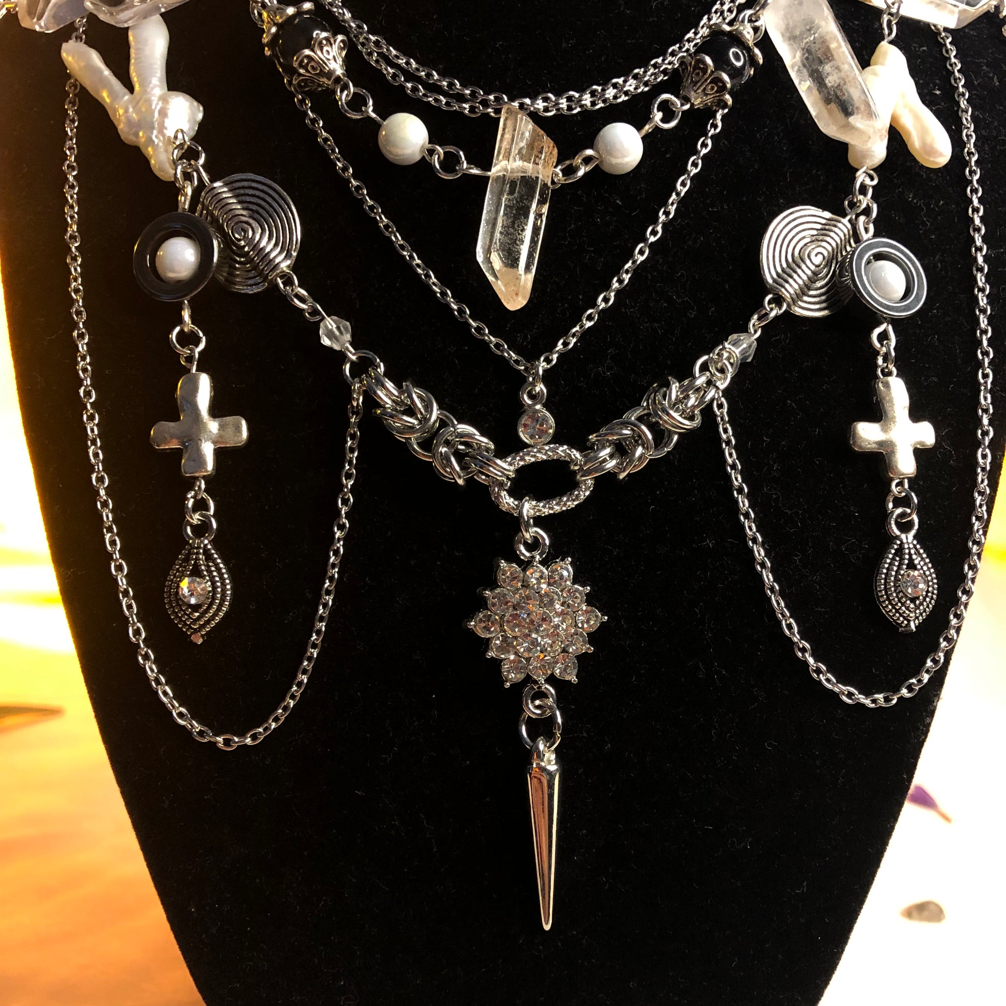 Stainless Steel Chains made with AAAA Chicken Pearl Feet beads, White Mother of Pearls, White Biwa Pearls, Spirals, and Amphibole Angel Phantom Quartz.